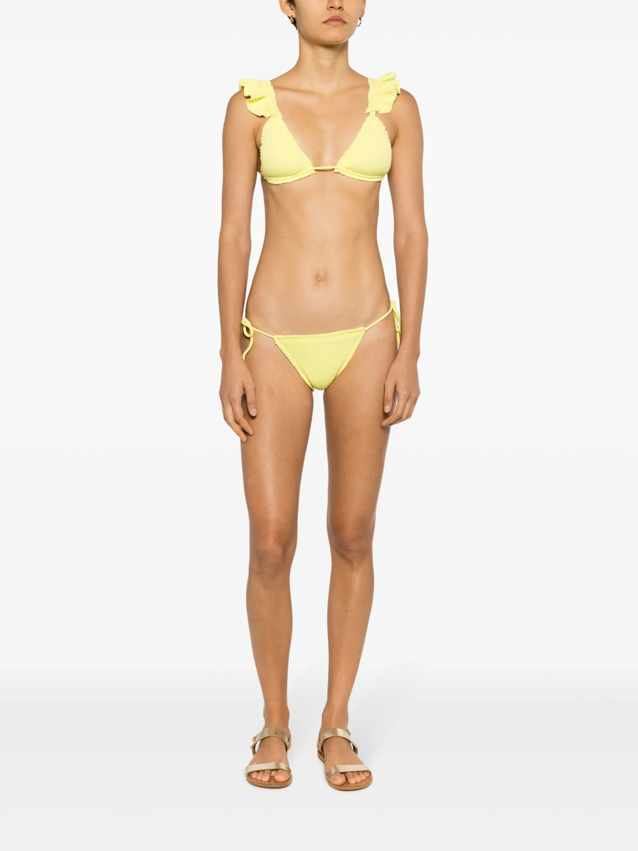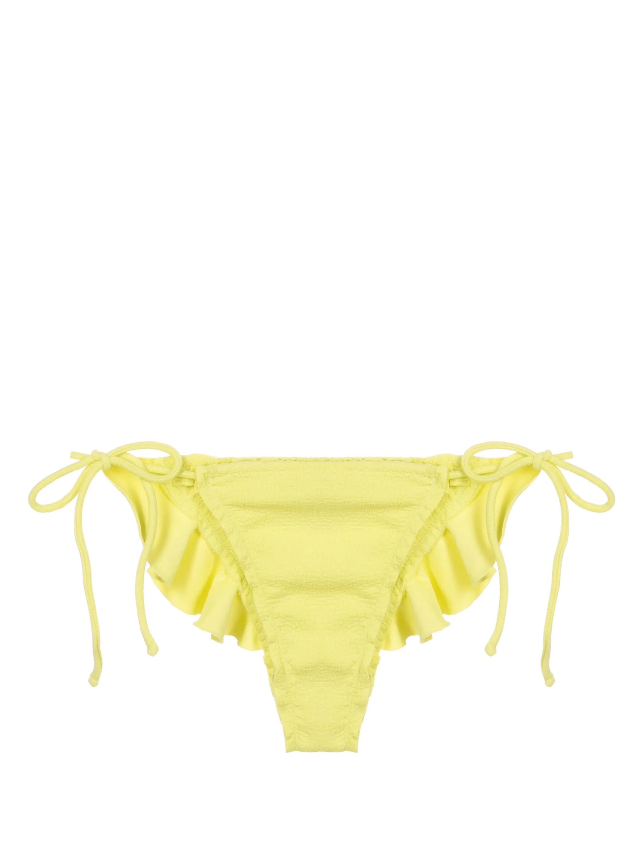 Лимонный, эластичный материал, средняя посадка, плавки бикини с завязками по бокам, подол с оборками и регулируемый дизайн.