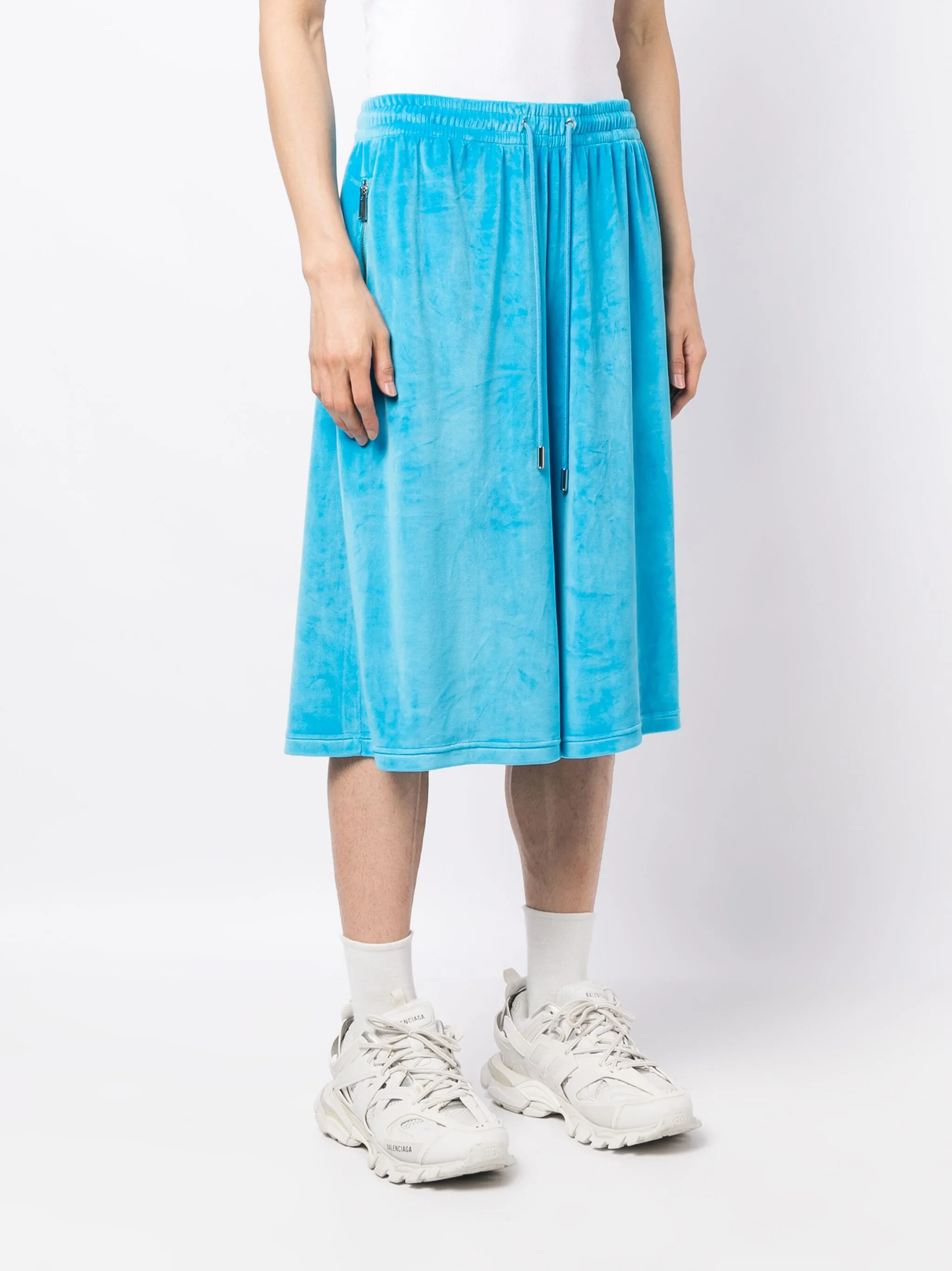 Голубой, матовый эффект, лакированное покрытие, жатый эффект, кулиска на талии, широкий крой, два кармана на молнии по бокам, два накладных кармана сзади и длина ниже колена. Это унисекс-модель. Обратите внимание, что для нее используется мужская размерная сетка.