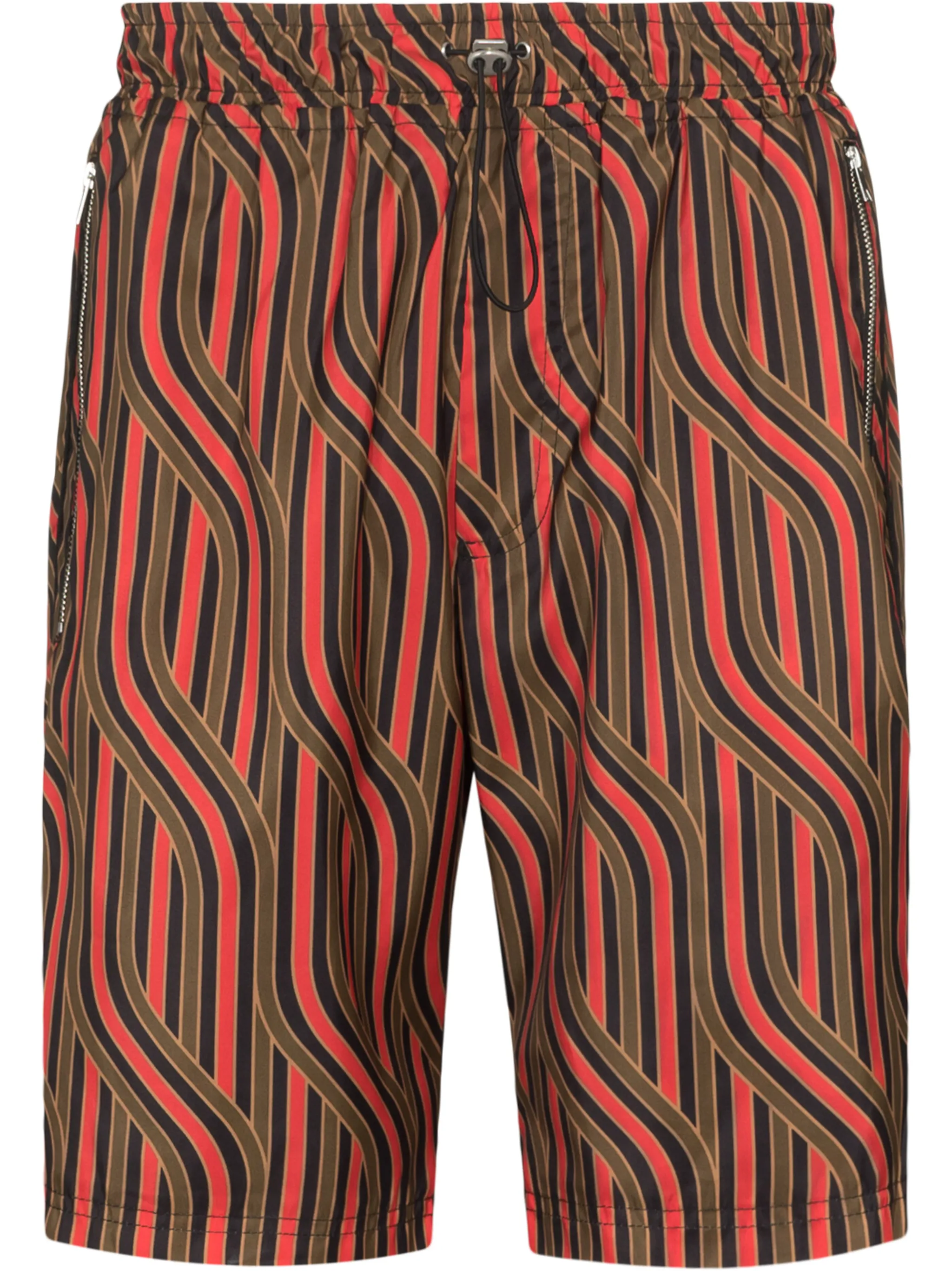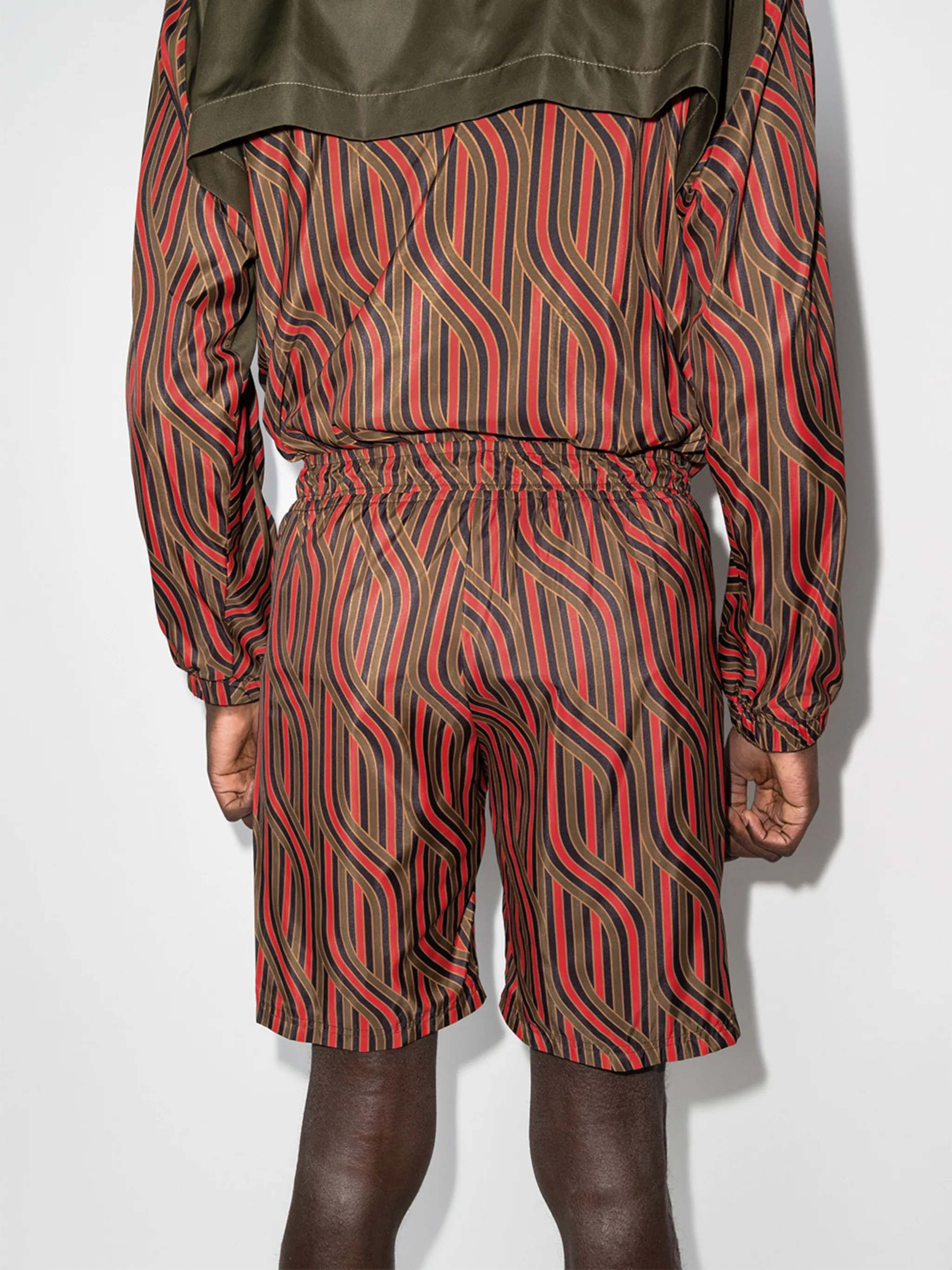 Ярко-красный, хаки, черный, переработанный полиэстер, сплошной графичный принт, кулиска на талии и длина по колено.