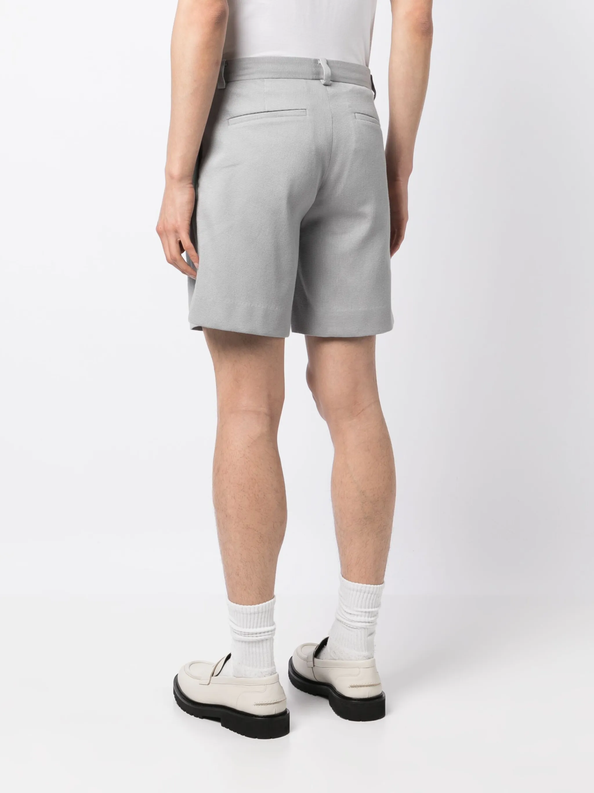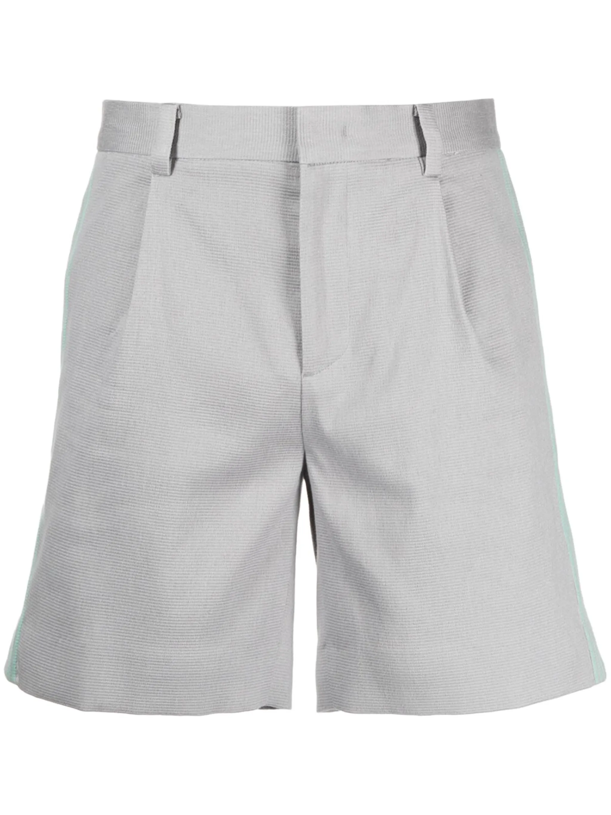 Светло-серый, смесовый хлопок, полоска сбоку, потайная застежка спереди, петли для ремня, два прорезных кармана по бокам, два кармана с листочкой сзади и длина выше колена.