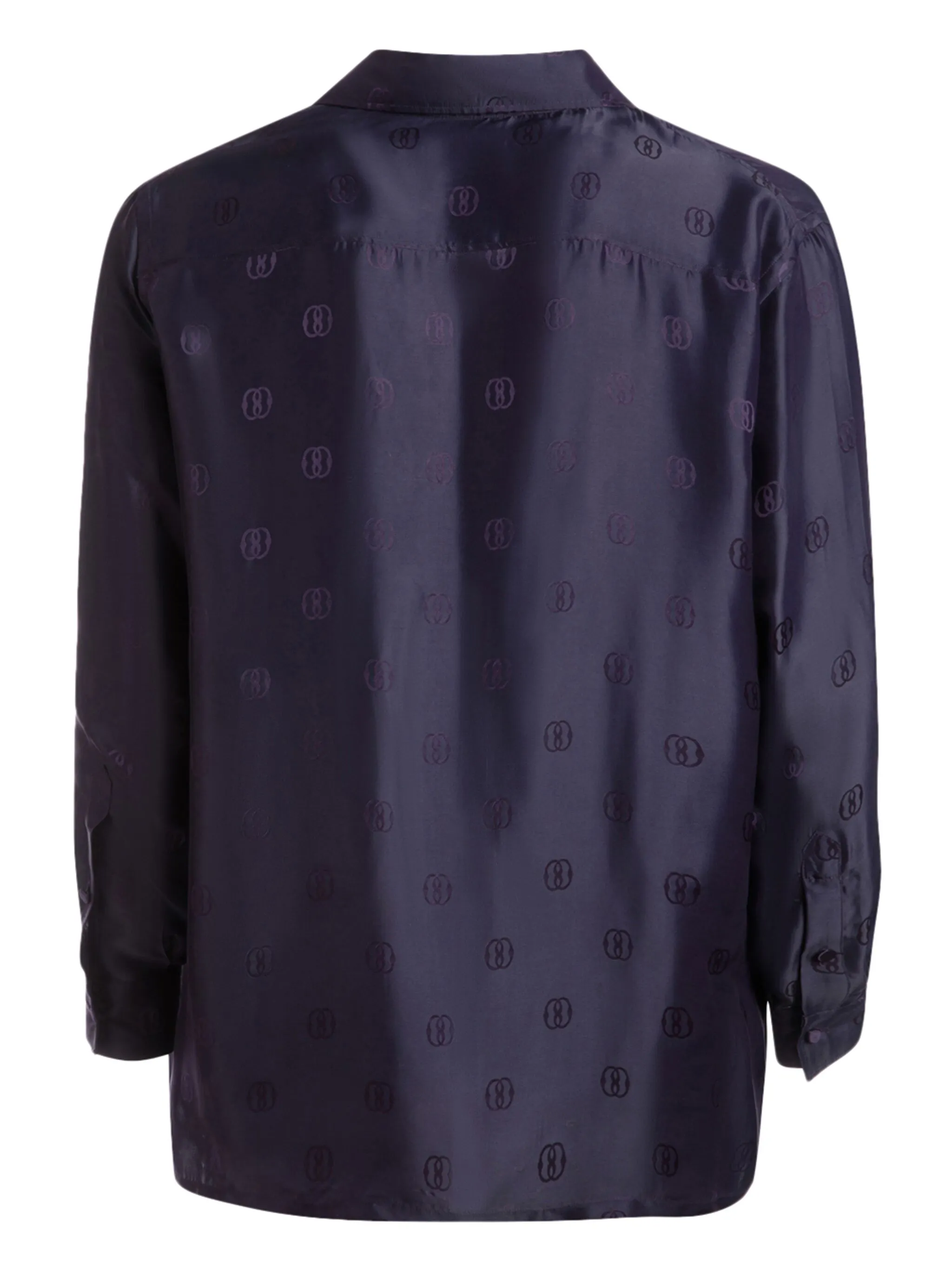 Темно-фиолетовый, шелк, сплошной принт с логотипом, зазубренный воротник, застежка на пуговицах спереди, длинные рукава, манжеты на пуговицах, нагрудный накладной карман и прямой подол.