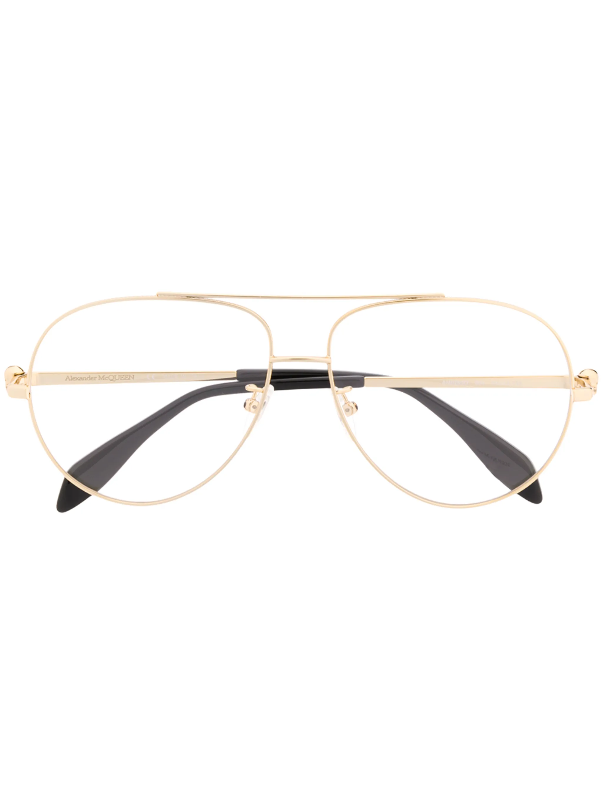 Очки-авиаторы Skull от Alexander McQueen Eyewear. Nose pads, логотип на дужке и прямые дужки с остро изогнутыми концами. Прилагается защитный чехол.