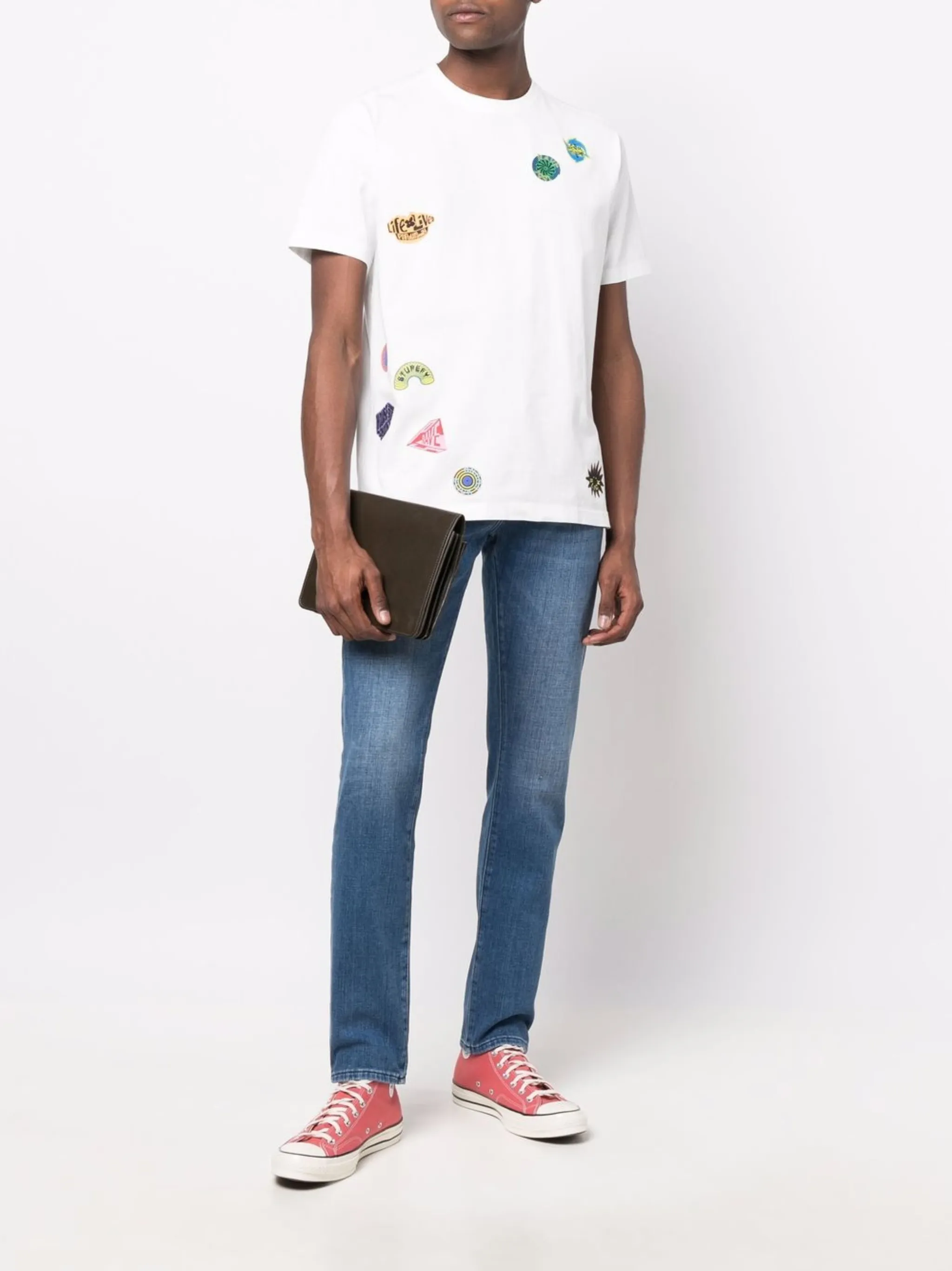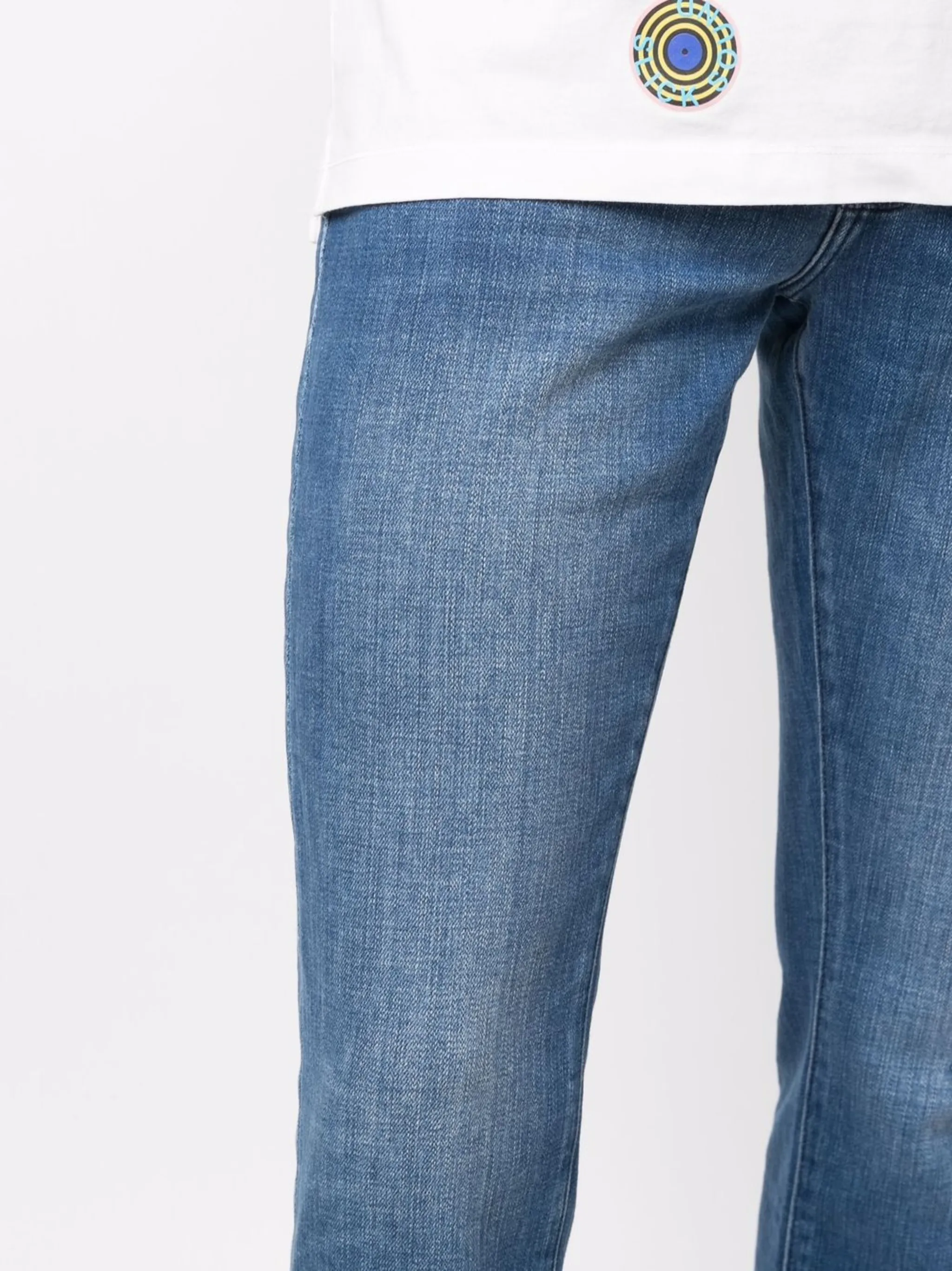 Застежка на молнии и пуговице спереди, классическая пятикарманная модель, петли для ремня, нашивка с логотипом сзади, эффект потертости, узкий крой и прямой подол.