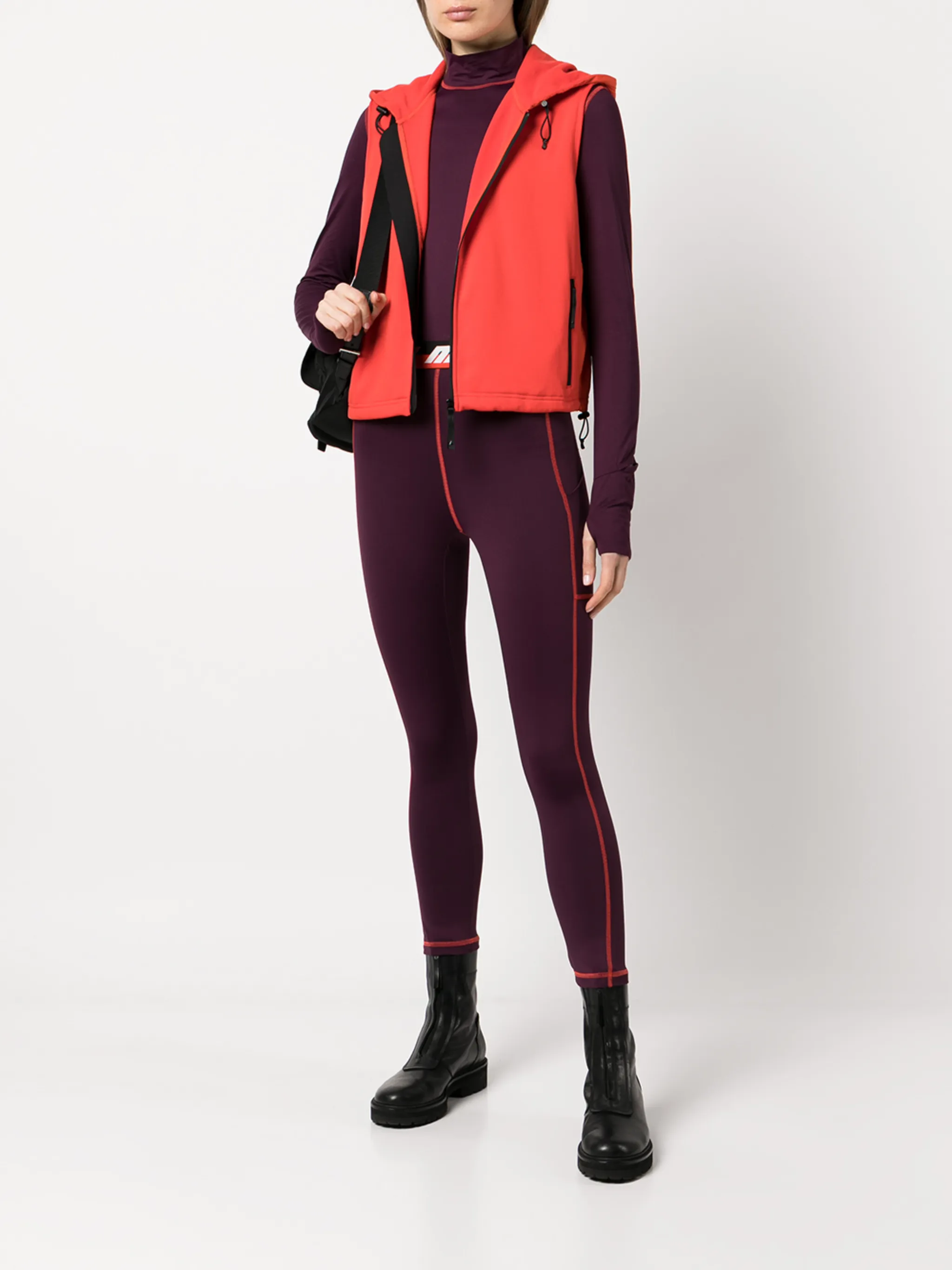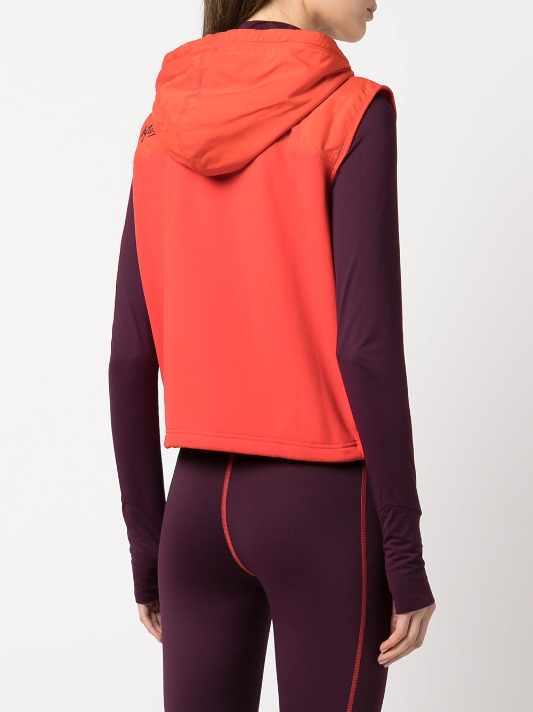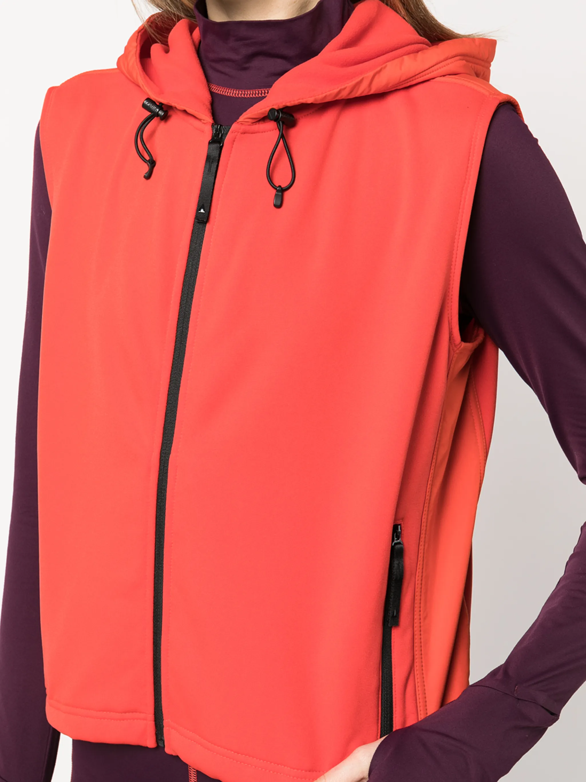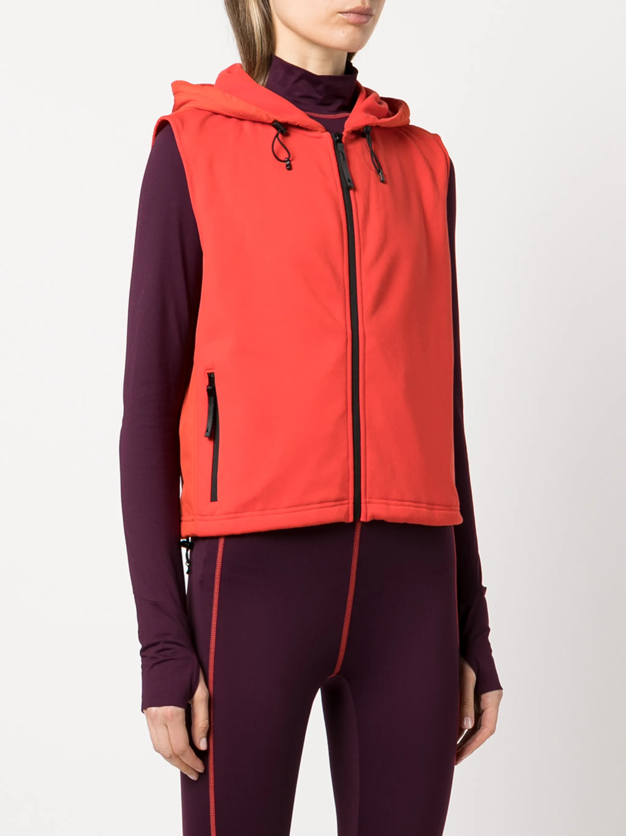 Два кармана на молнии по бокам, застежка на молнии спереди, классический капюшон, без рукавов, прямой подол и эластичная модель. Цвет: красный.