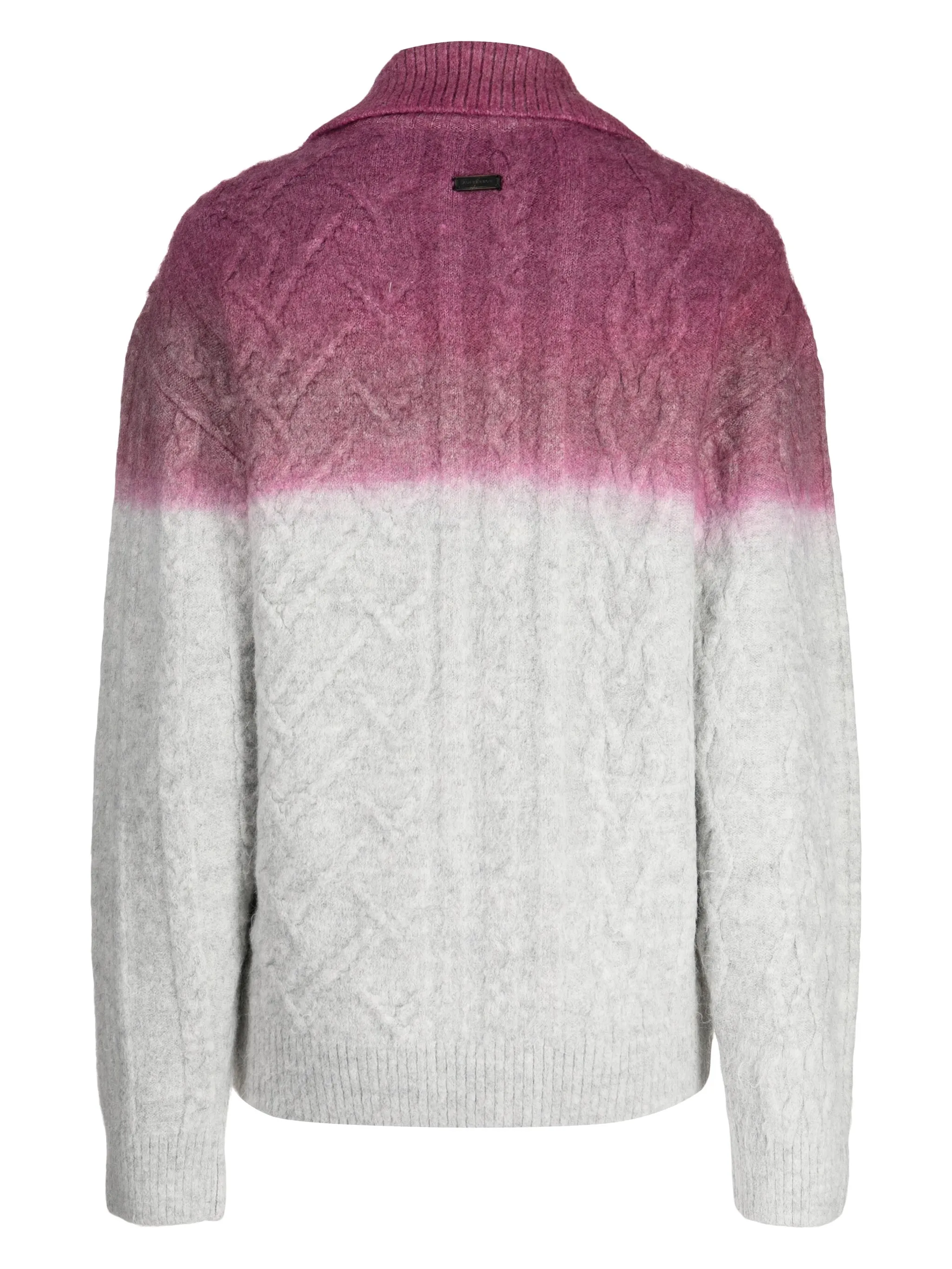 Светло-серый, фиолетовый, фактурная вязка, градиентный эффект, металлический логотип, воротник поло, приспущенные плечи, длинные рукава, отделка в рубчик и прямой подол.