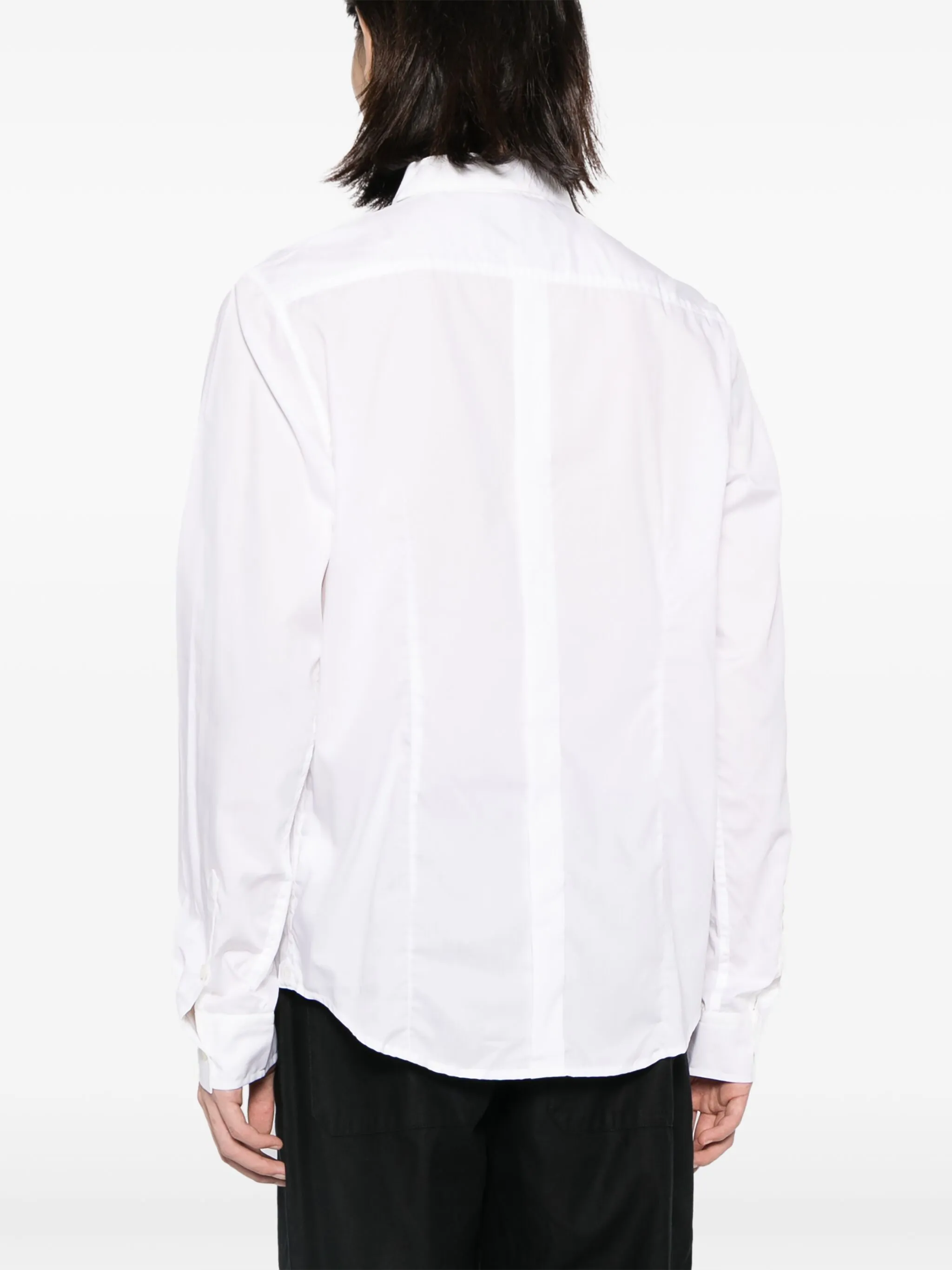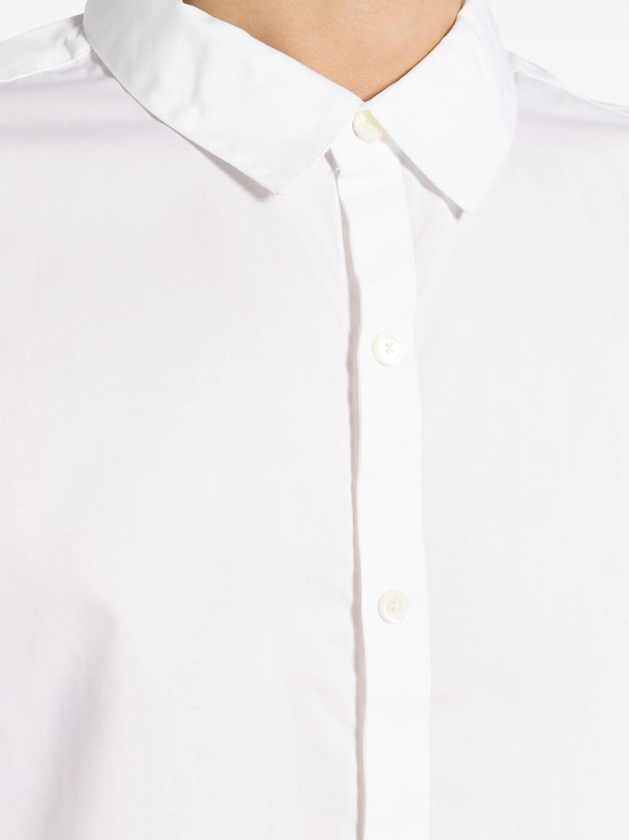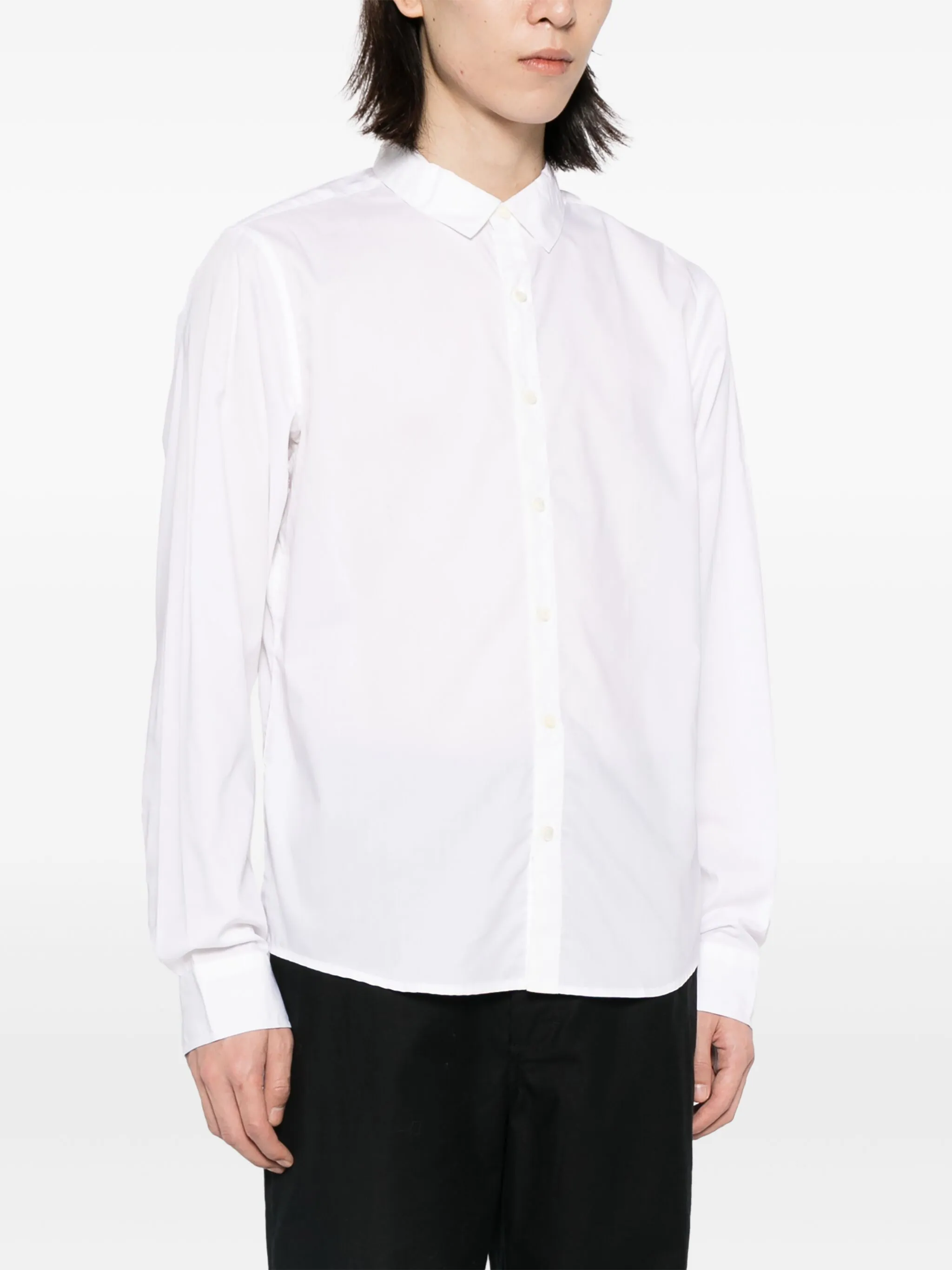 Белый, хлопок, классический воротник, застежка на пуговицах спереди, длинные рукава, манжеты на пуговицах и закругленный подол.