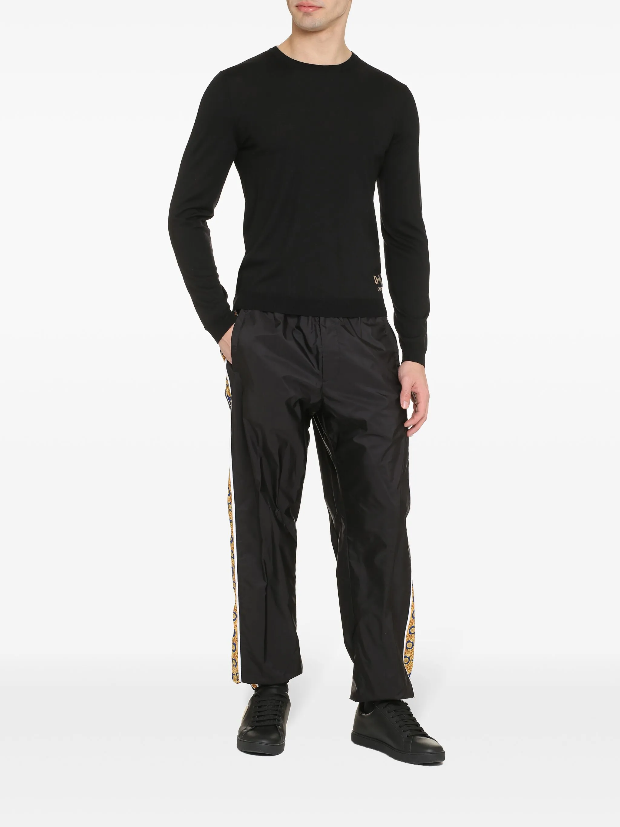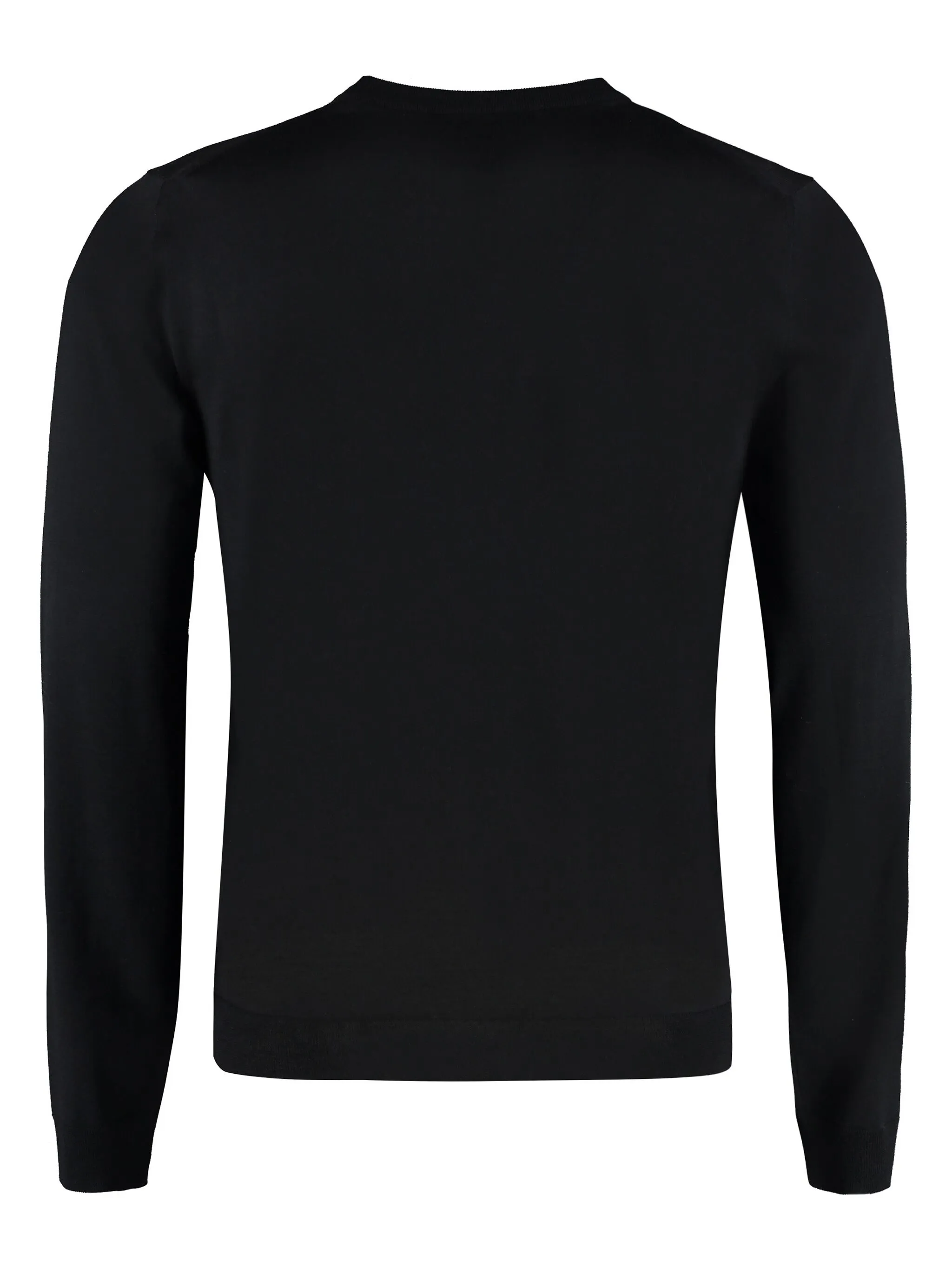 Черный, шерсть, тонкая вязка, вышитый логотип спереди, круглый вырез, длинные рукава и прямой подол.