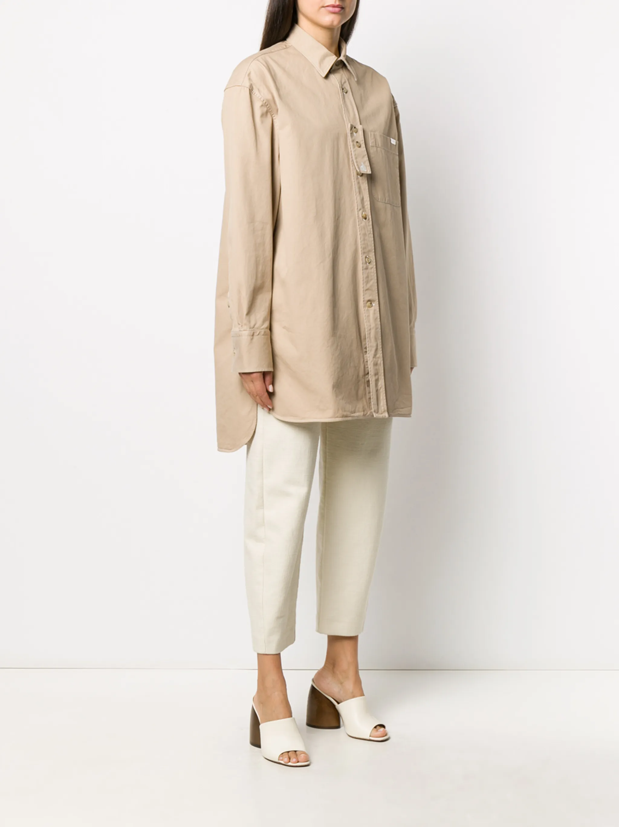 Классический воротник, планка на пуговицах спереди, длинные рукава, манжеты на пуговицах, нагрудный накладной карман, металлический логотип и неравномерный подол.