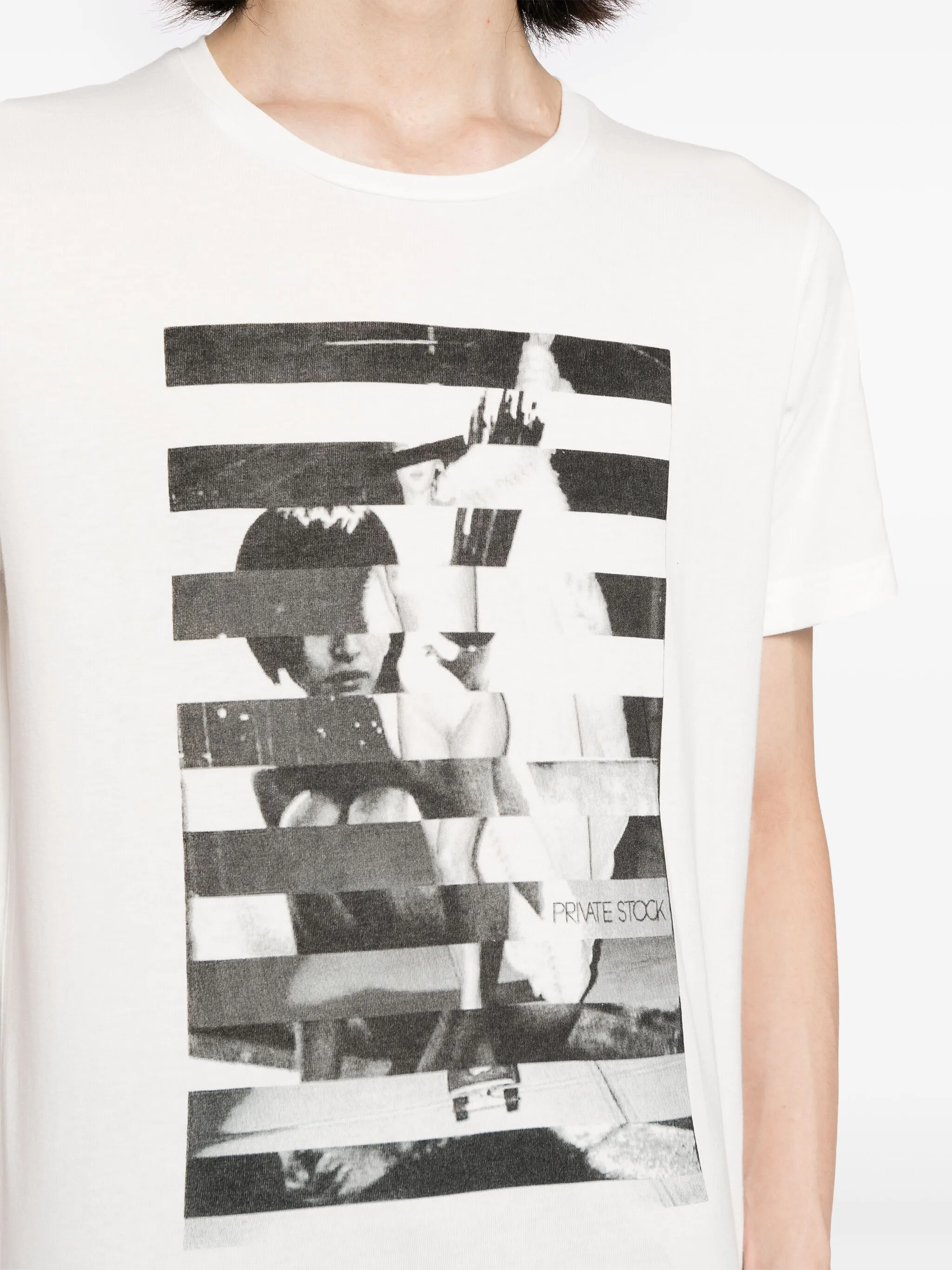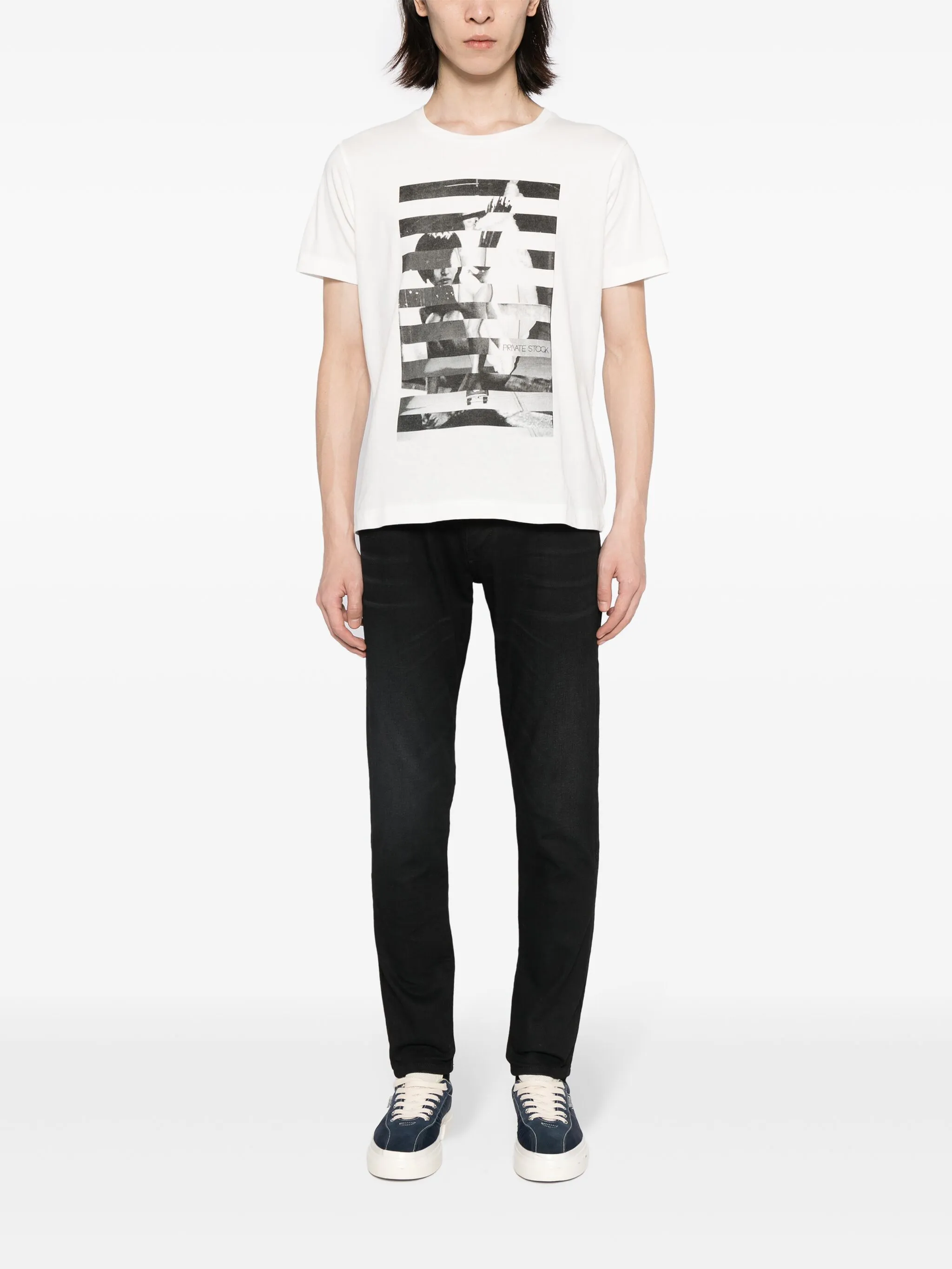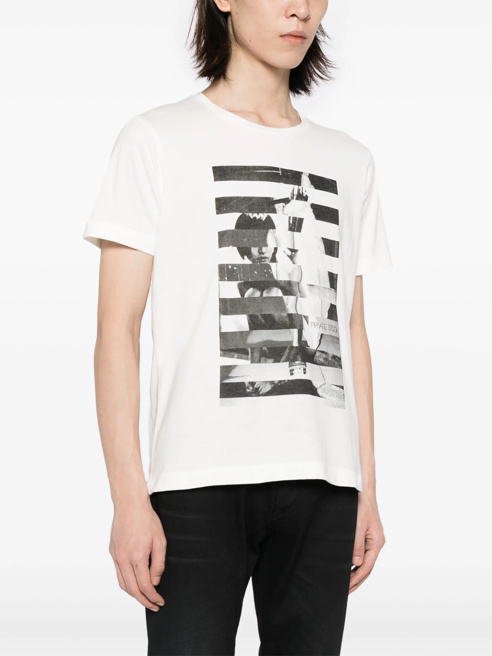 Белый, органический хлопок, фотопринт, логотип спереди, круглый вырез, приспущенные плечи, короткие рукава и прямой подол.