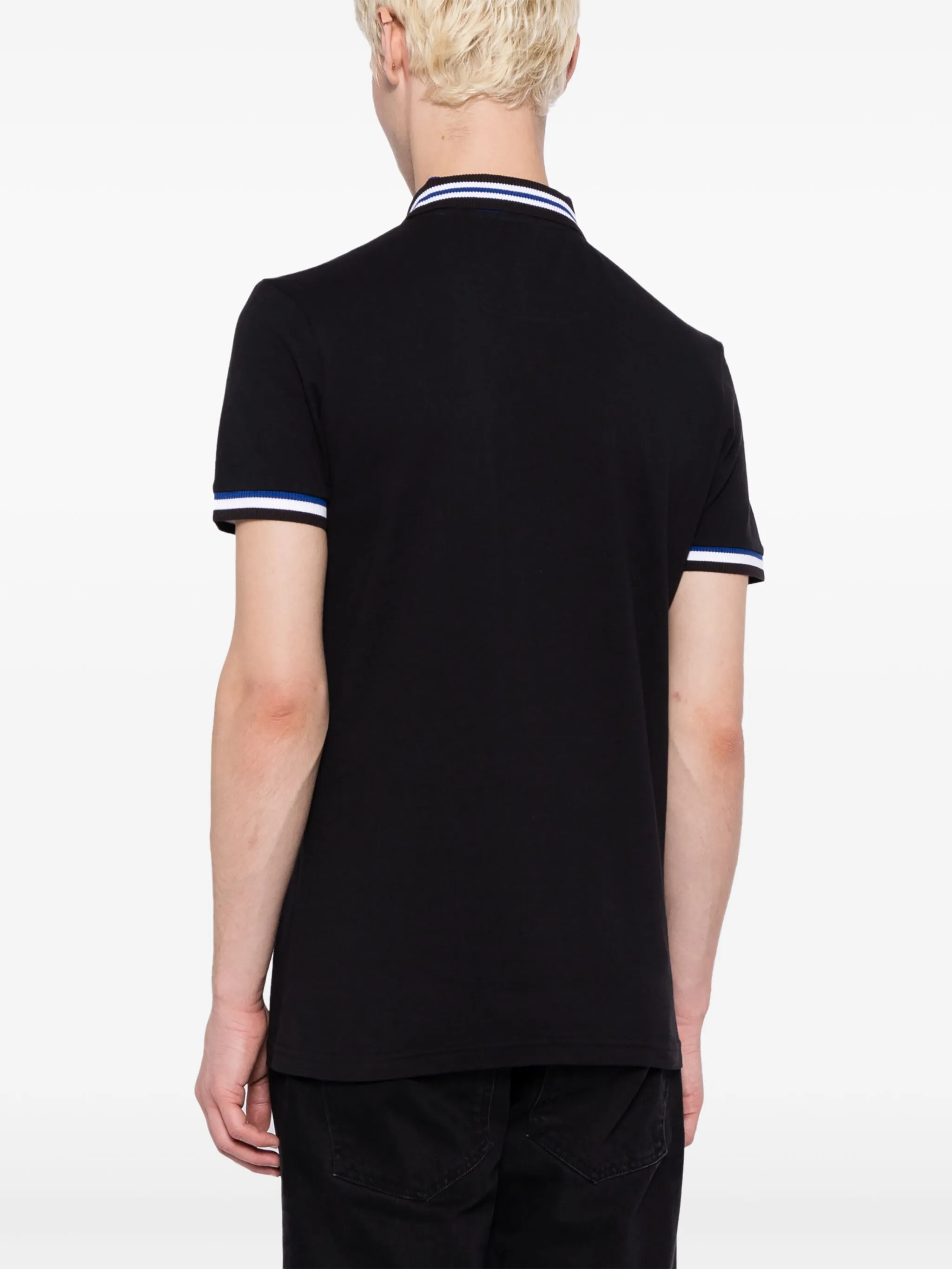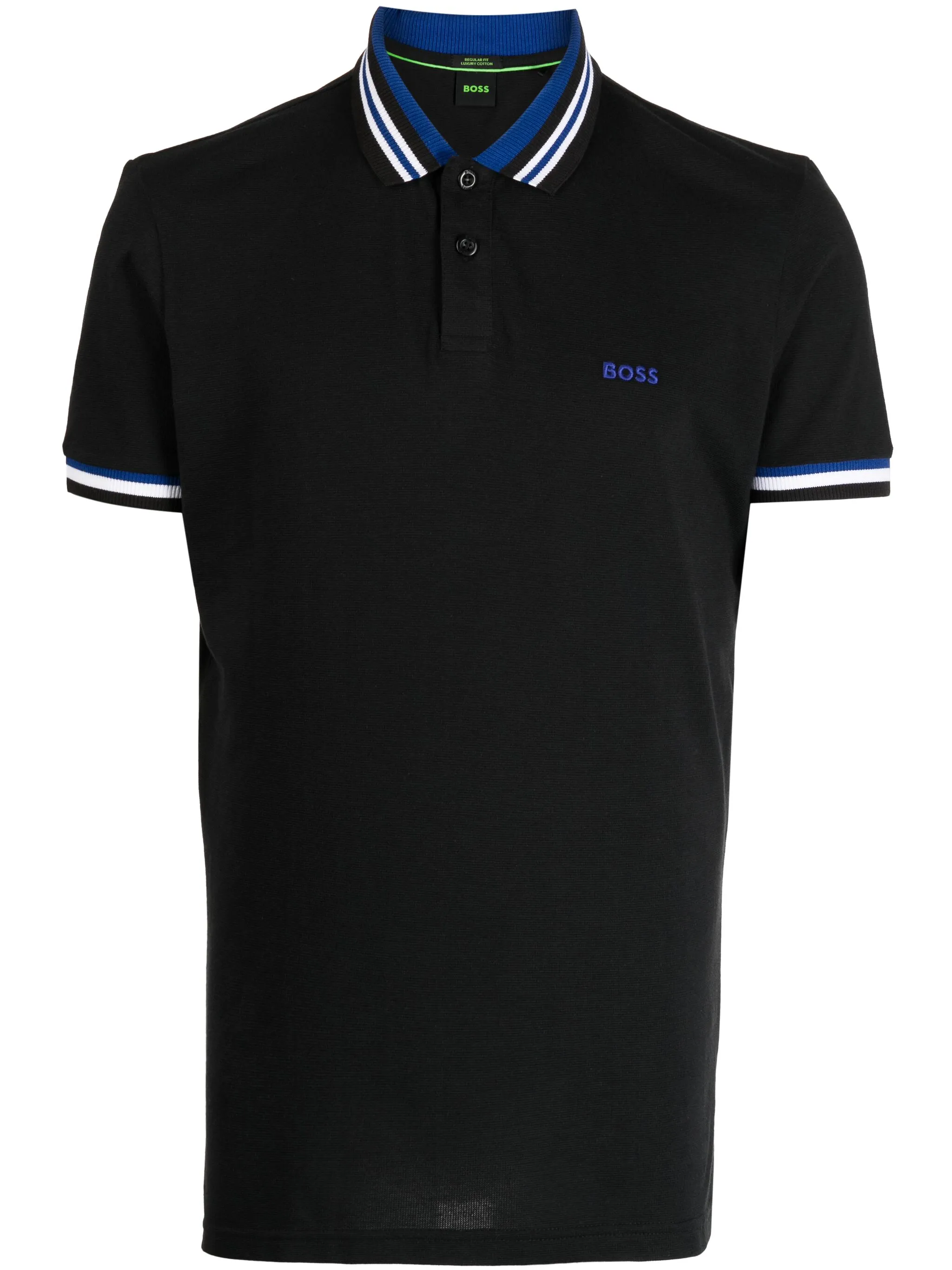 Черный, хлопок, отделка в полоску, вышитый логотип на груди, воротник поло, короткая застежка на пуговицах спереди, короткие рукава и прямой подол.