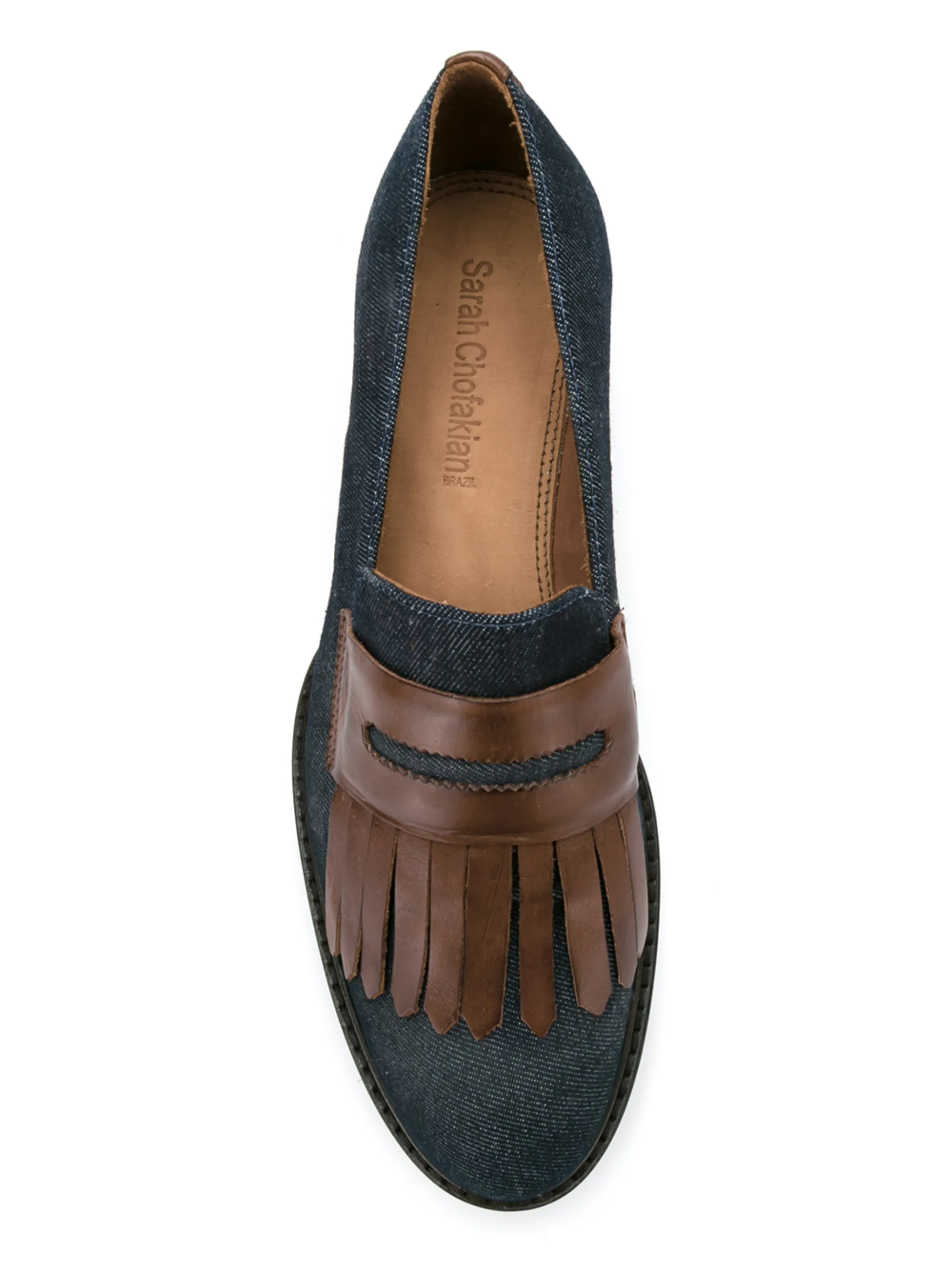 Синие с коричневым слиперы из кожи и денима с бахромой от Sarah Chofakian. Закругленный носок, низкий каблук.
