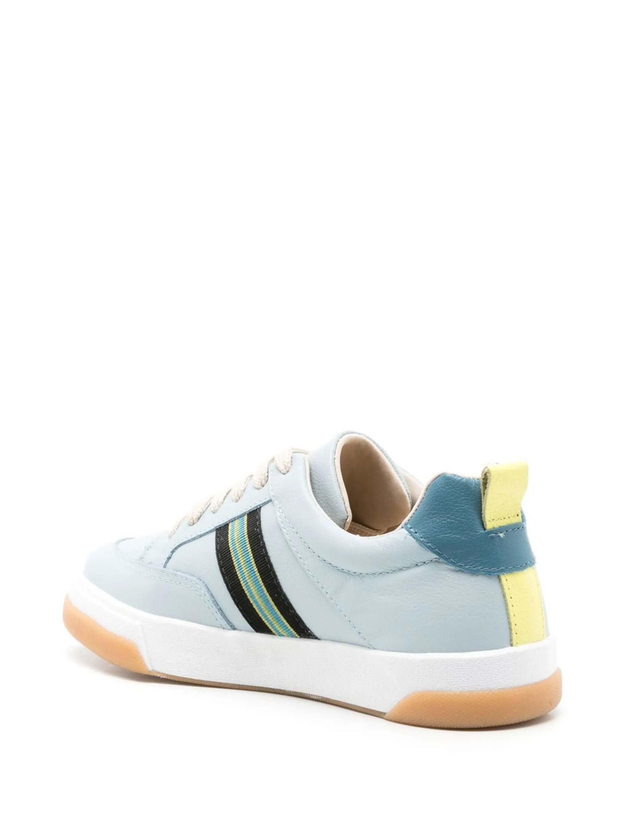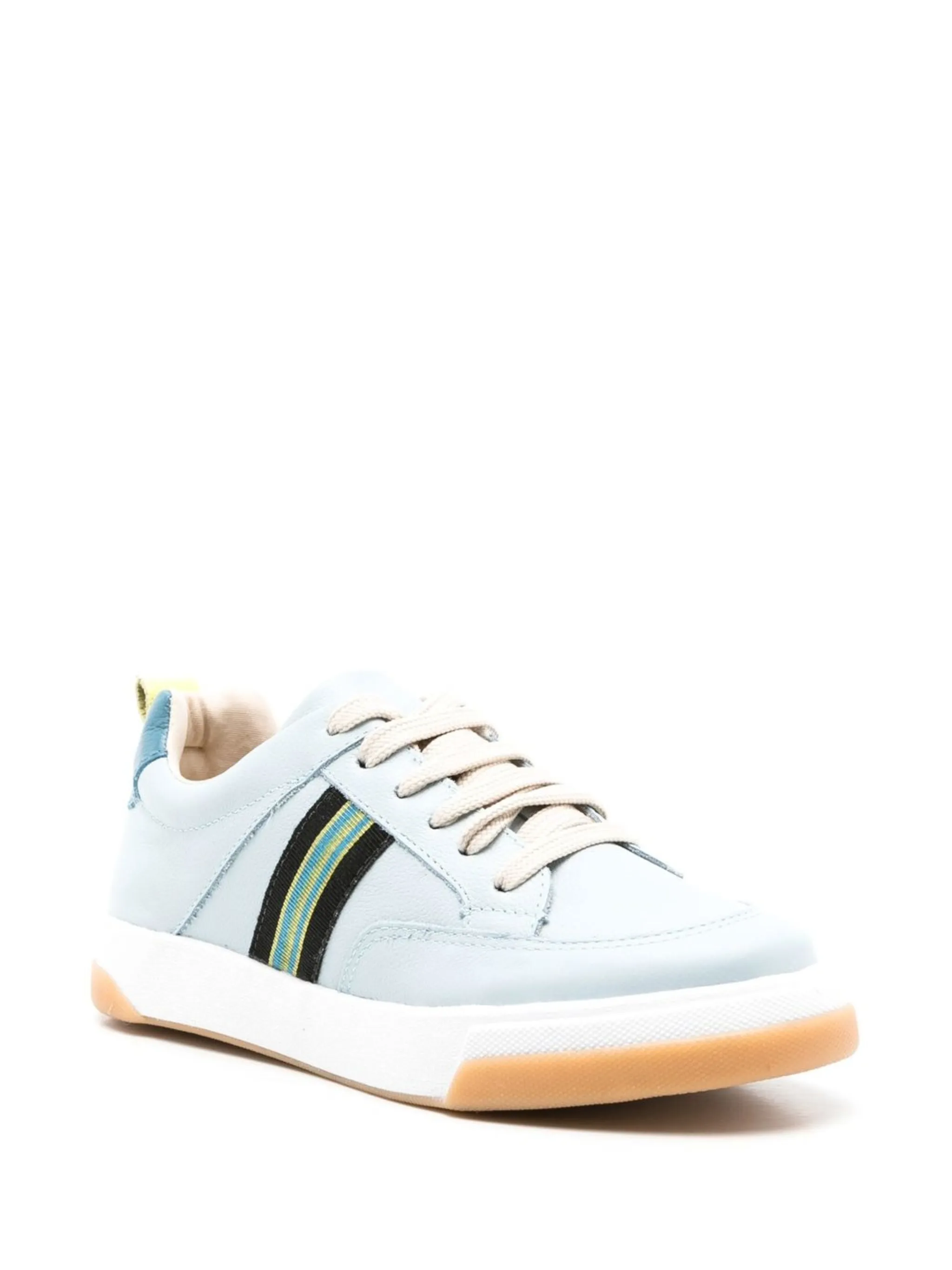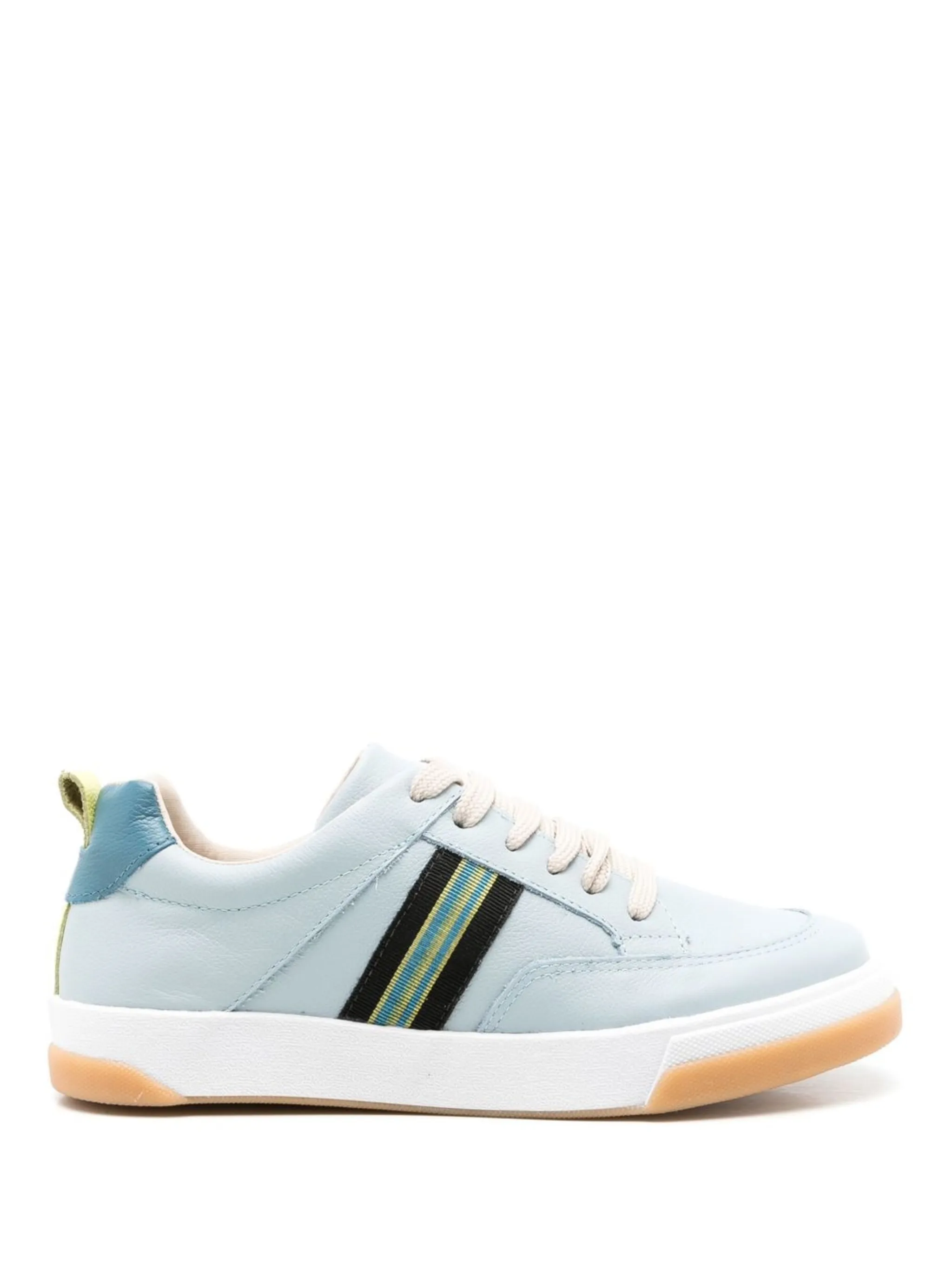 Голубой, разноцветный, кожа, полоска сбоку, закругленный носок, шнуровка спереди, контрастный задник, стелька с логотипом, петля для подтягивания сзади и плоская резиновая подошва.