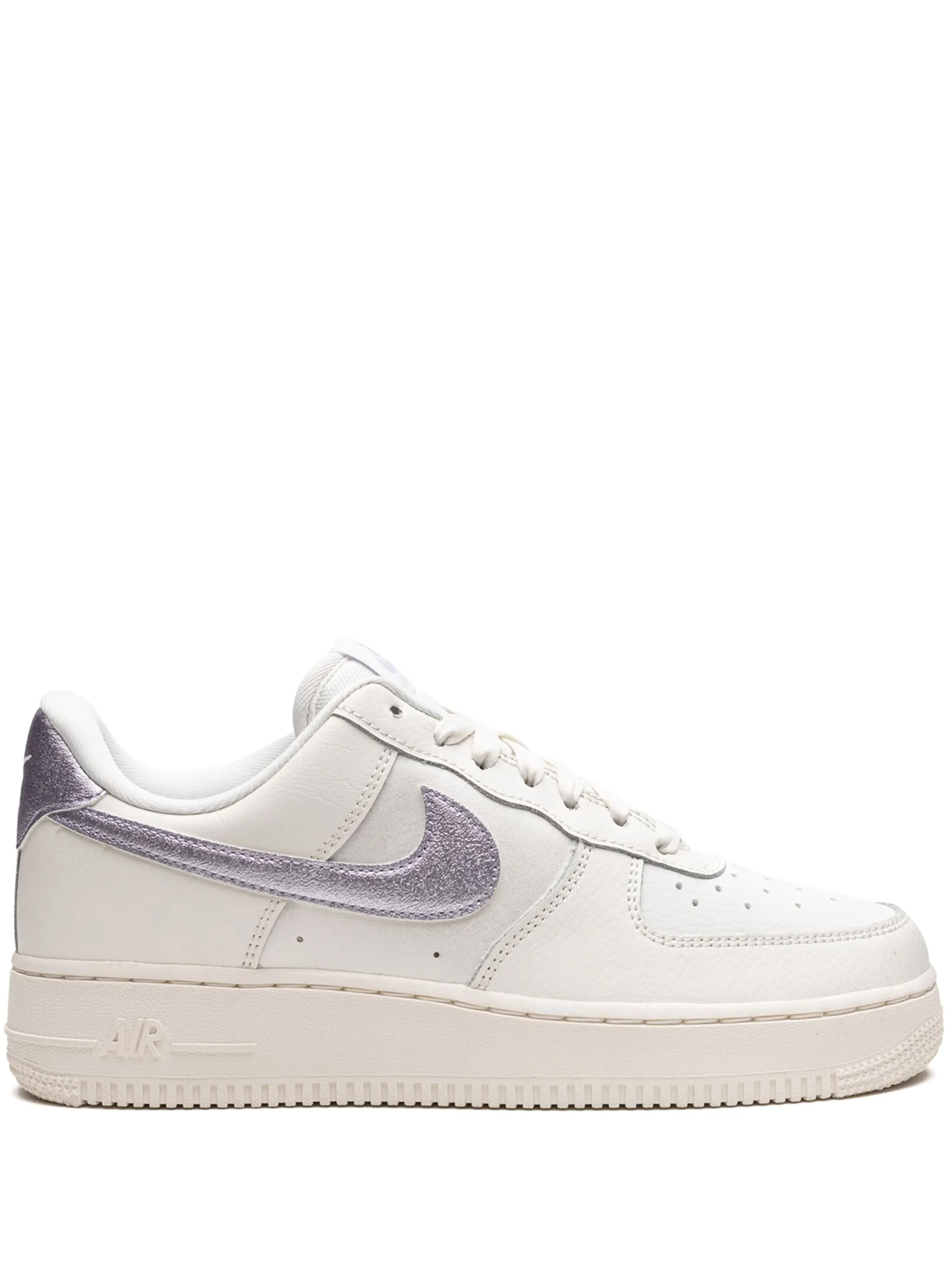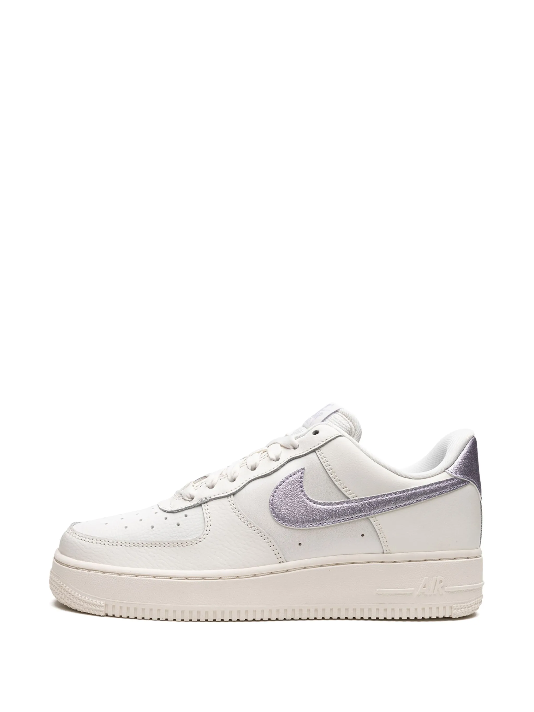Белый, фиолетовый, кожа, логотип Nike Swoosh, перфорированный носок, закругленный носок, шнуровка спереди, нашивка с логотипом на язычке, задник с логотипом и плоская резиновая подошва.