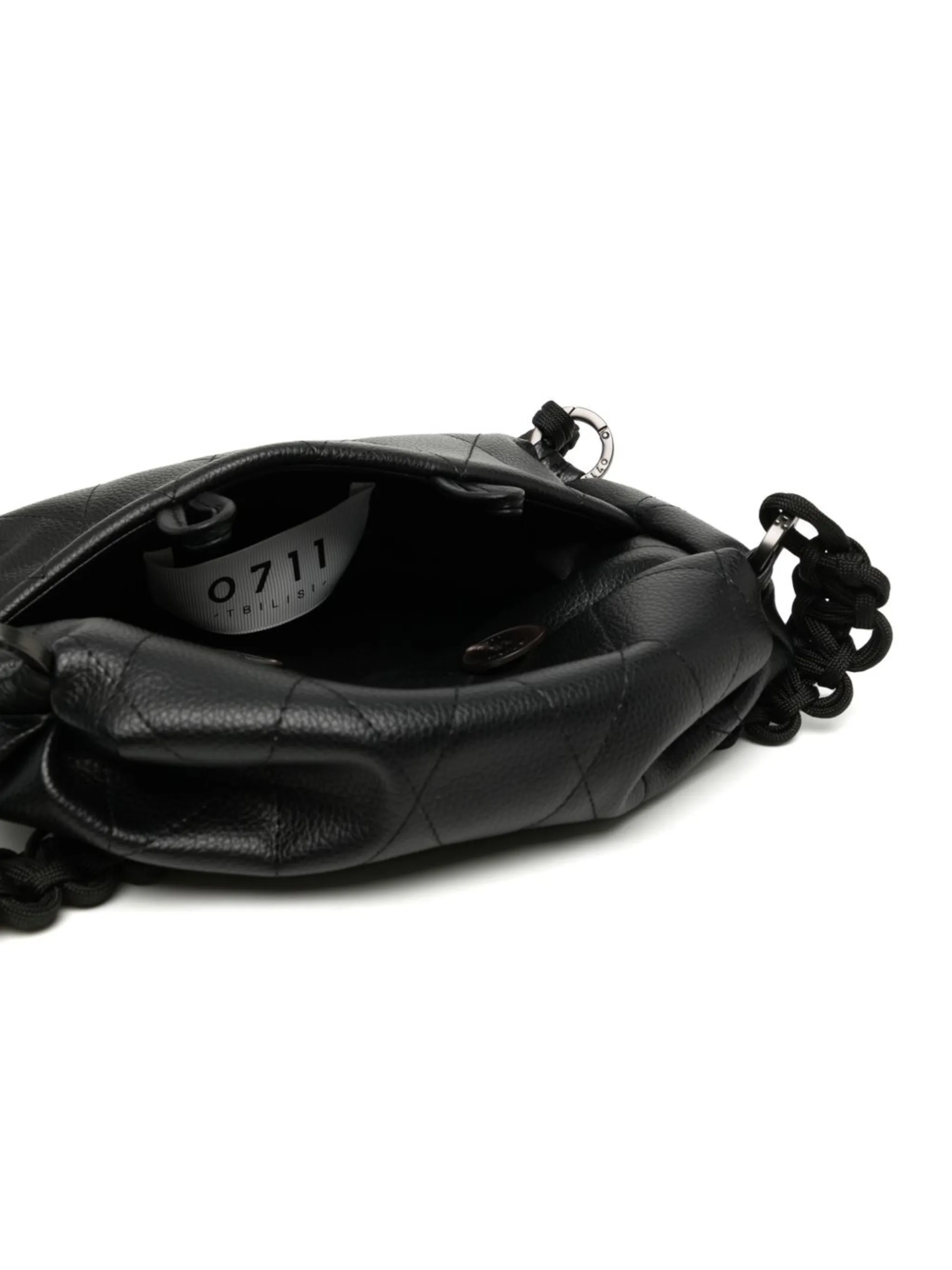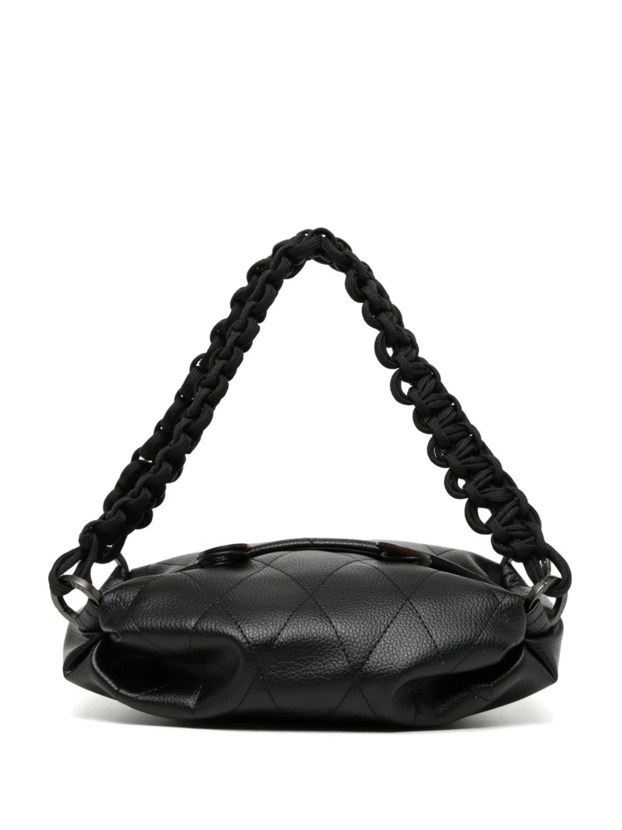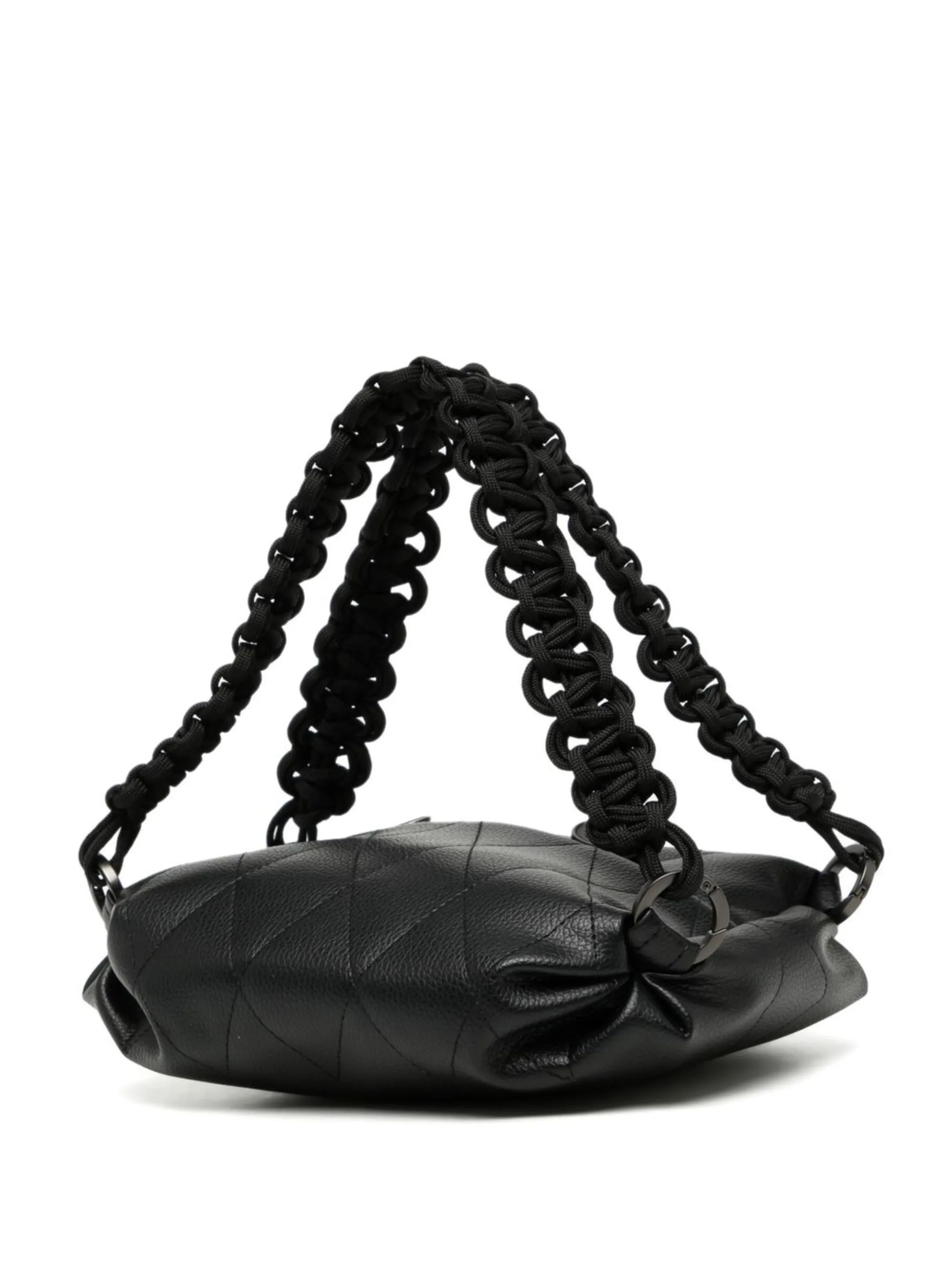 Черный, модель в технике кроше, искусственная кожа, две закругленные ручки, присборенный лиф и основное отделение.