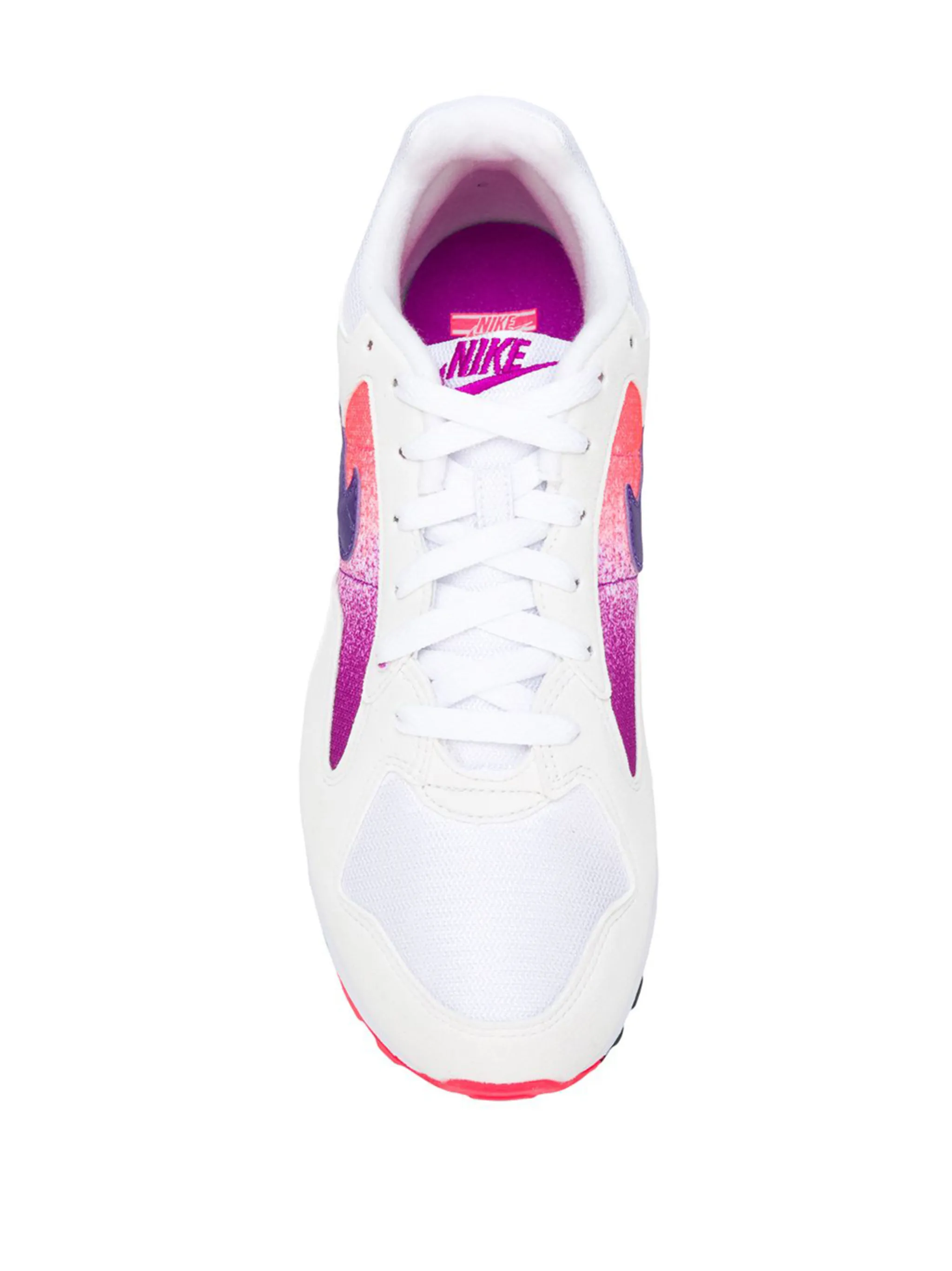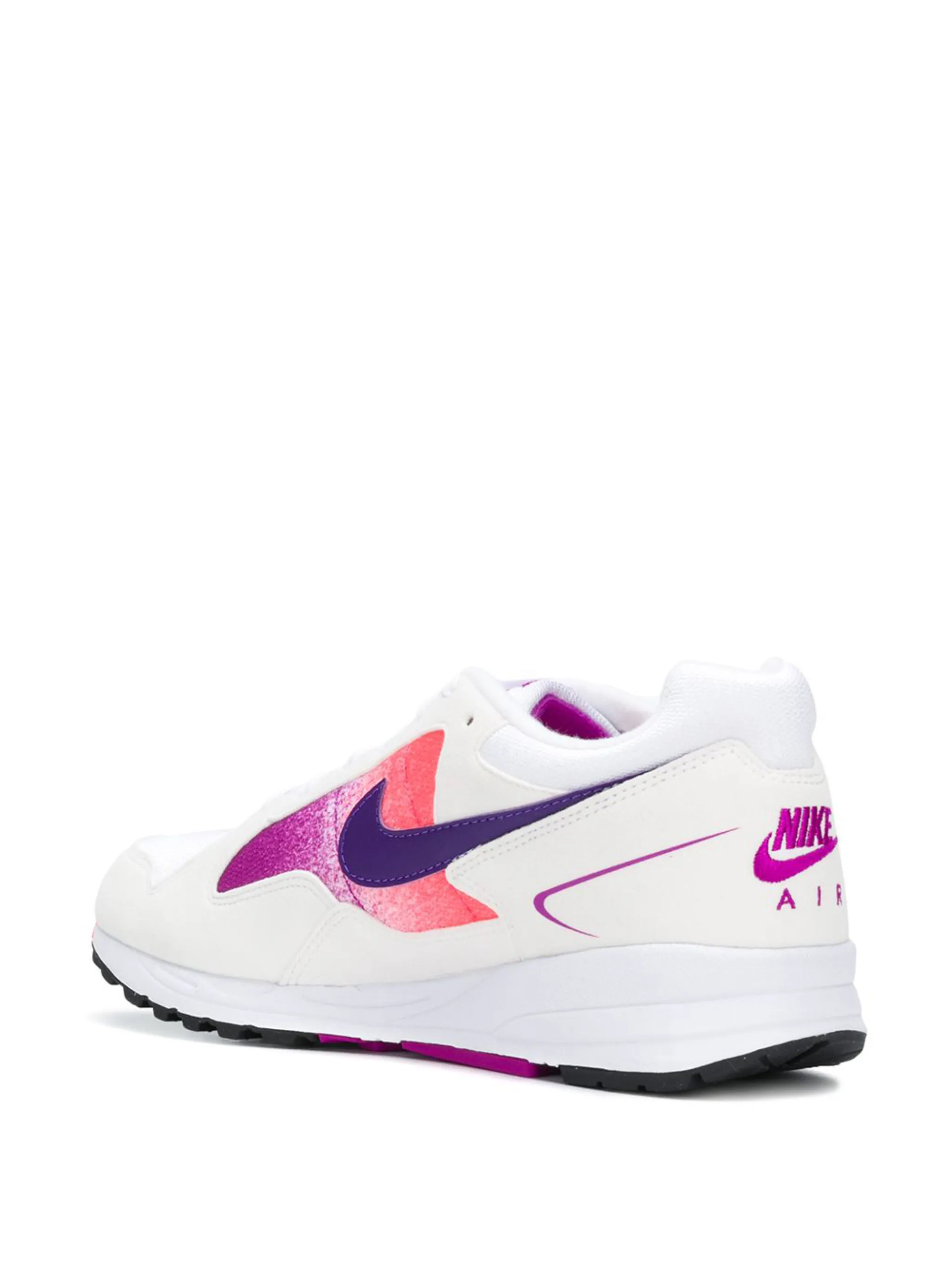 Белые с фиолетовым и розовым замшевые кроссовки 'Air Skylon' от Nike(Найк). Закругленный носок, плоская подошва, застежка на шнуровке, фирменная галочка Nike, заплатка с логотипом на язычке, фирменный дизайн каблука.