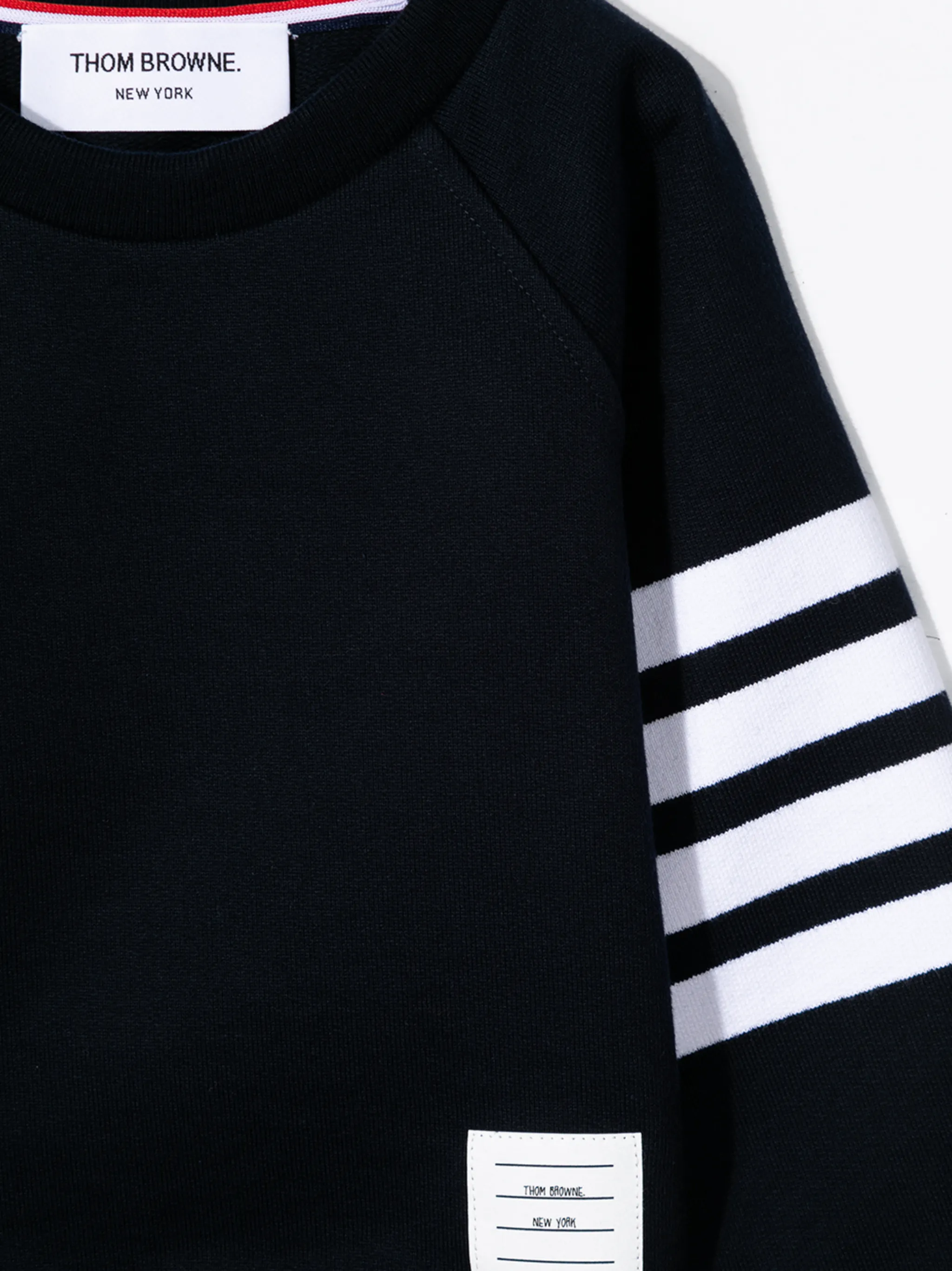 Полоска сбоку, нашивка с логотипом спереди, круглый вырез, длинные рукава и рукава с узкими манжетами.