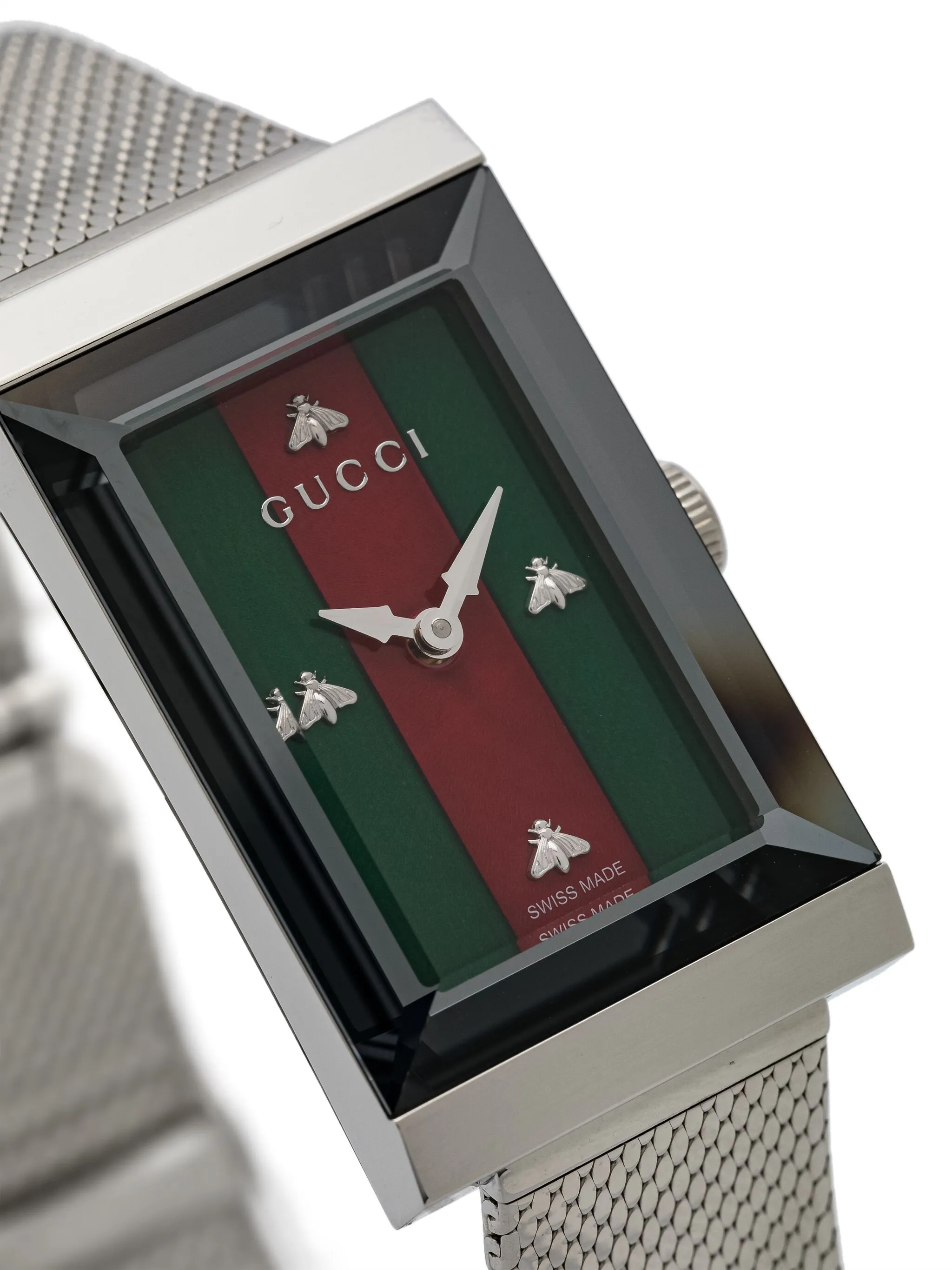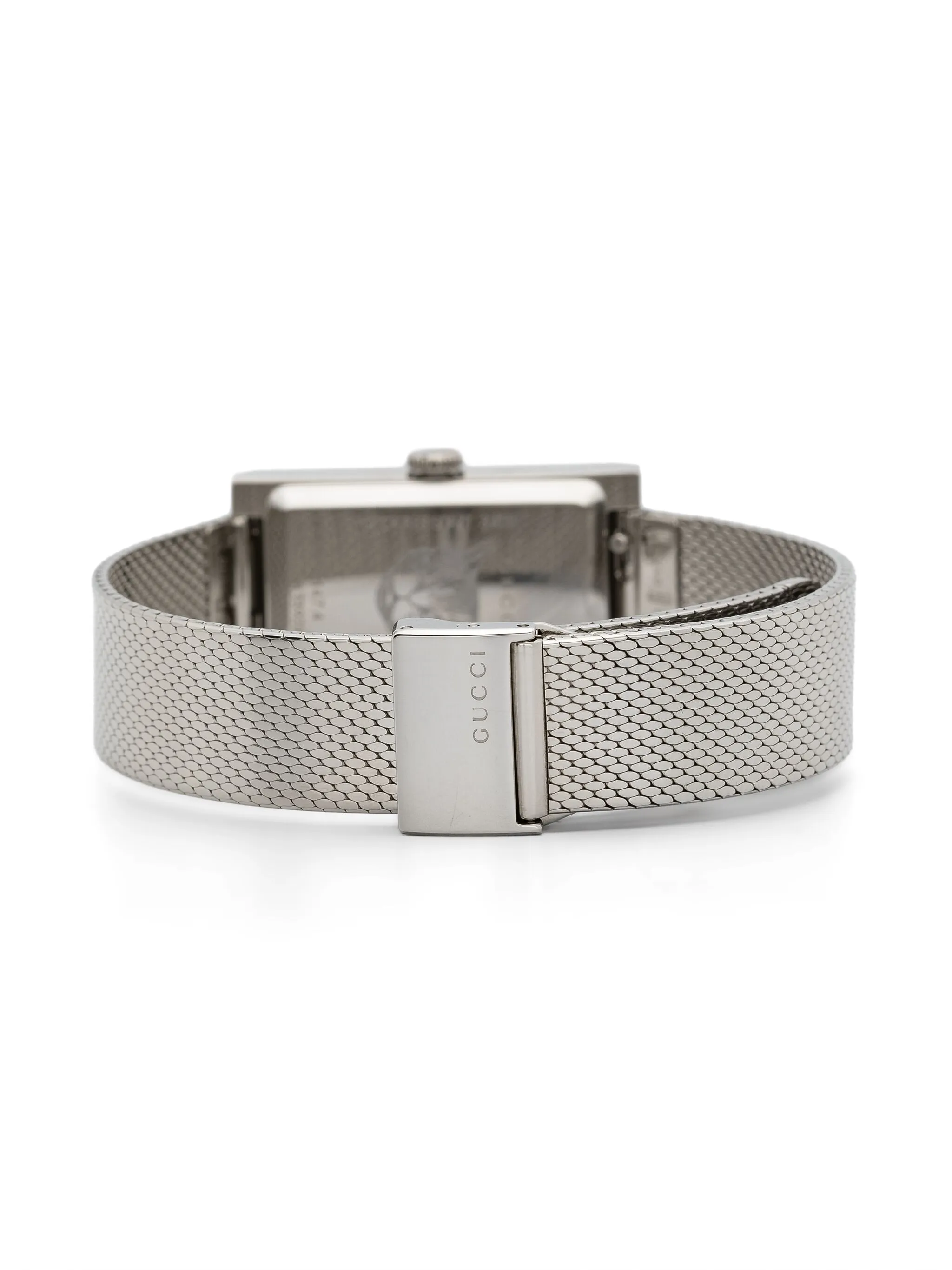 Прямоугольный корпус, заостренные стрелки, завинчивающаяся заводная коронка, браслет «миланское плетение» и тройная раскладная застежка.