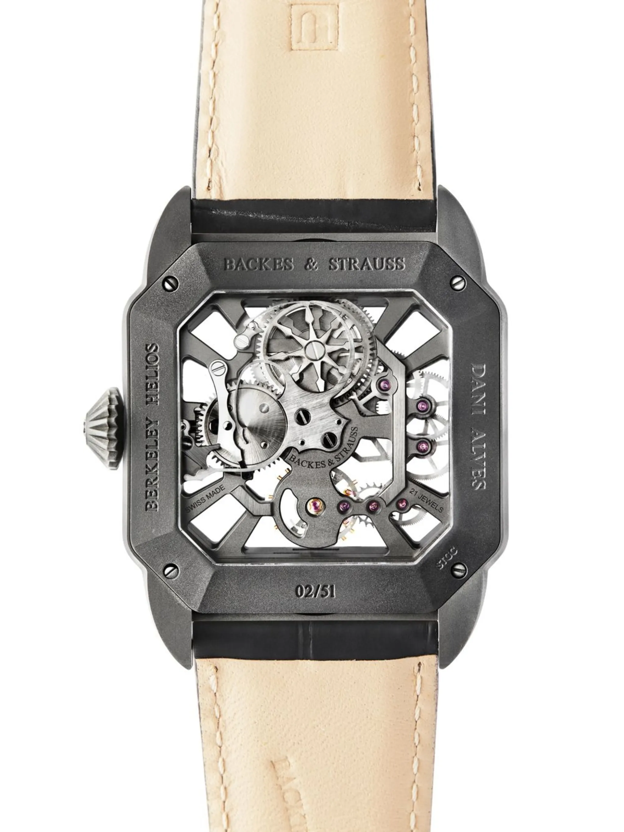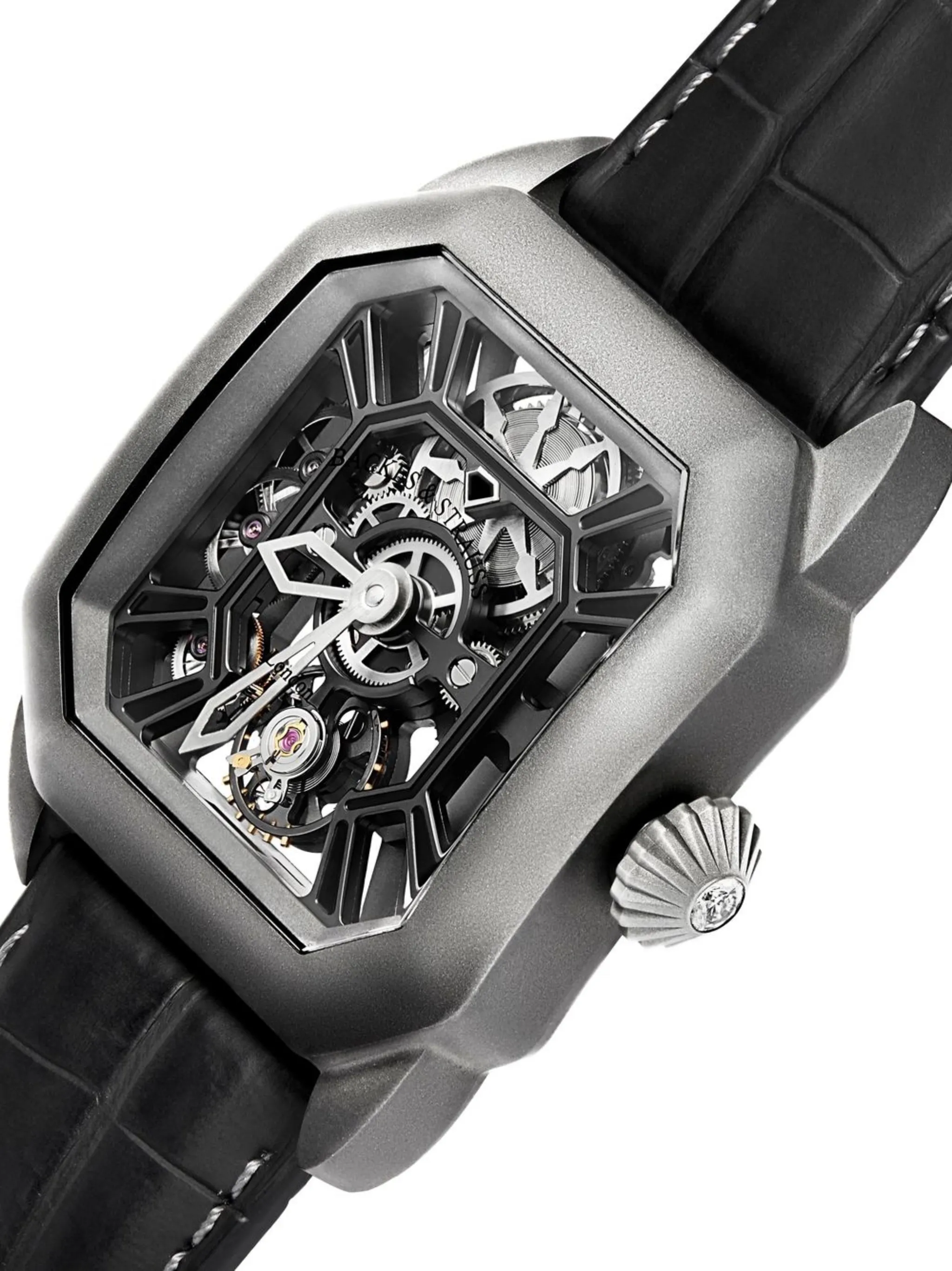 Титановый корпус, матовое покрытие, серый, механические часы, прозрачный циферблат, циферблат с индексами, скелетированная задняя крышка , квадратный корпус, застежка на пряжке, механические часы и запас хода - 48 часов.