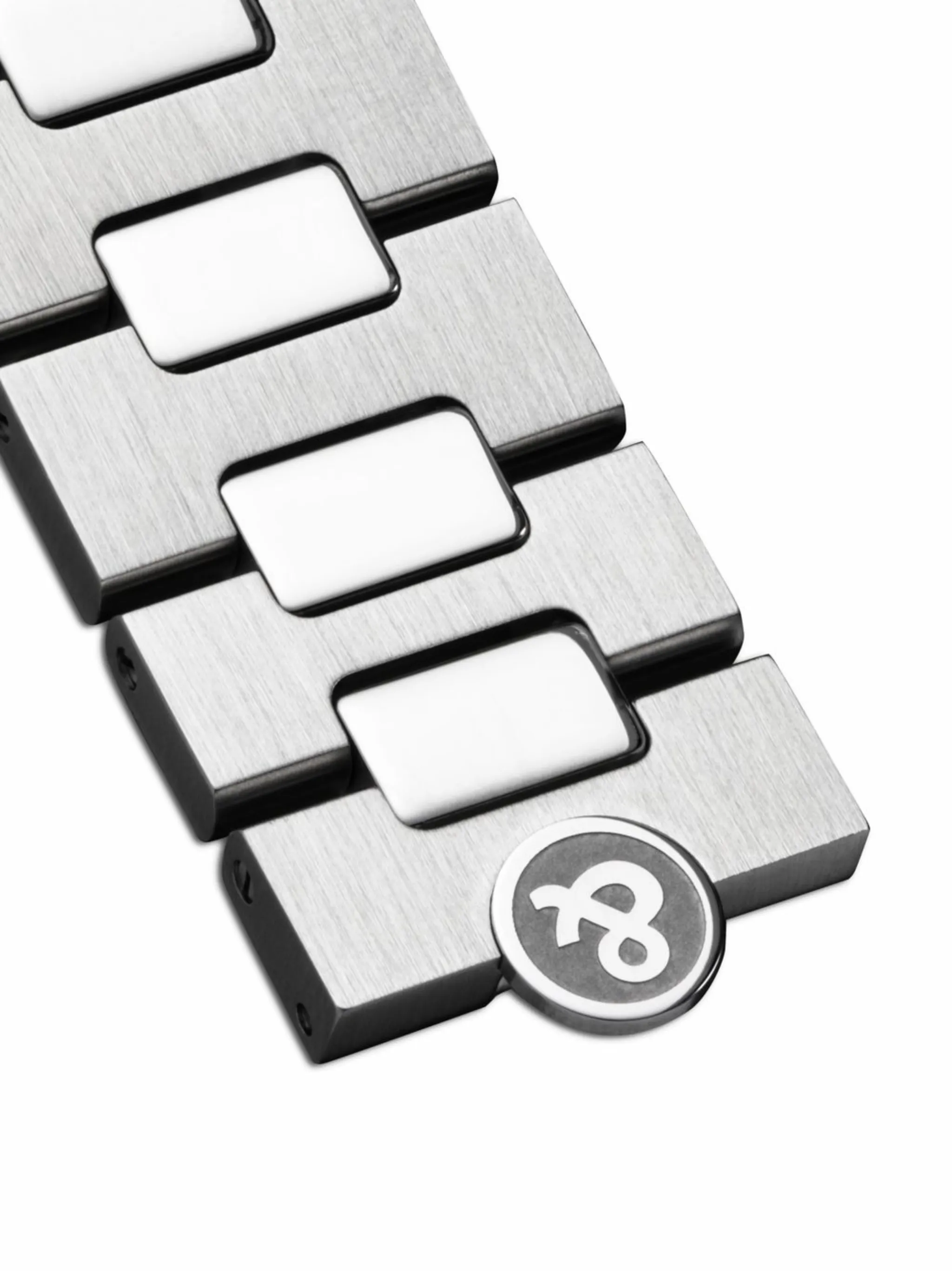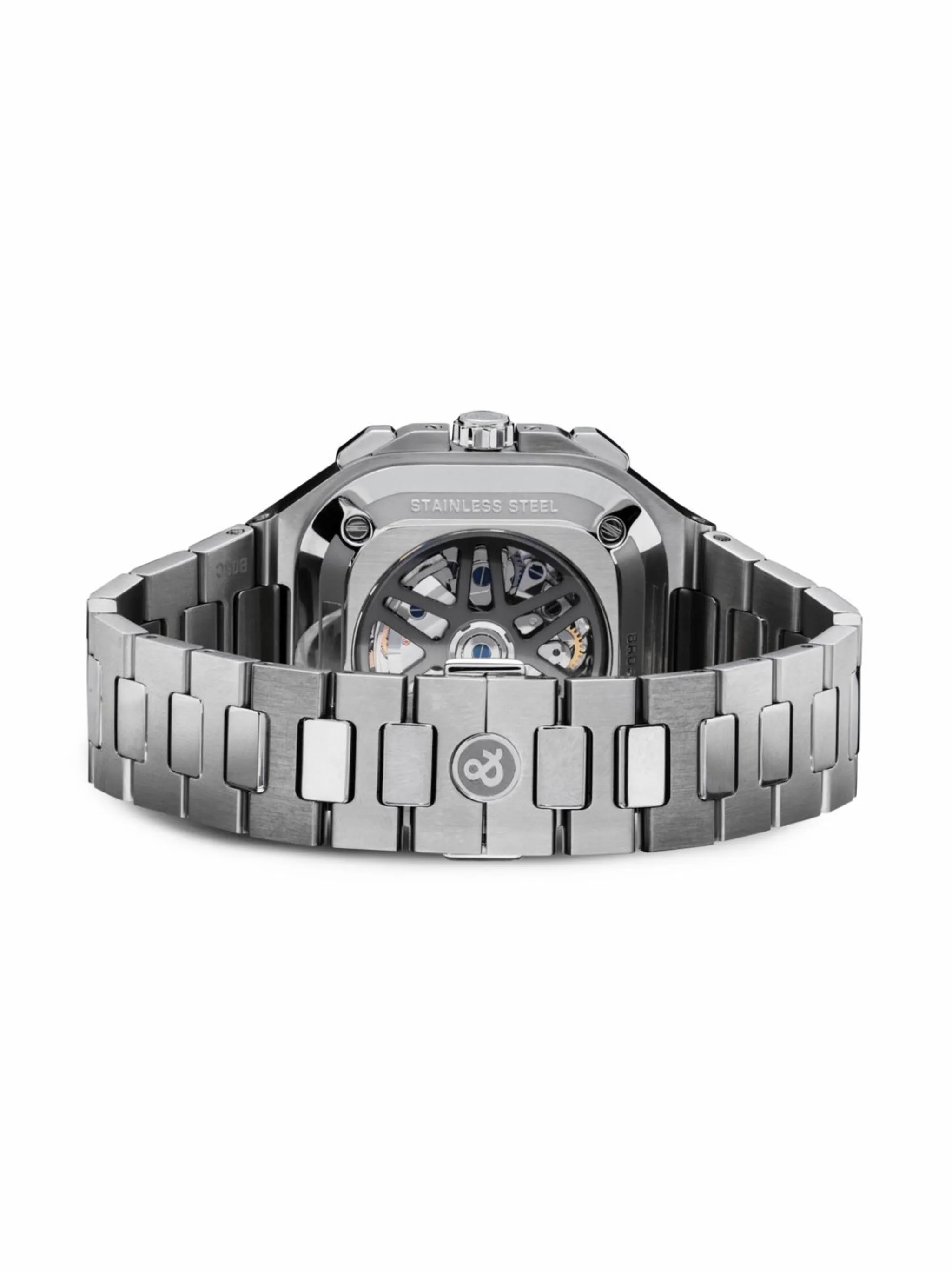 Черный, нержавеющая сталь, выпуклый корпус, прямоугольные вытянутые индексы, прямоугольные вытянутые стрелки, хронограф, индикатор даты, завинчивающаяся заводная коронка, регулируемый браслет со звеньями, потайная застежка, автоматический механизм и водонепроницаемость до 100 метров/10 АТМ.