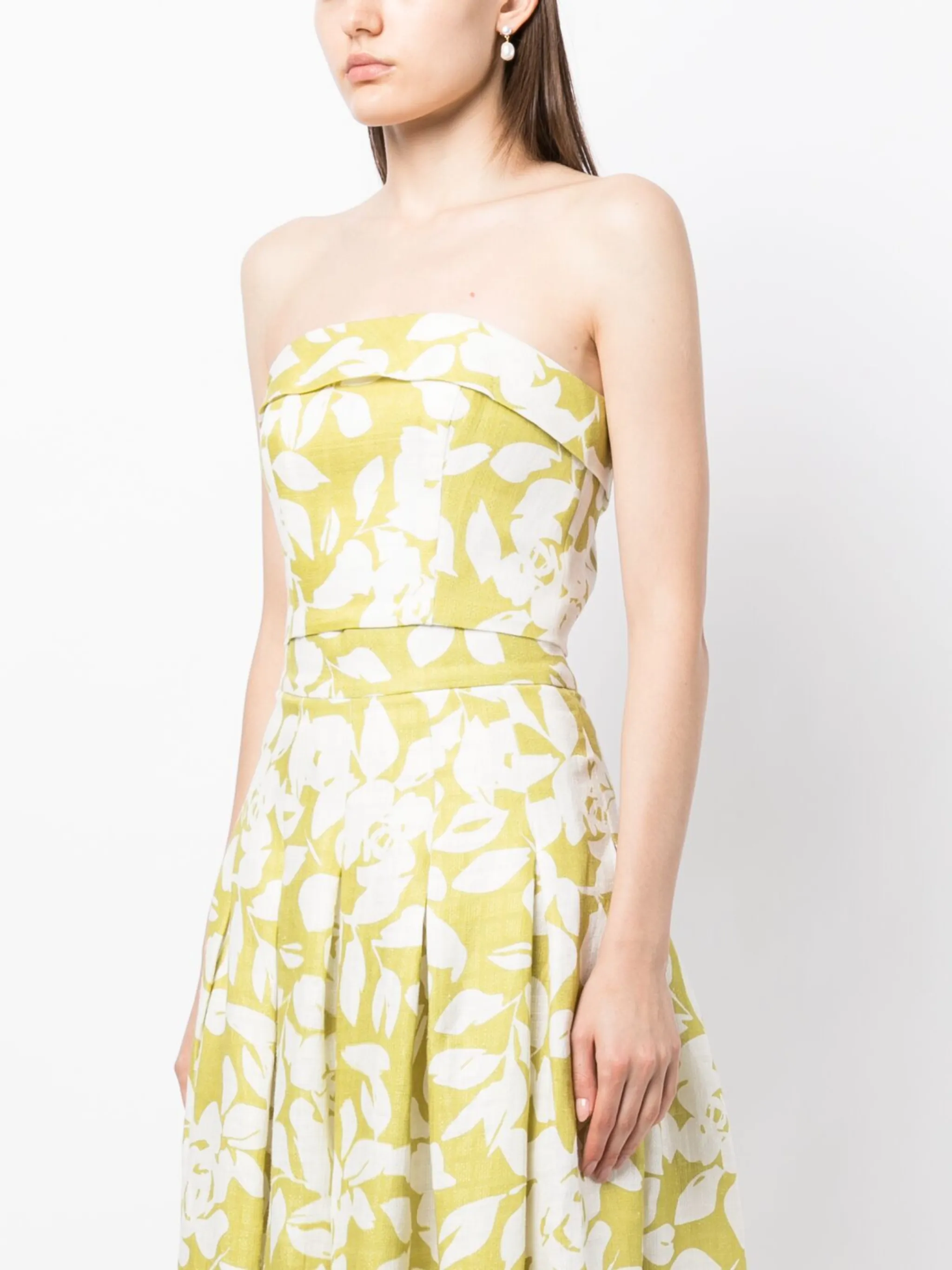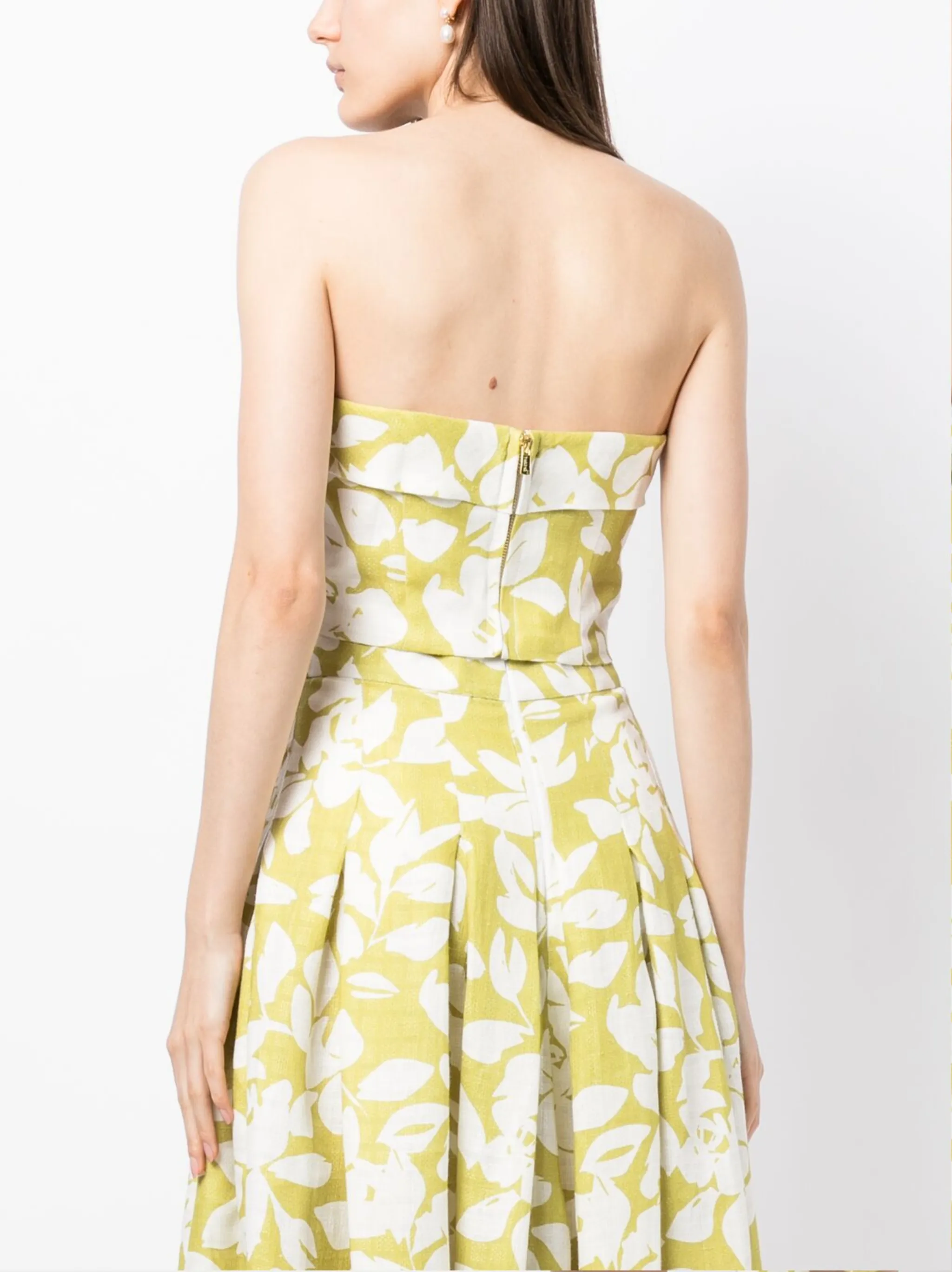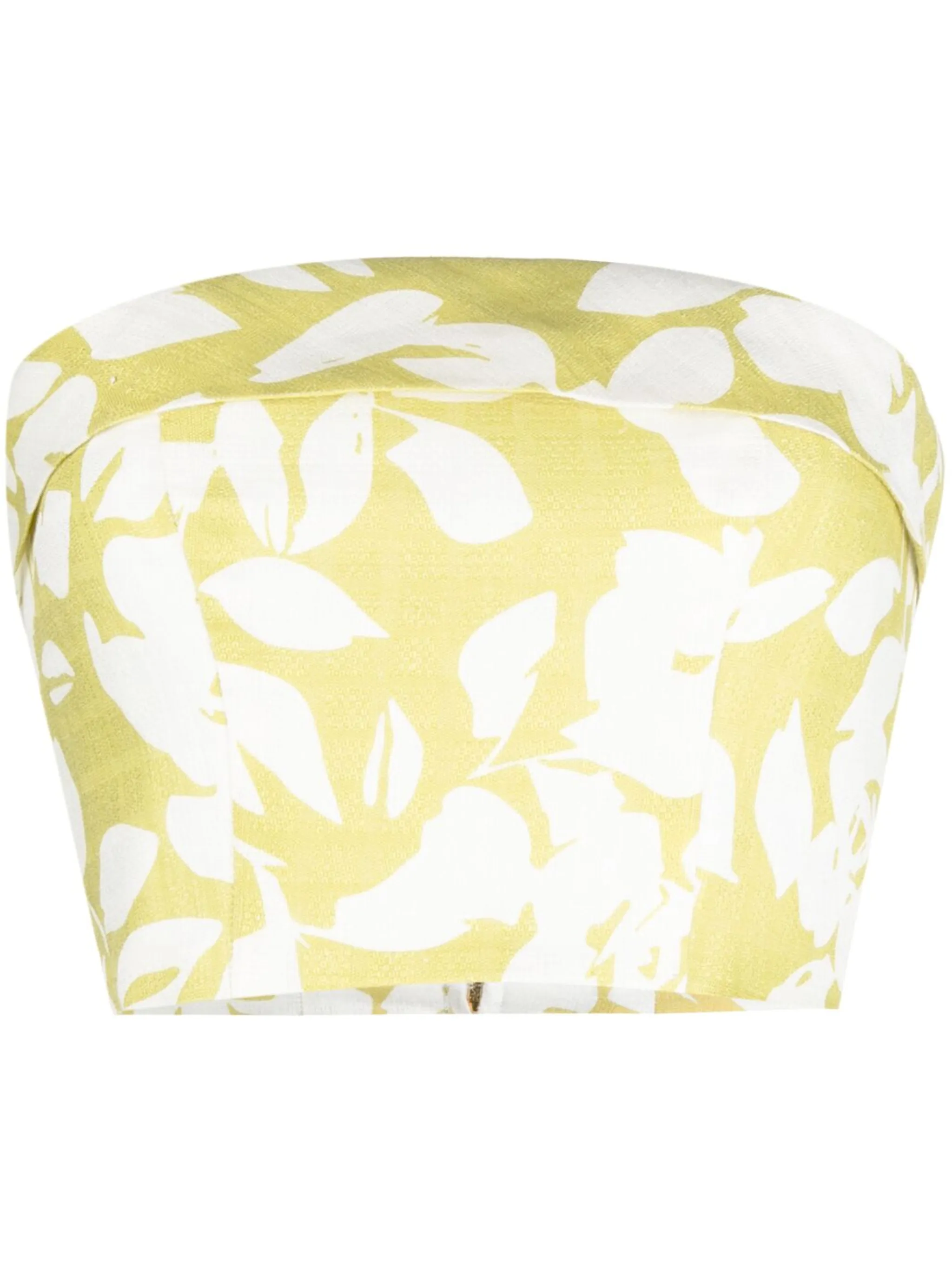 Салатовый, лен, снуд, сплошной цветочный принт, без бретелей, застежка на молнии сзади и укороченная длина. Этот товар как минимум на 50% состоит из материалов, которые признаны более безопасными для окружающей среды, и/или произведены с использованием методов, которые помогают сократить потребление воды и химических веществ.