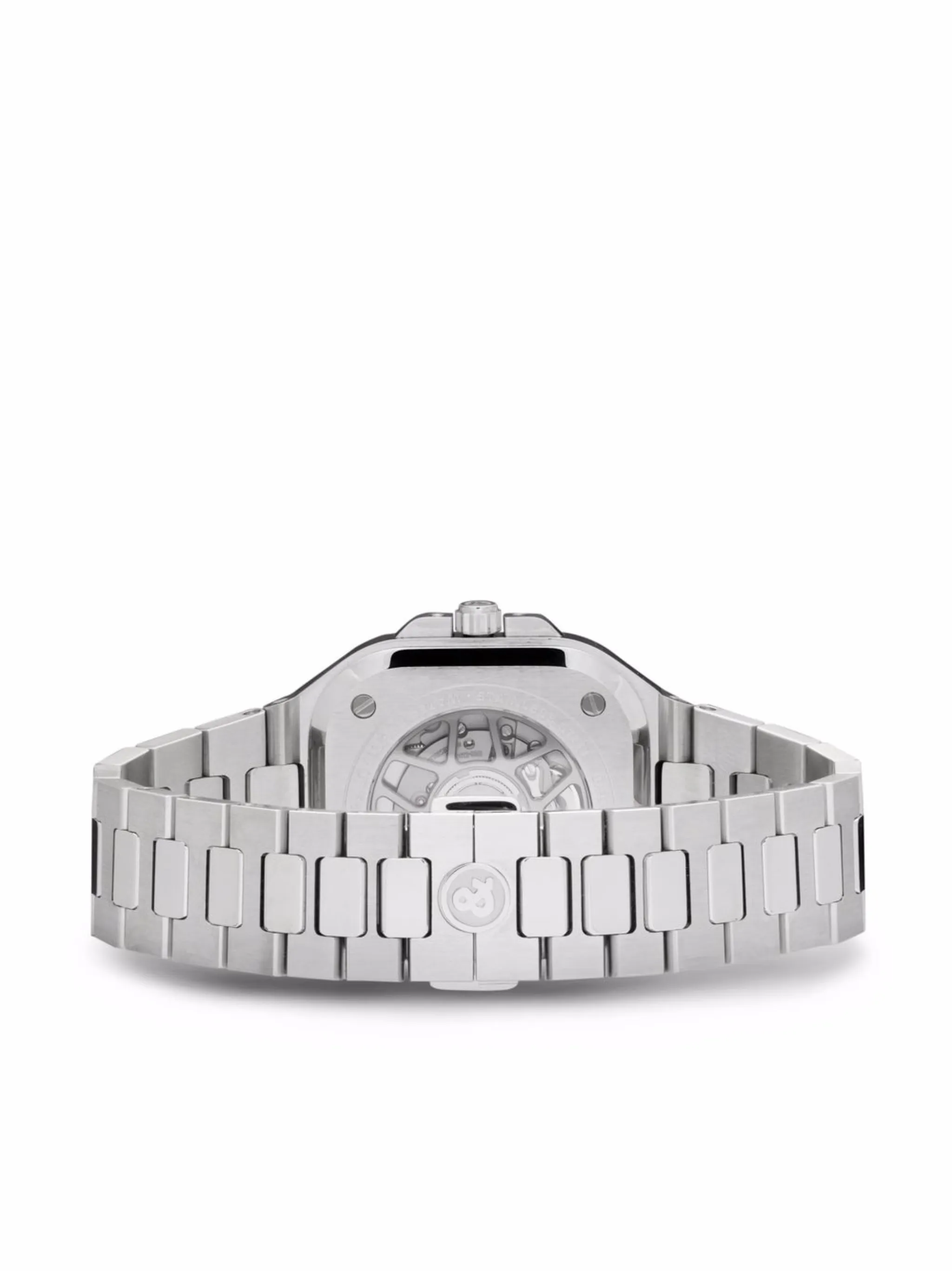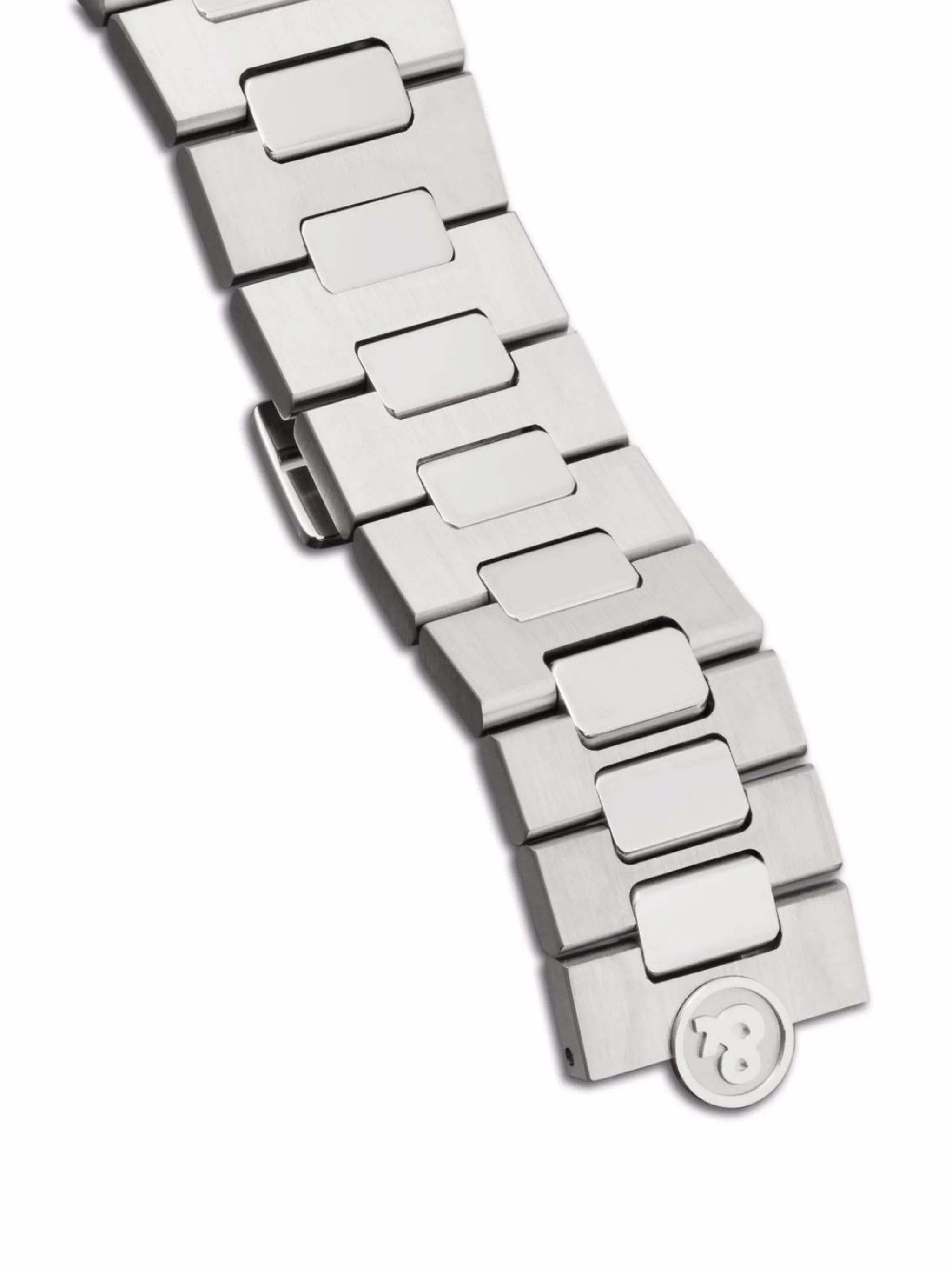 Круглый корпус, автоматический механизм, регулируемый браслет со звеньями, застежка на зажиме, заостренные стрелки, завинчивающаяся заводная коронка и индикатор даты.