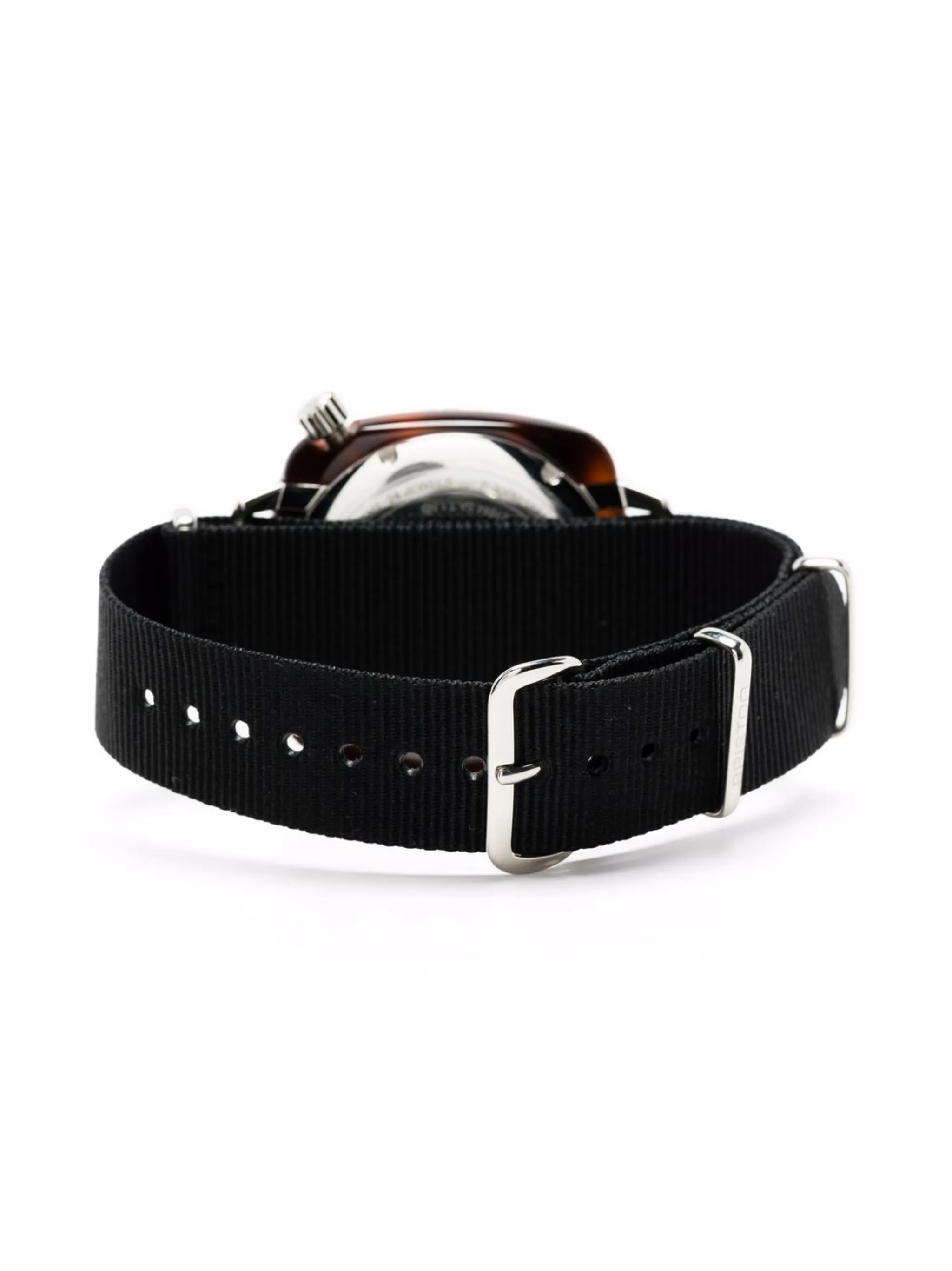 Круглый корпус, кварцевый механизм, тканевый ремешок, застежка на пряжке, заостренные стрелки, завинчивающаяся заводная коронка и индикатор даты. Цвет: черный.