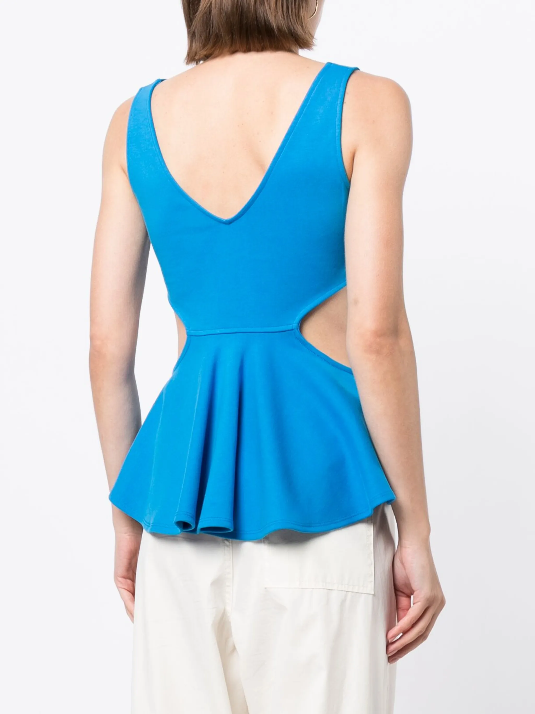 Голубой, хлопок, V-образный вырез, V-образный вырез сзади, вырезные детали, без рукавов и подол с оборками.