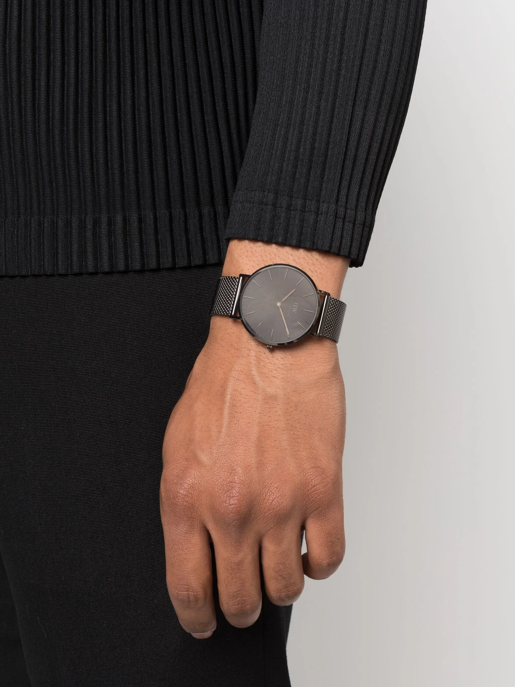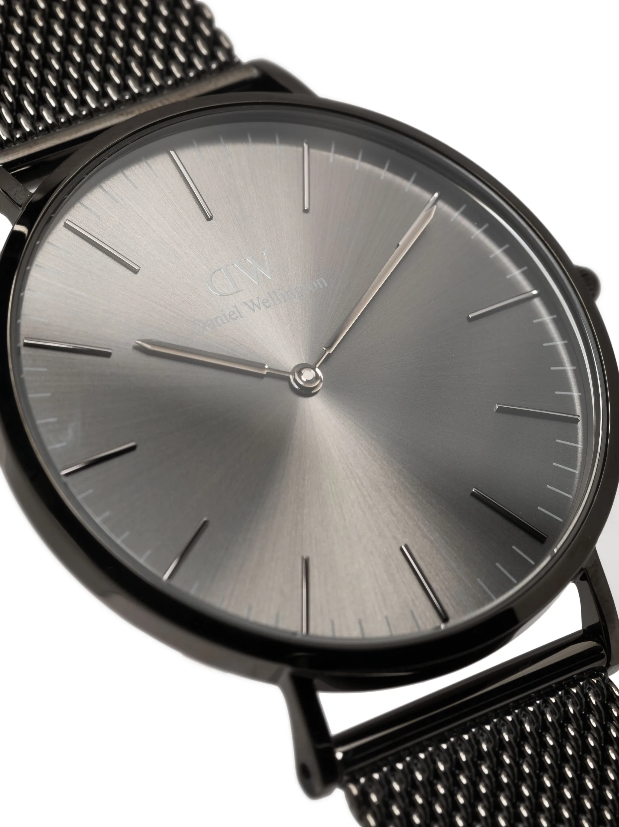 Нержавеющая сталь, кварцевый механизм, черный, круглый корпус, циферблат с индексами, тонкие закругленные стрелки, плетеный браслет, застежка-клипса и водонепроницаемость до 30 метров/3 АТМ.