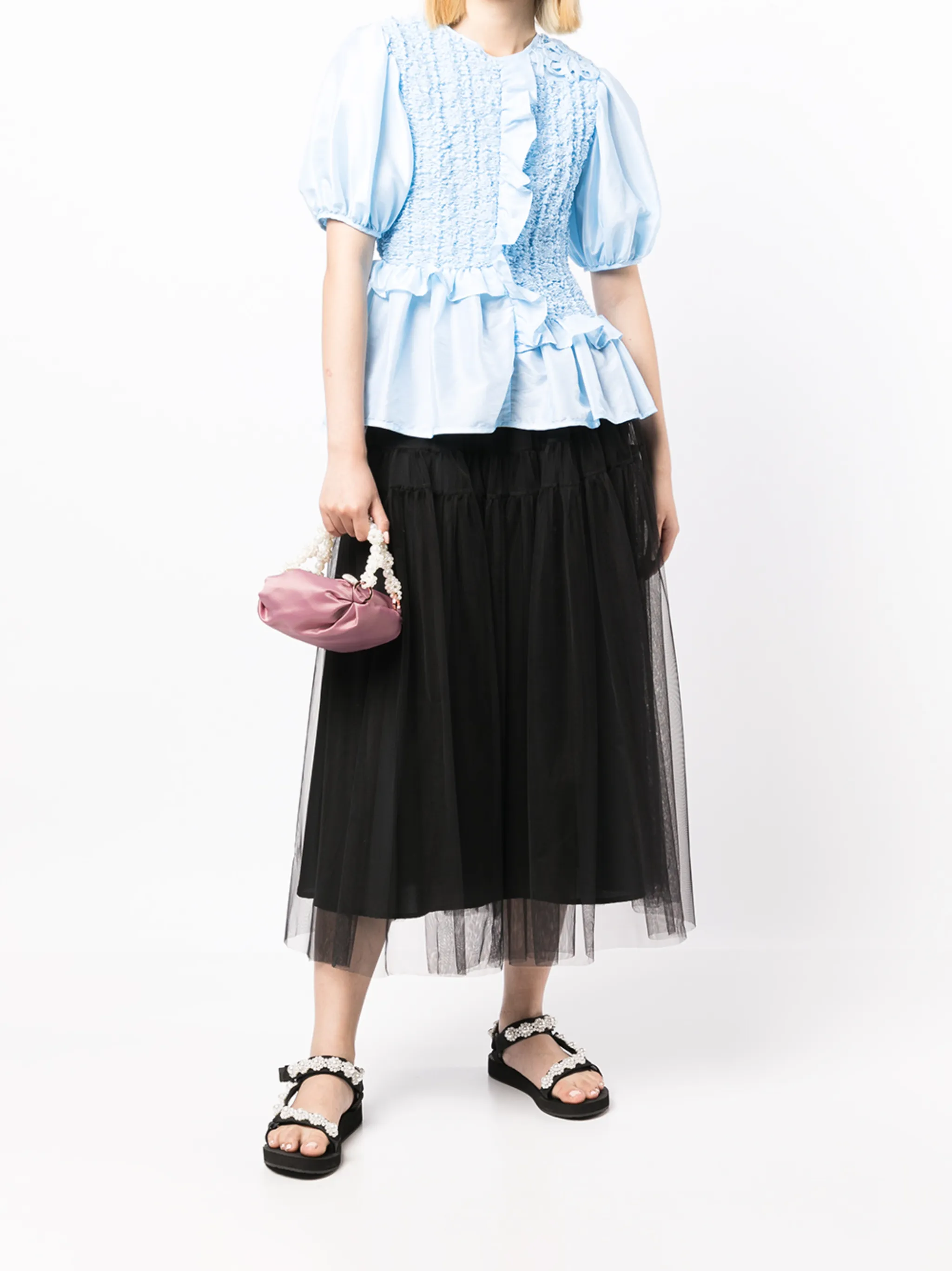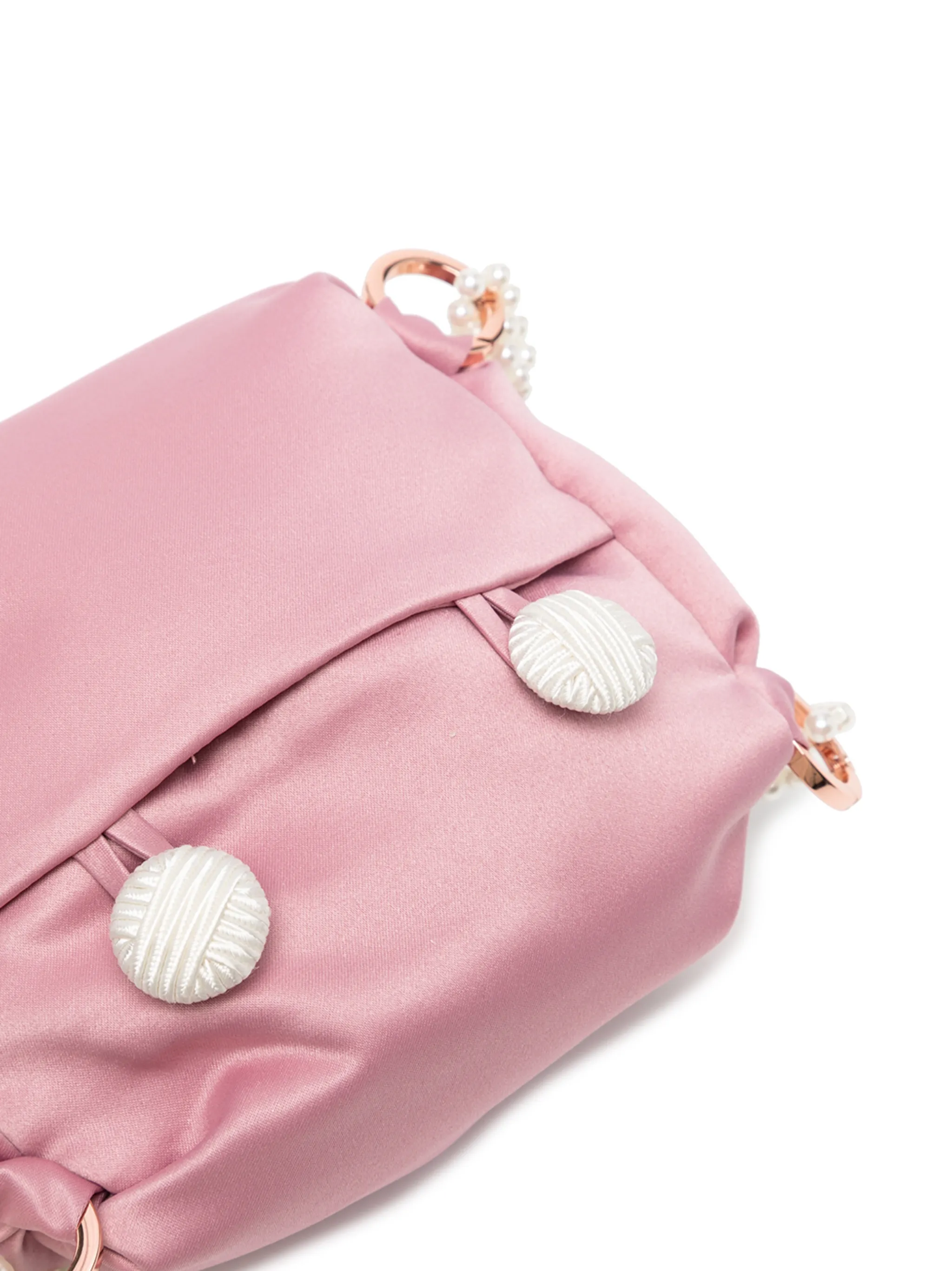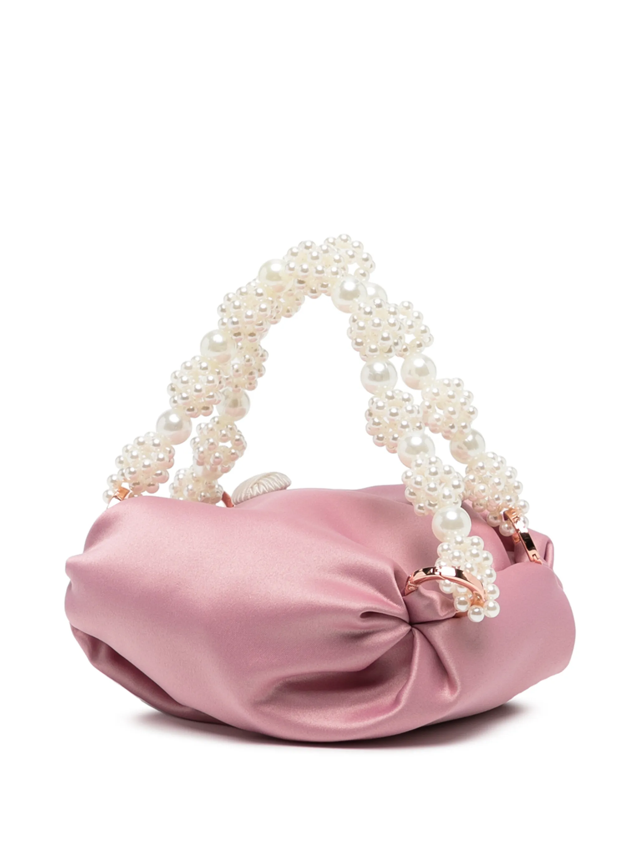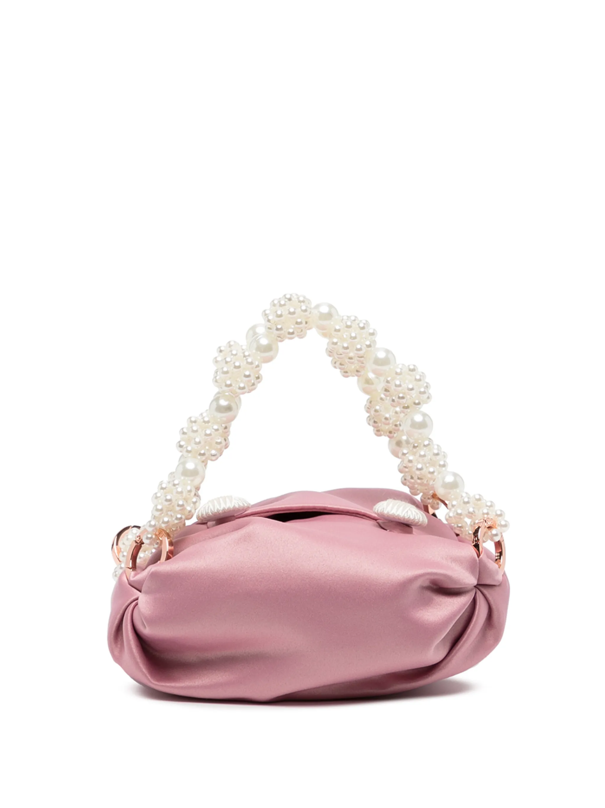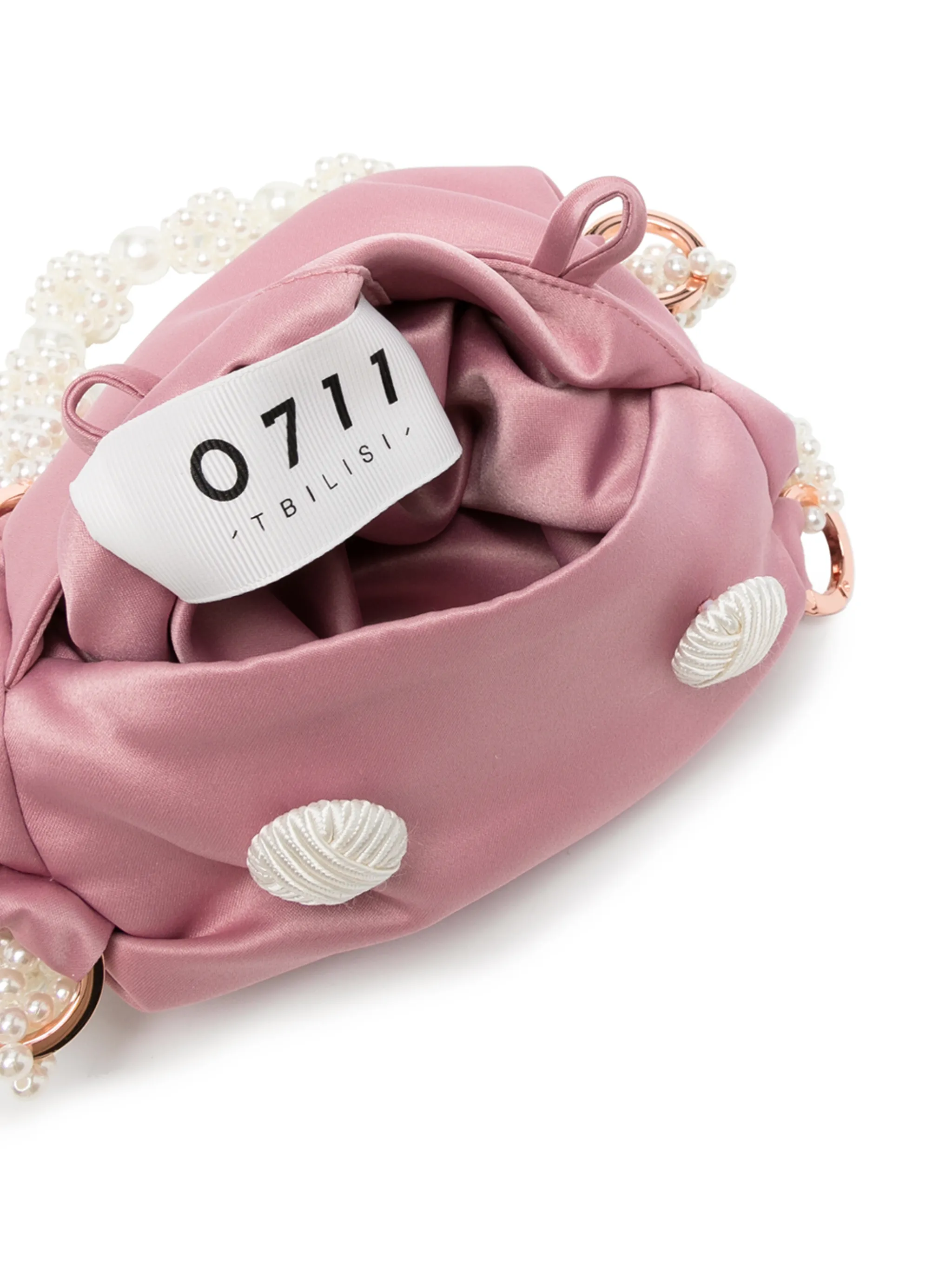 Золотистая фурнитура, детали с жемчугом, основное отделение и ручки с отделкой из бусин.