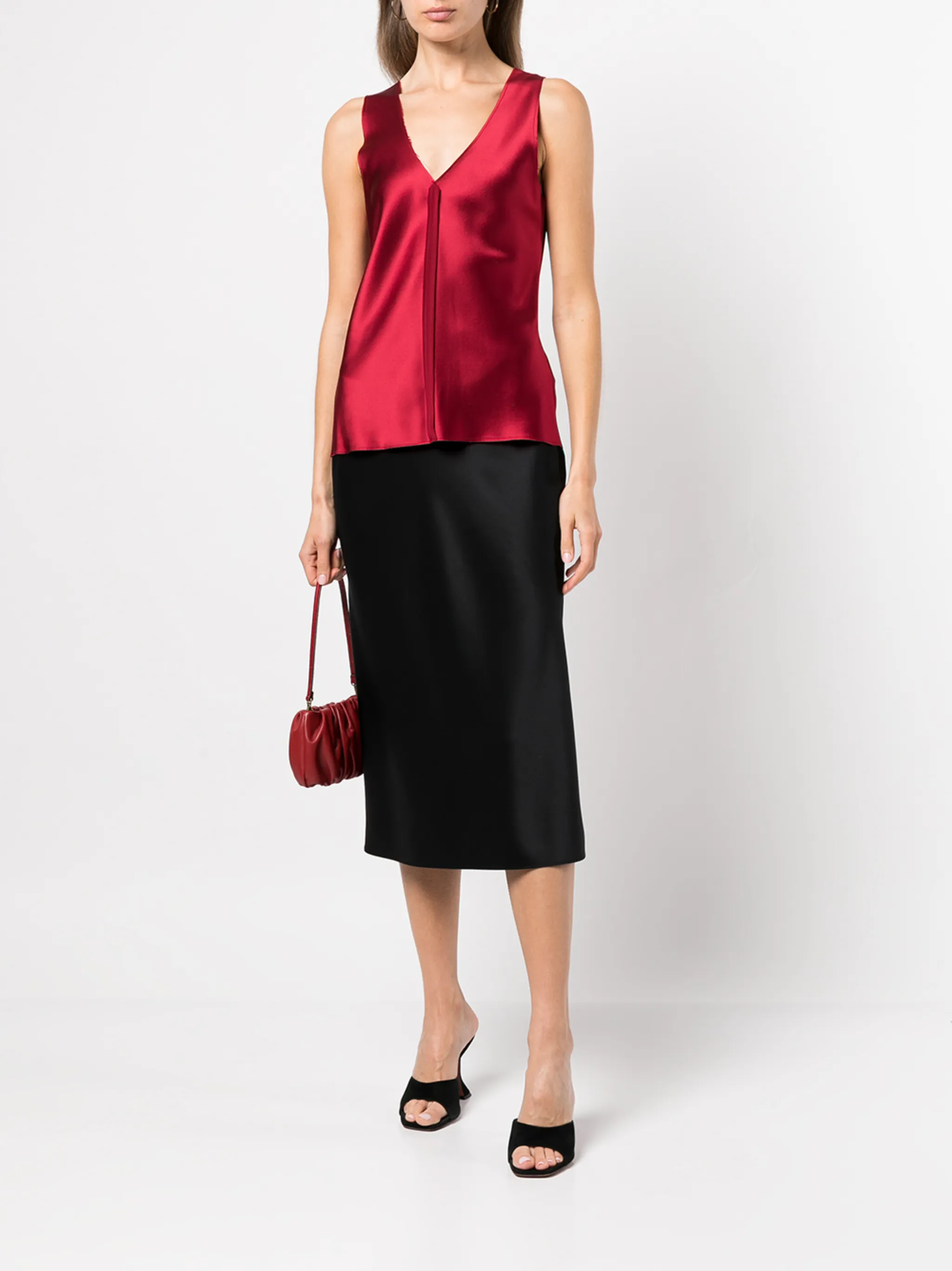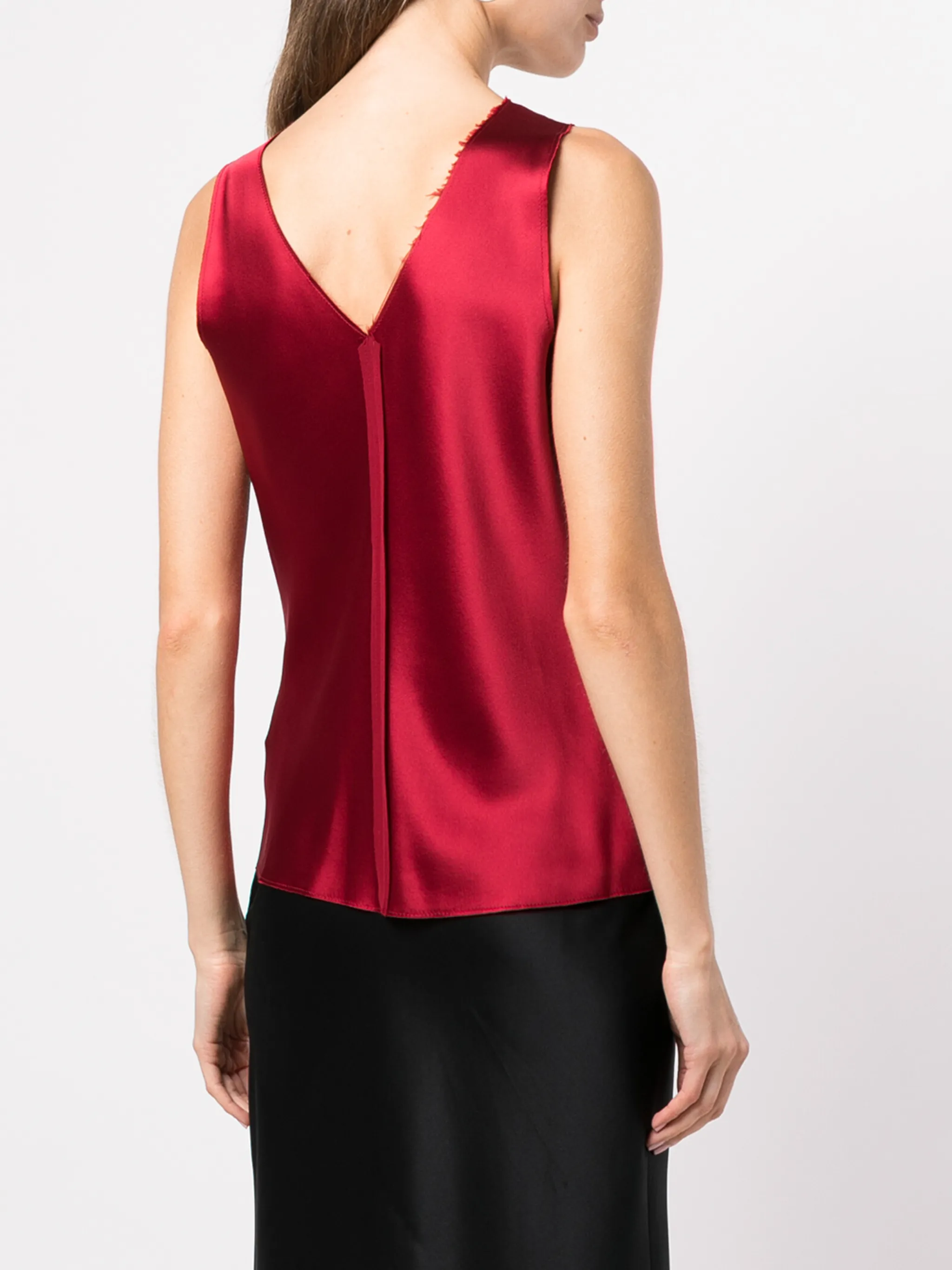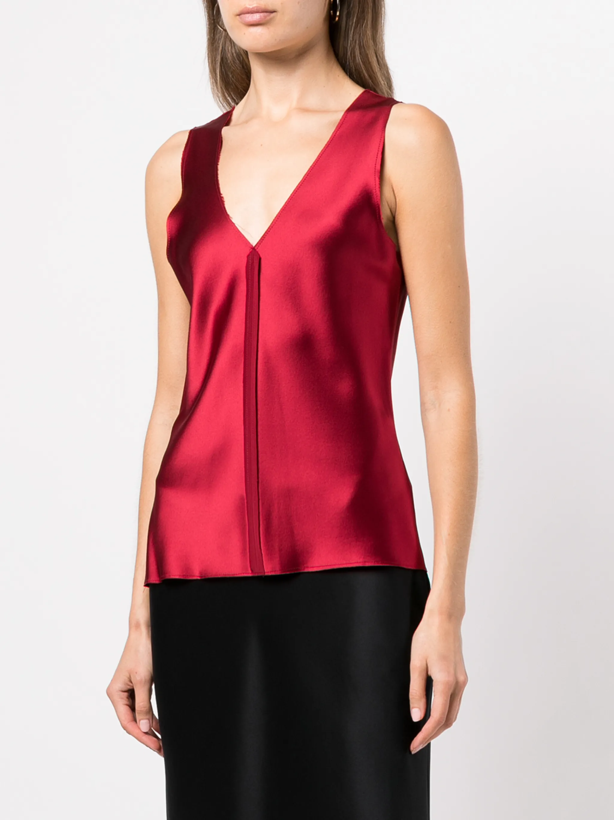 Красный, шелк, глубокий V-образный вырез, V-образный вырез сзади, без рукавов, прямой подол и необработанный подол.