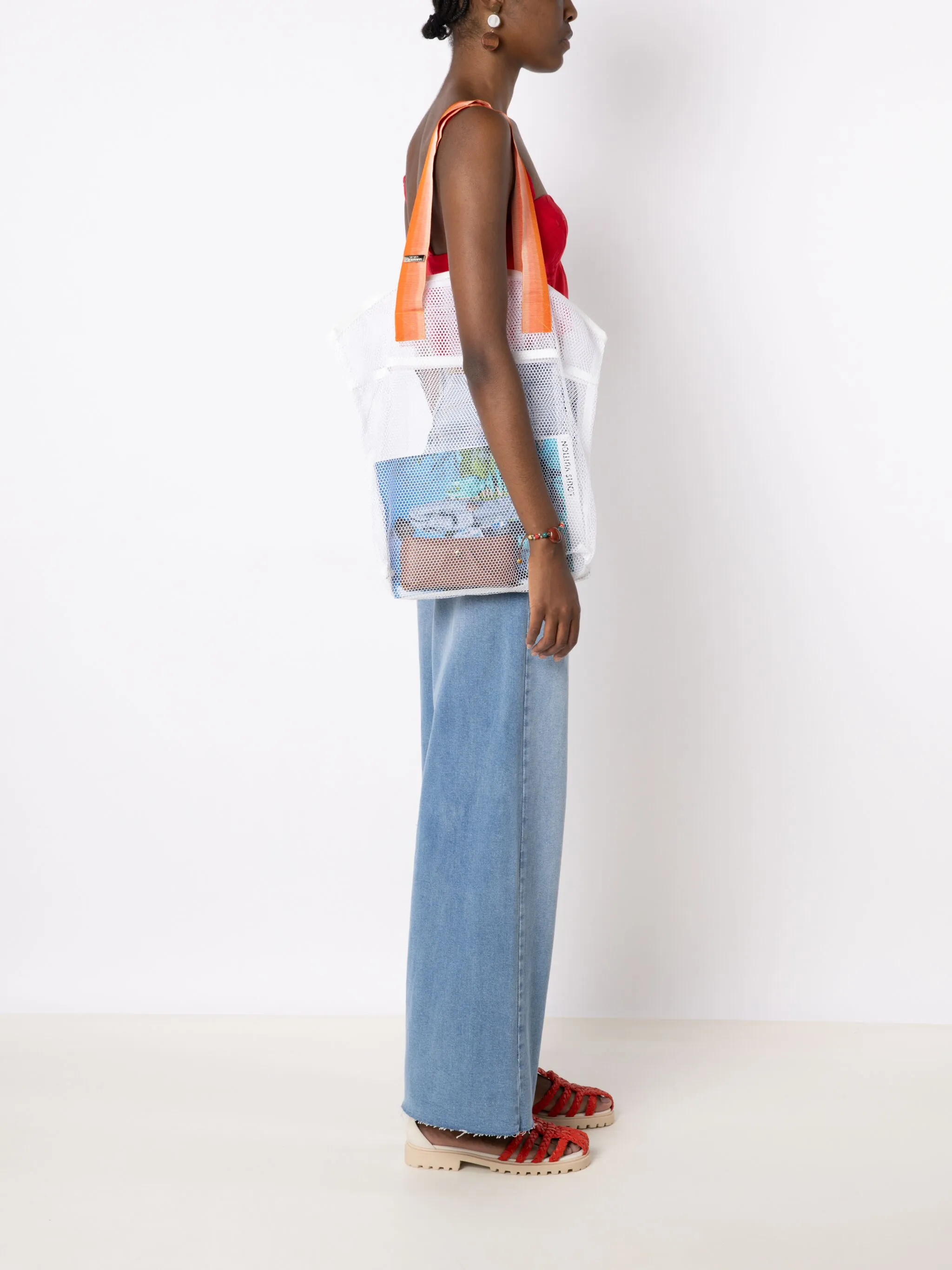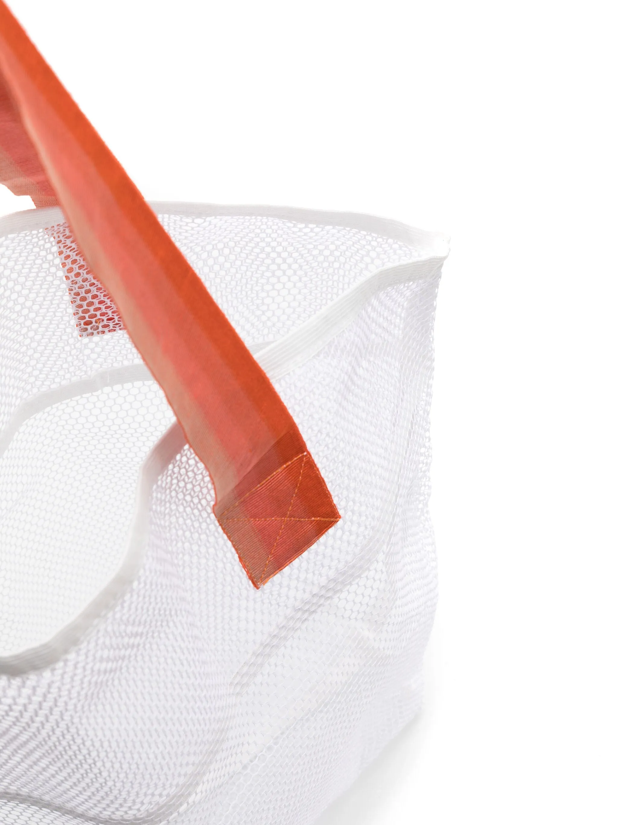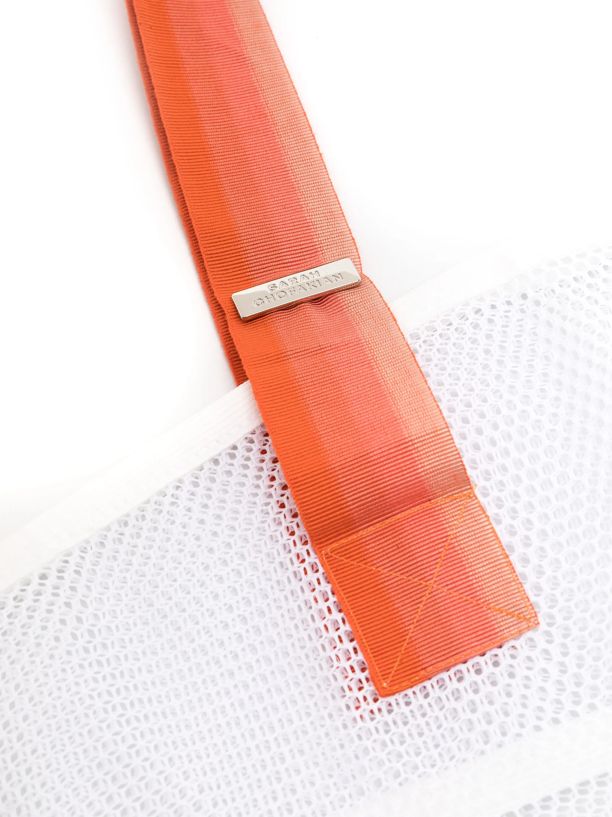 Кремовый, оранжево-красный, сетчатый дизайн, прозрачный материал, эффект омбре, серебристый металлический логотип, две плоские верхние ручки, дизайн с открытым верхом и основное отделение.