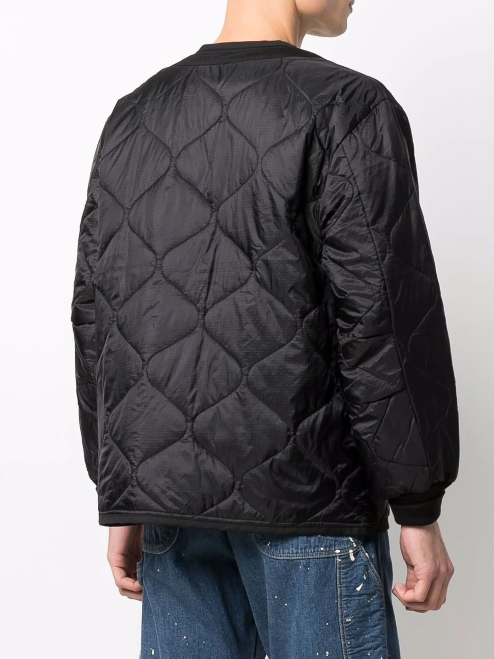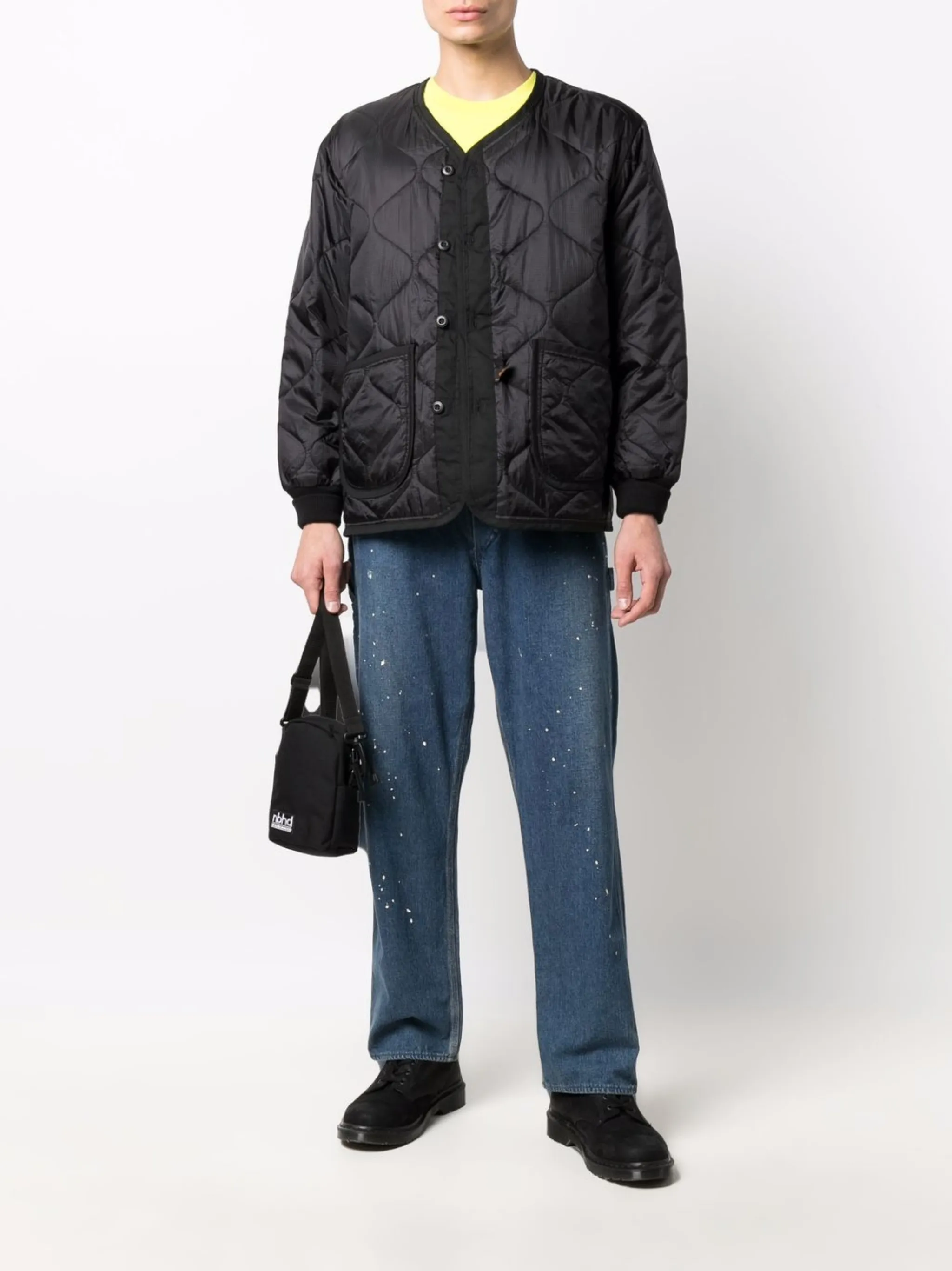 Стеганая модель, круглый вырез, застежка на кнопках спереди, два накладных кармана спереди, длинные рукава и прямой подол. Цвет: черный.