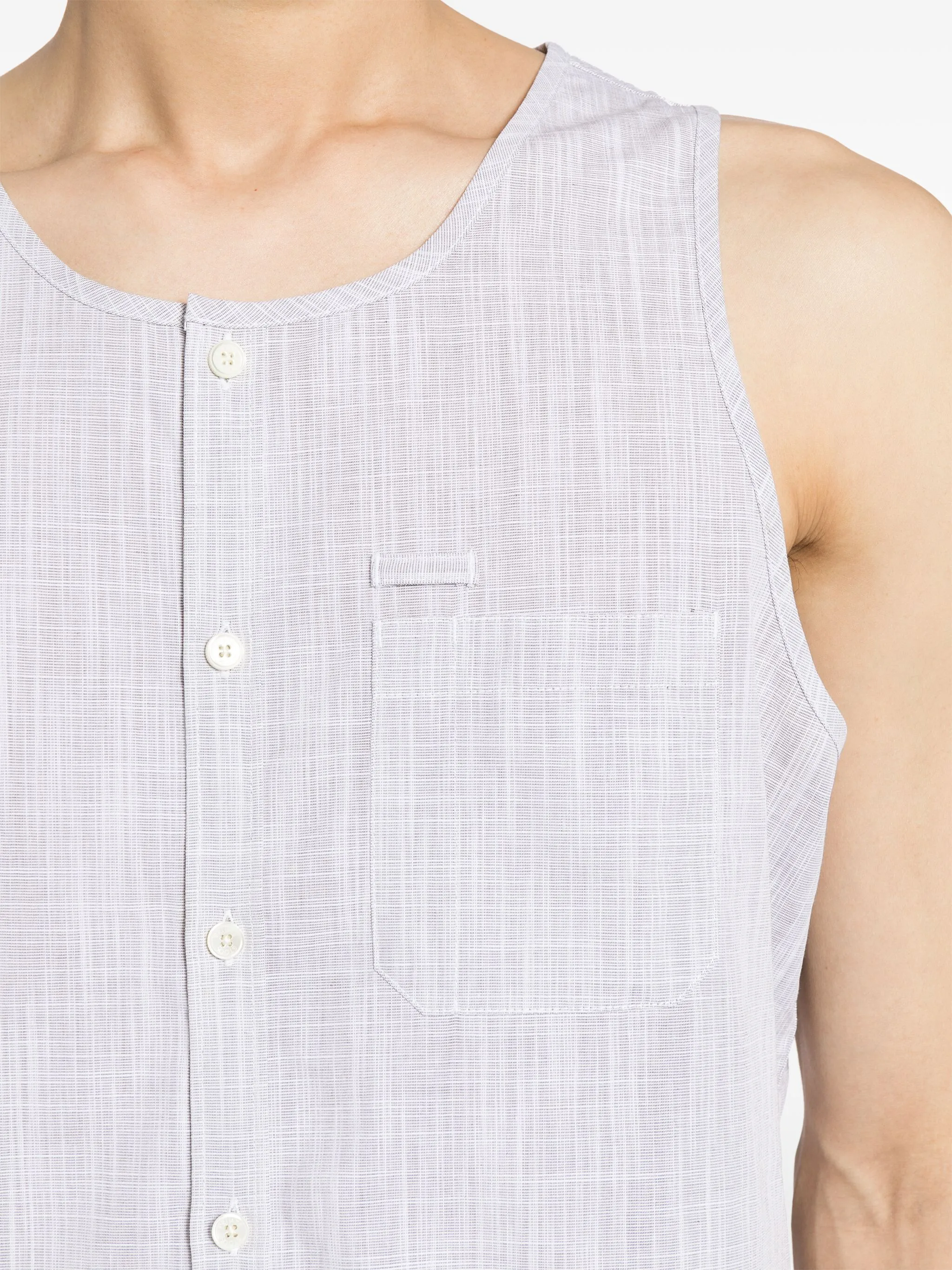 Кремовый, смесь хлопка и льна, переплетенный дизайн, круглый вырез, застежка на пуговицах спереди, без рукавов, нагрудный накладной карман и закругленный подол.
