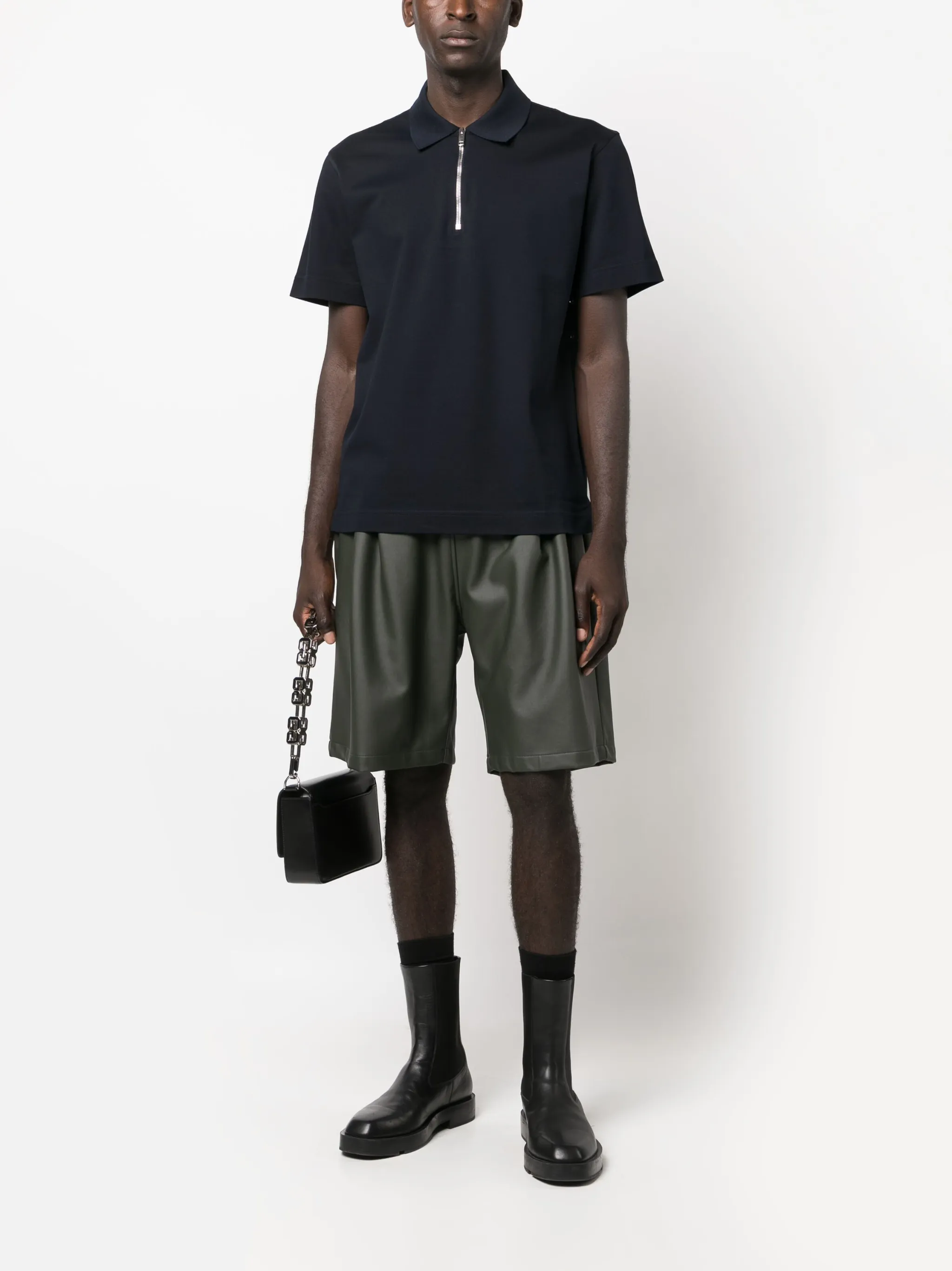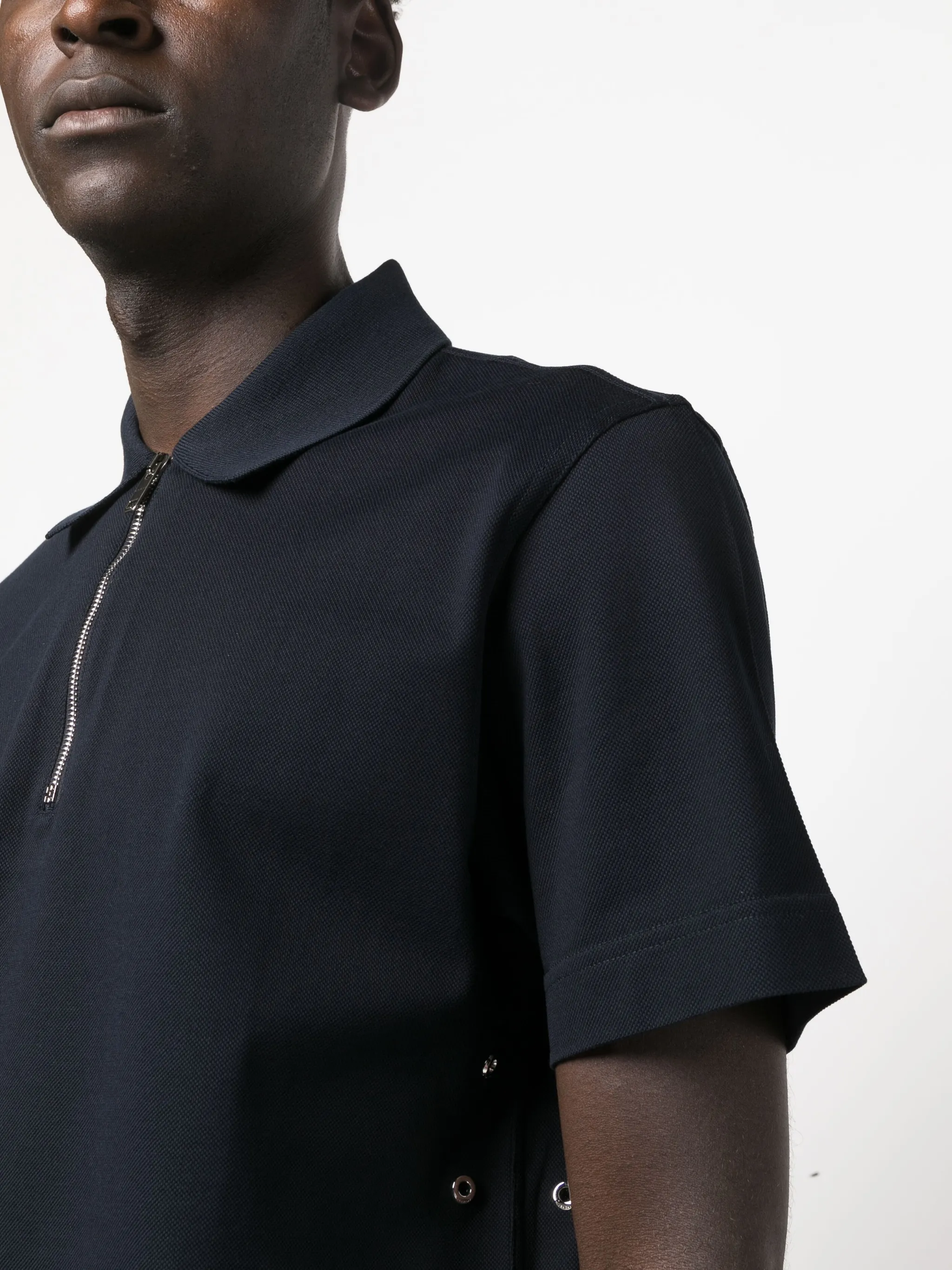 Темно-синий, хлопок, ткань пике, воротник поло, застежка на молнии спереди, короткие рукава и прямой подол.