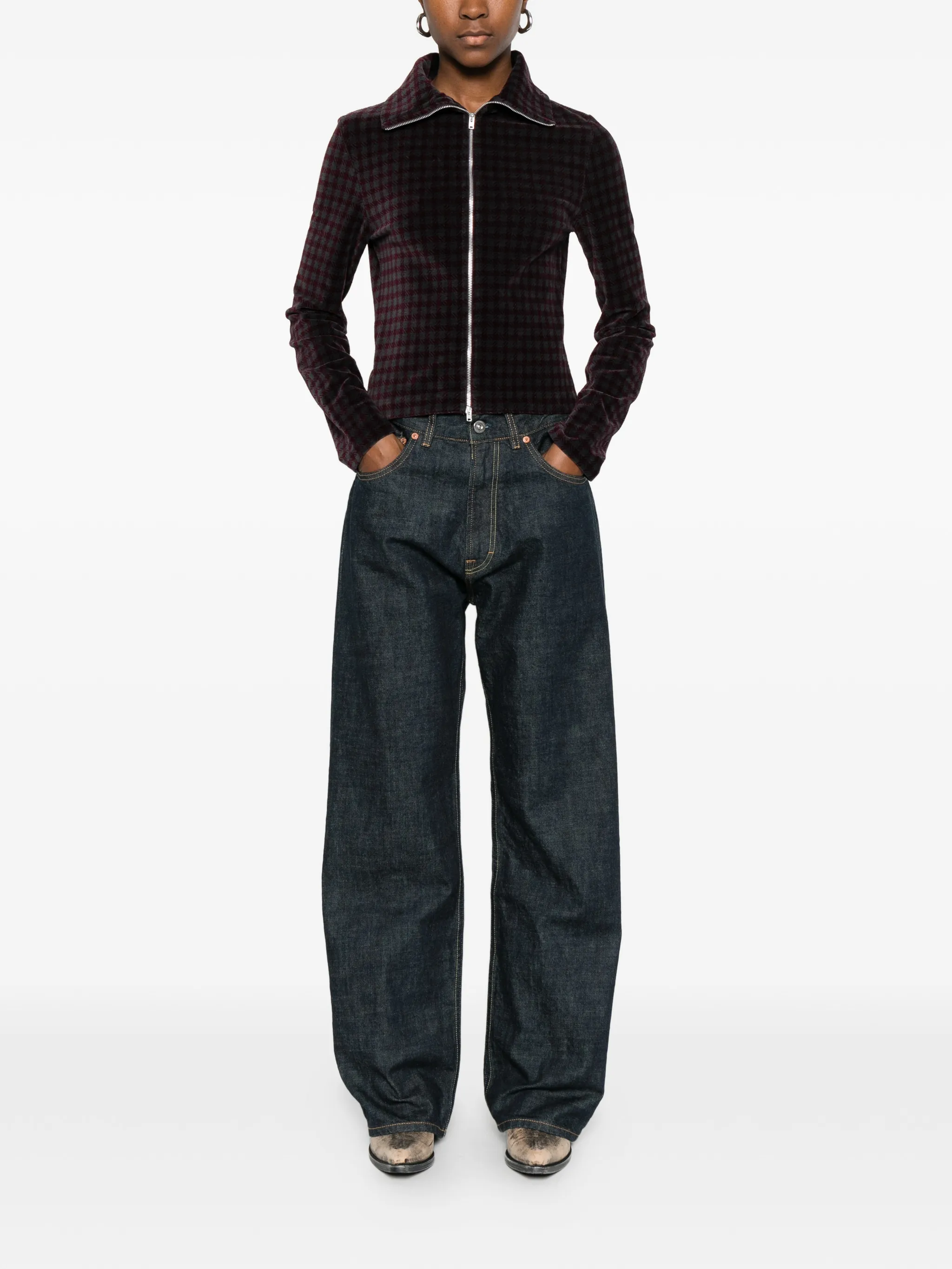 Длинные рукава с застежкой на молнию, в серо-фиолетовую клетку