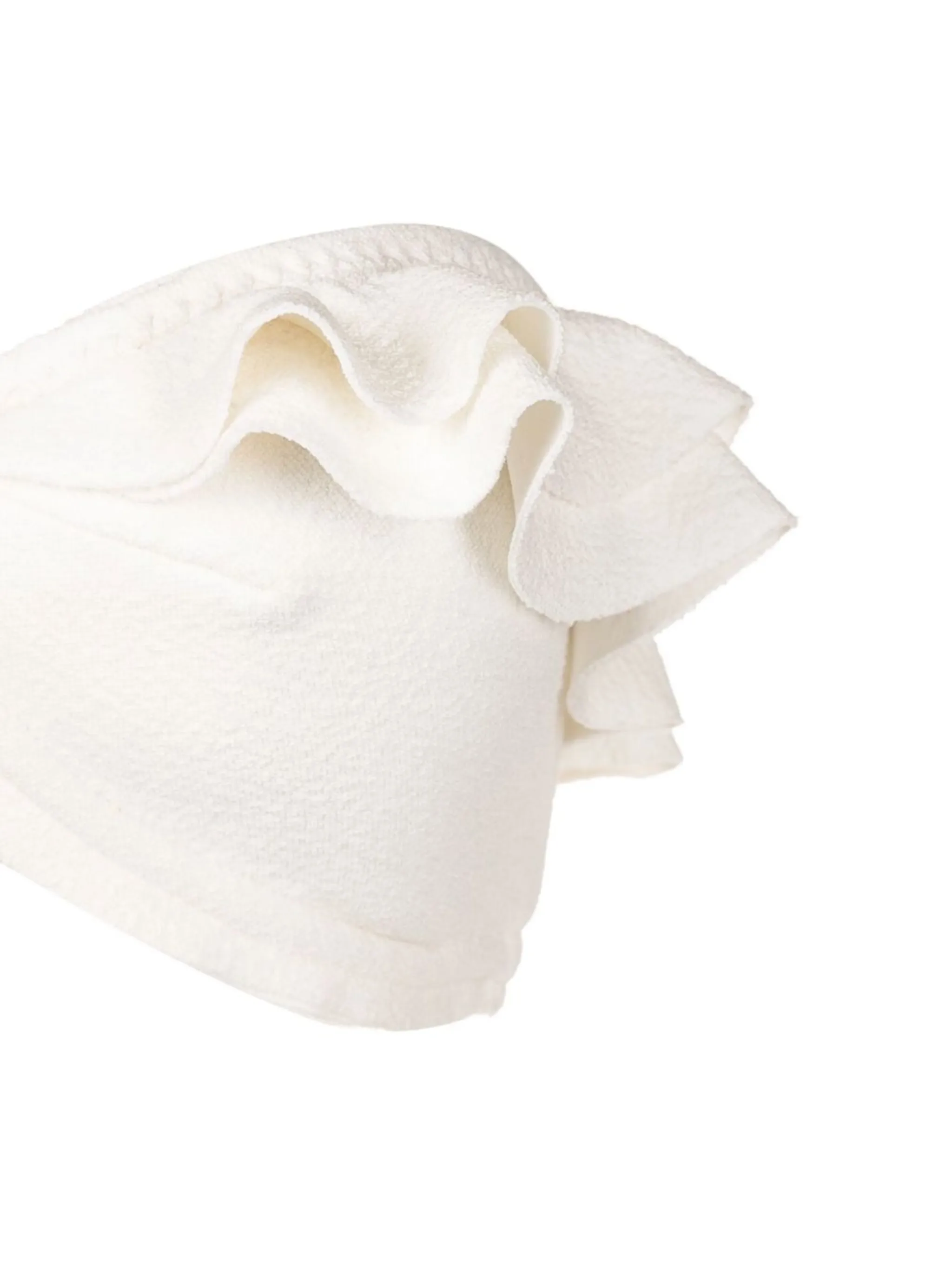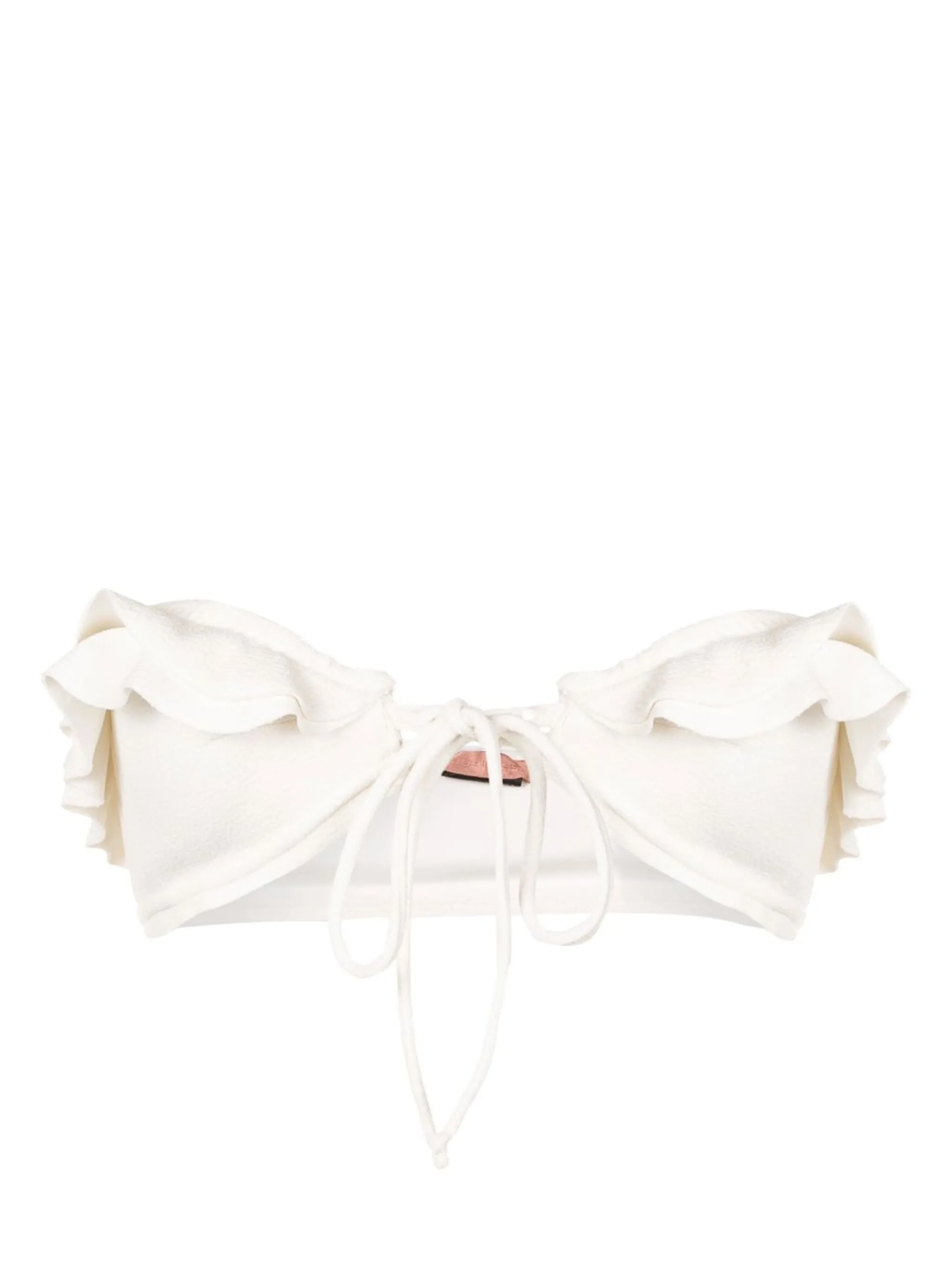 Белый, эластичный материал, без рукавов, модель бандо, завязки спереди, края с фестонами и присборенный воротник.