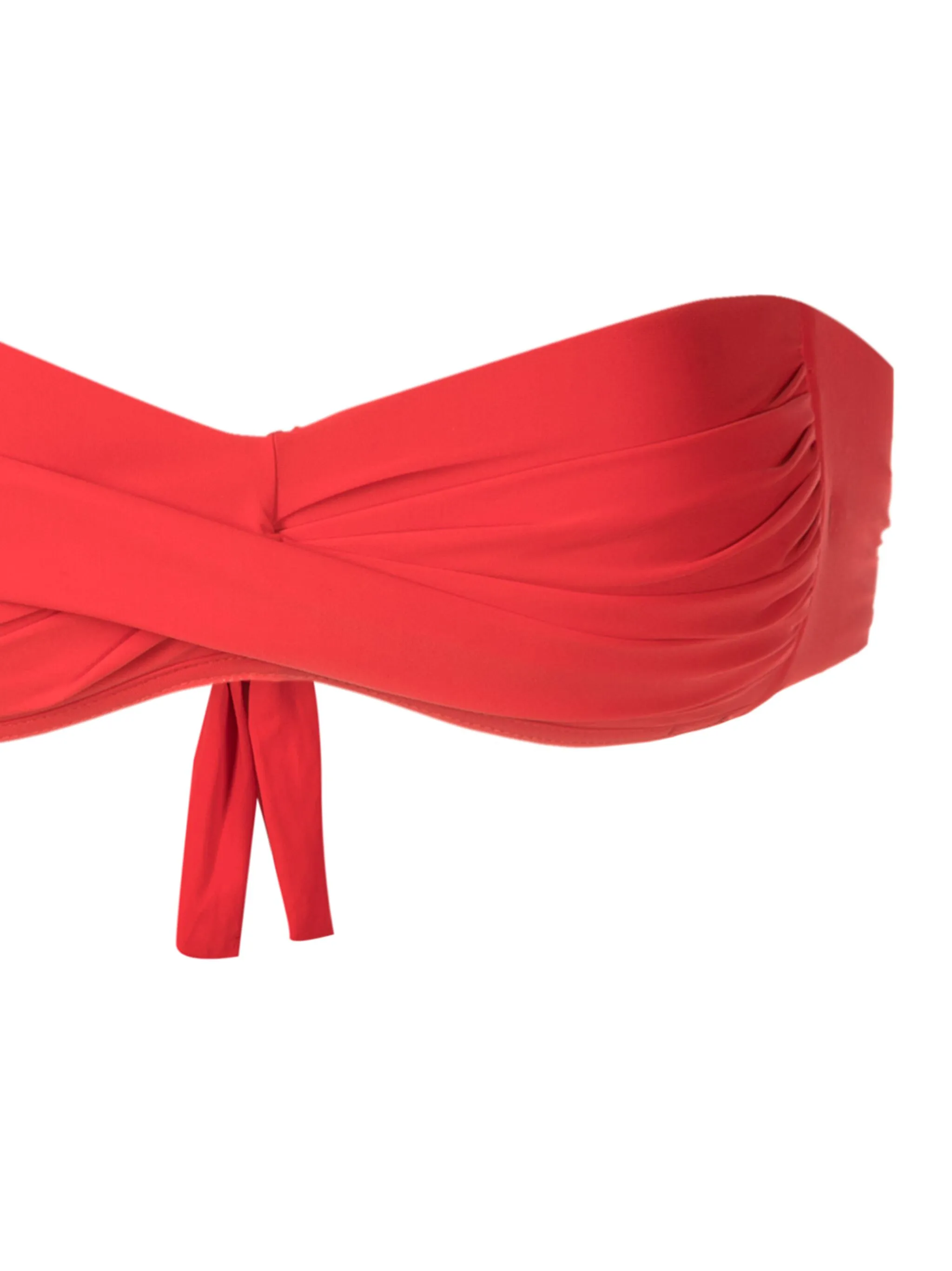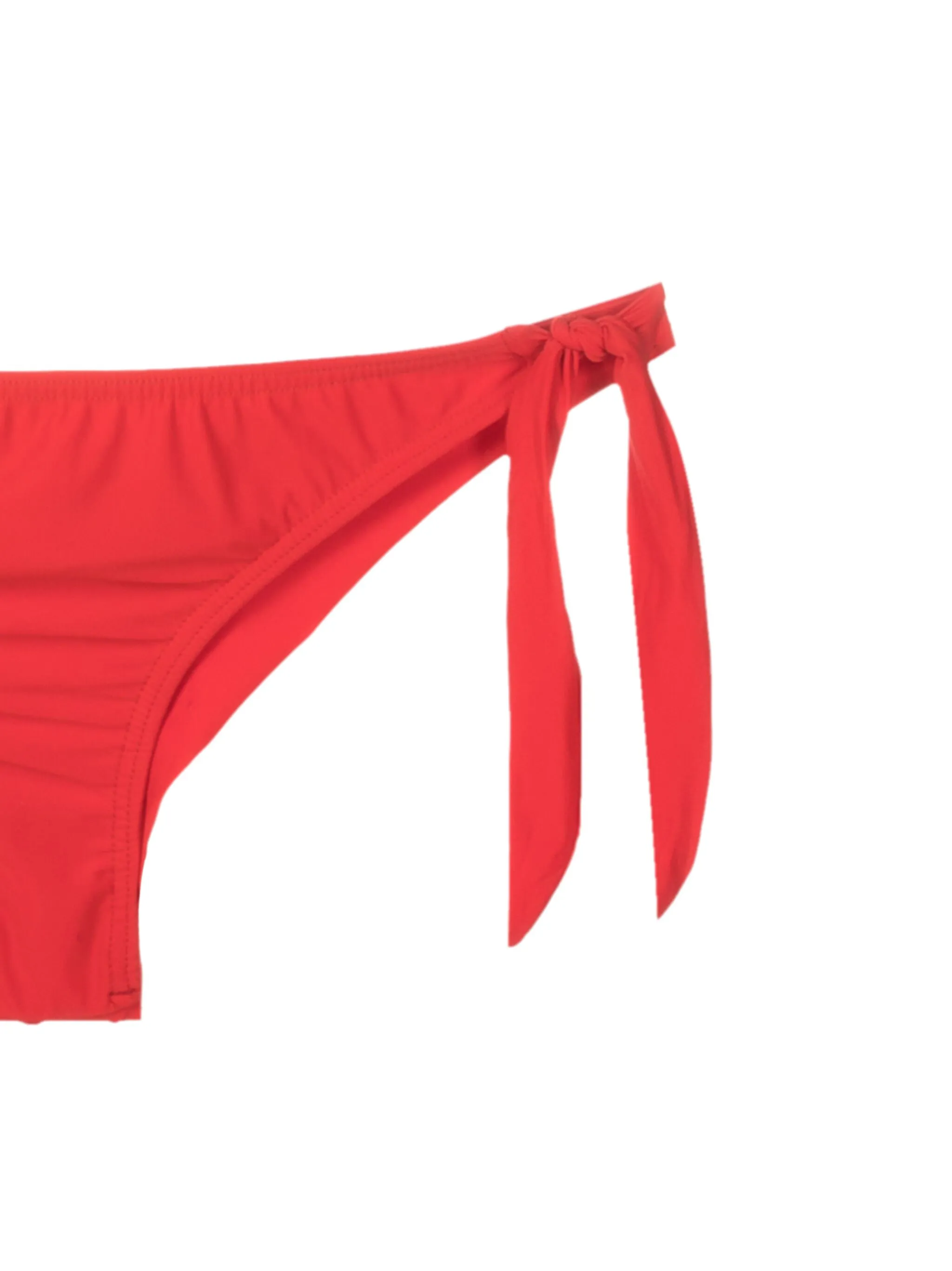 Эластичный материал, перекрученная деталь, без бретелей, застежка на завязке сзади и плавки бикини с завязками по бокам.