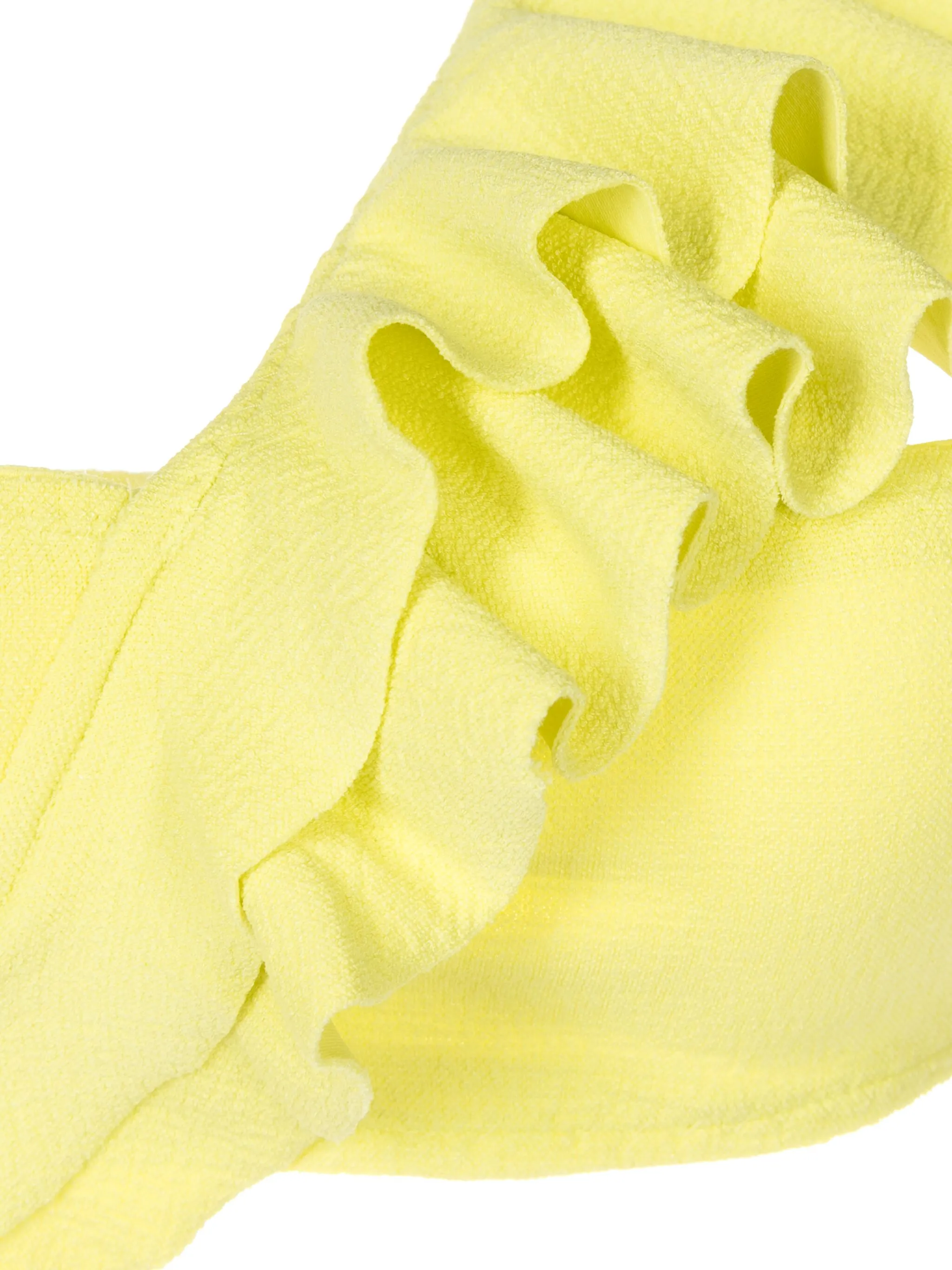 Желтый цитрон, эластичный материал, фактурная отделка, строчка в тон, вставки с оборками, модель на одном плече и модель без застежки.