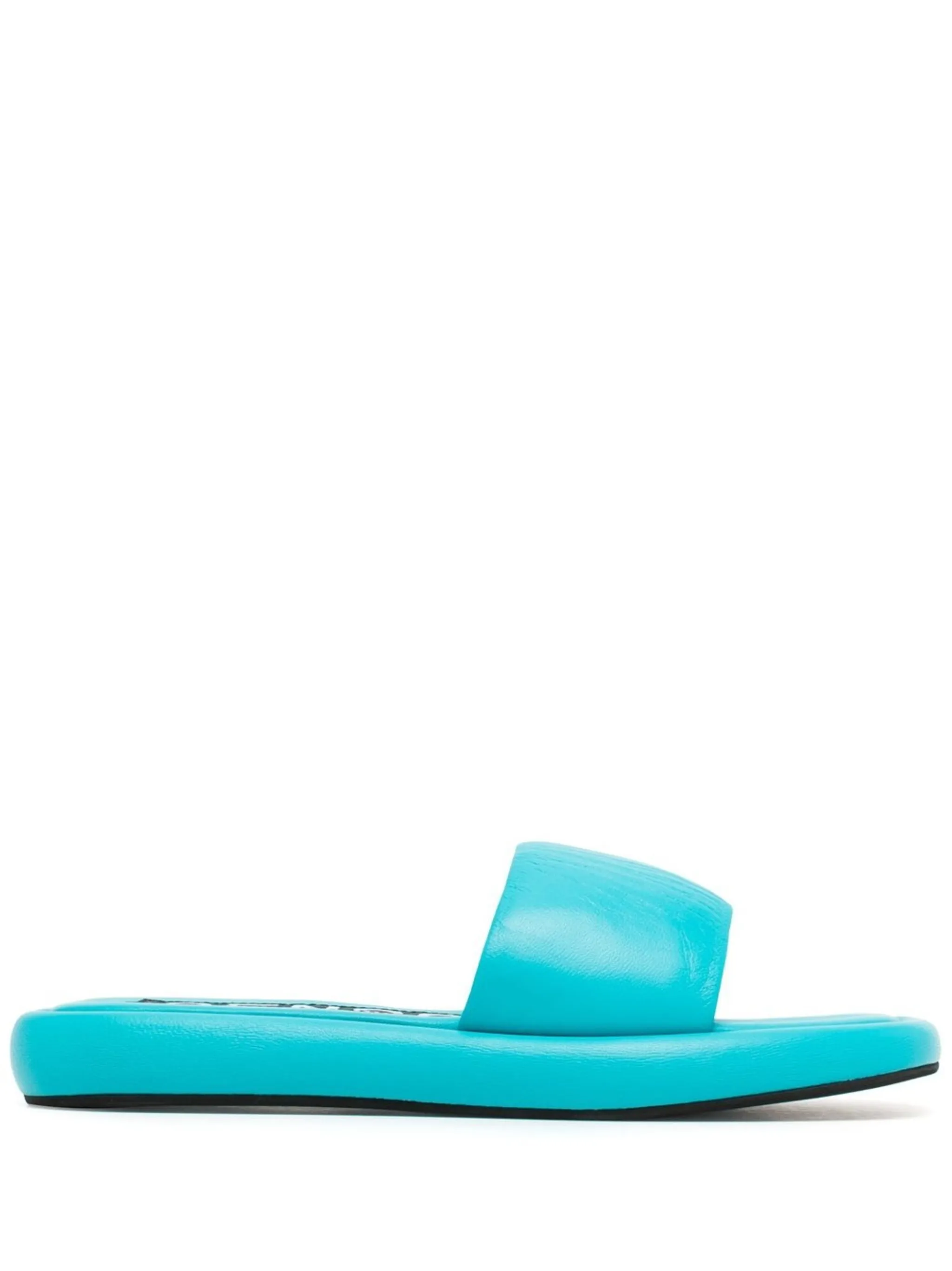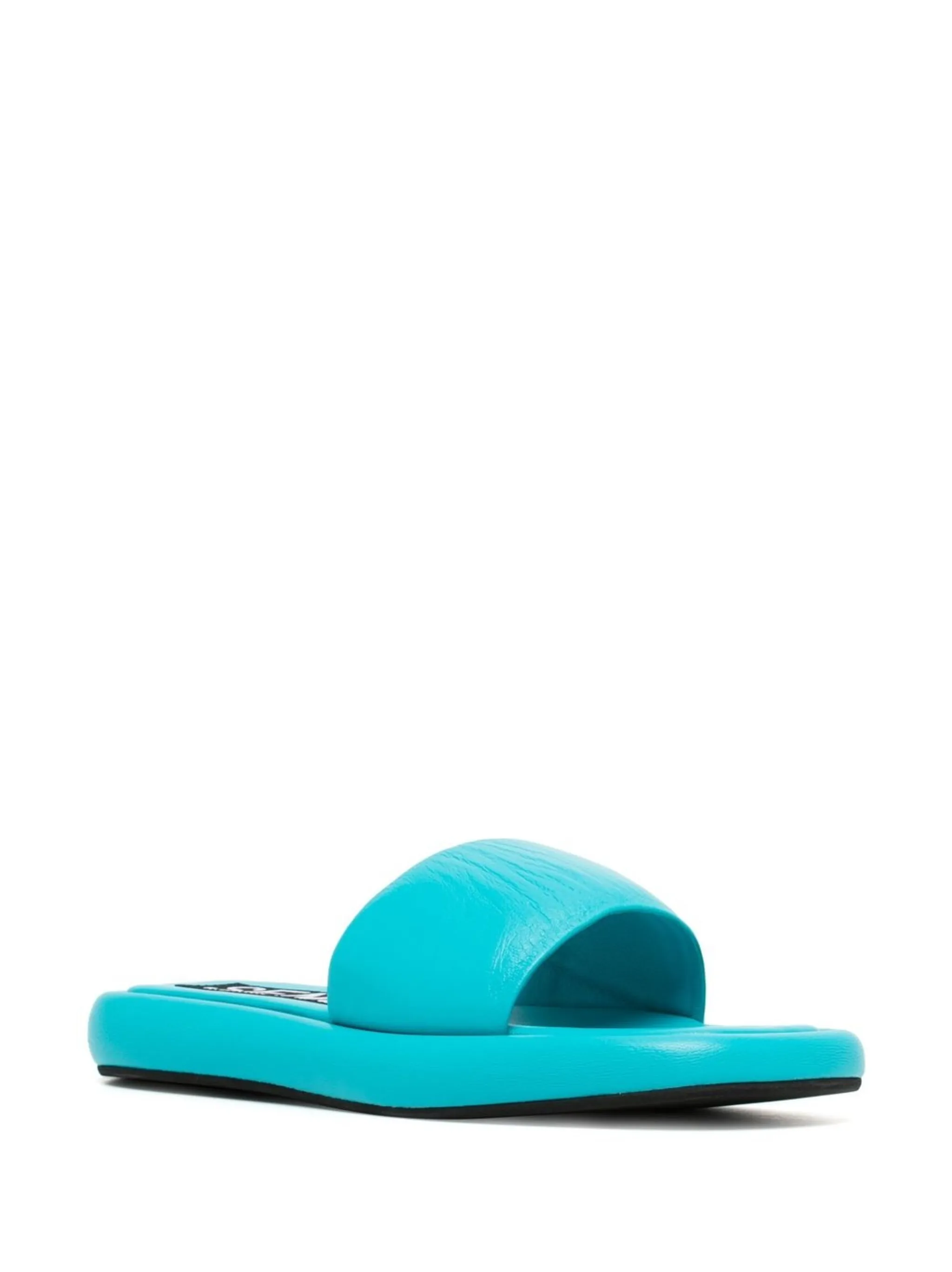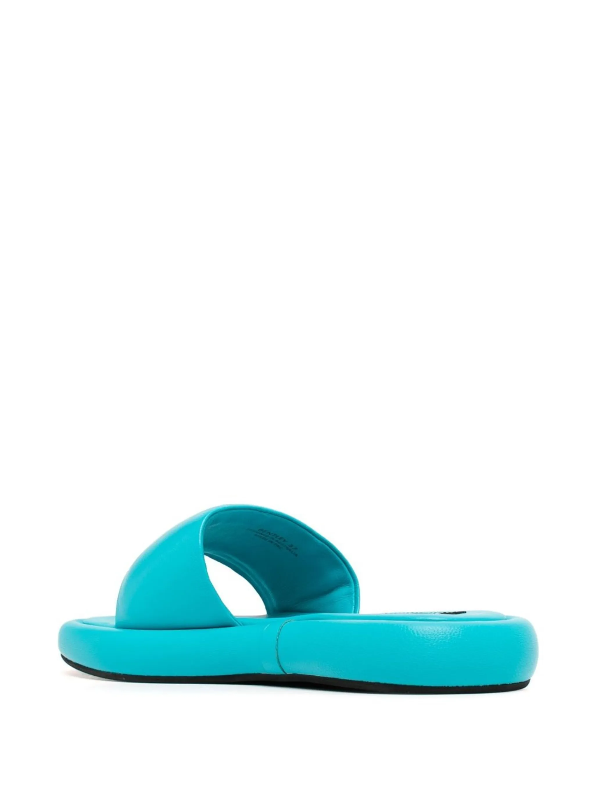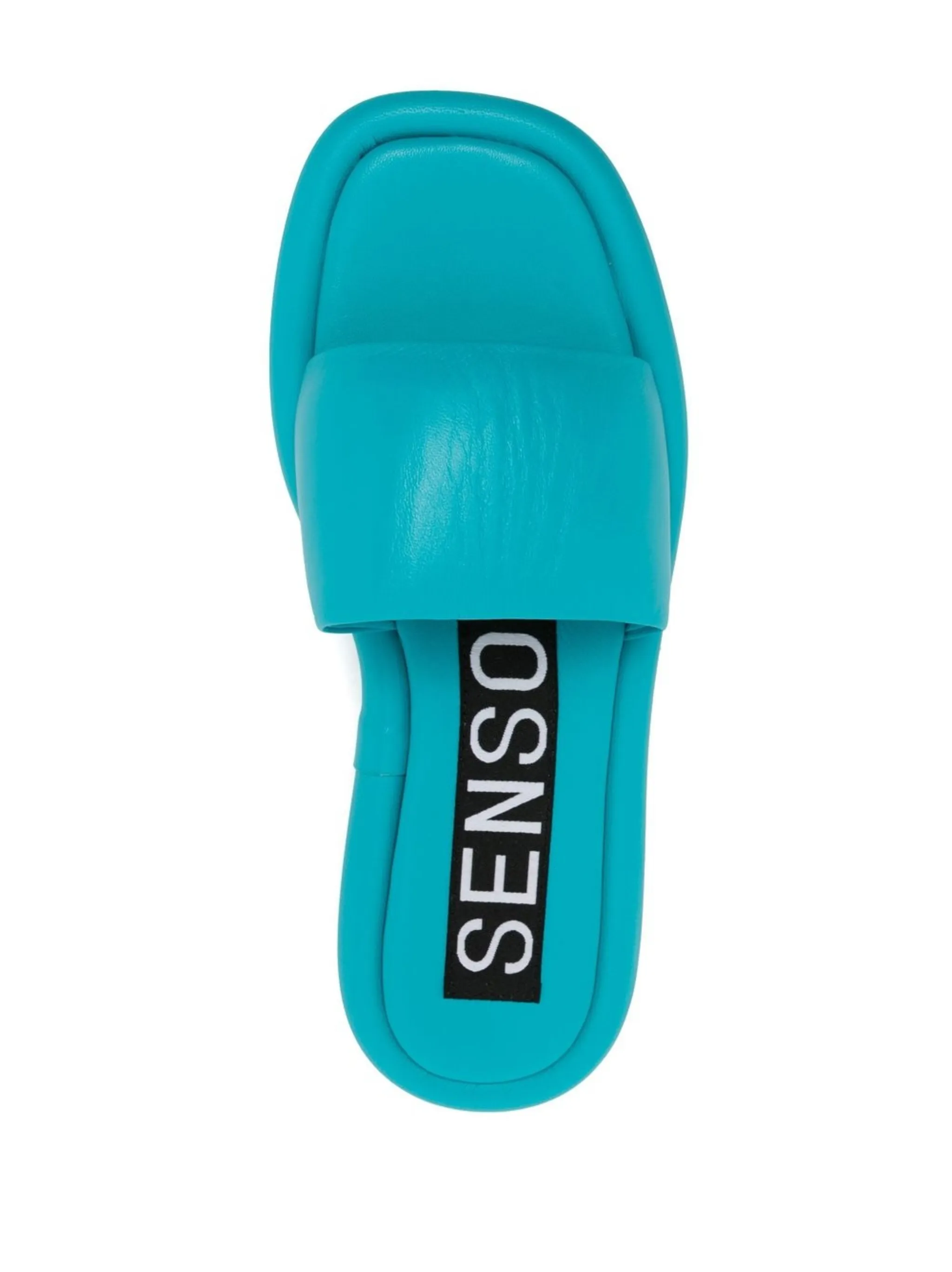 Сине-зеленый, кожа, открытый носок, ремешок на палец и кожаная стелька с логотипом.