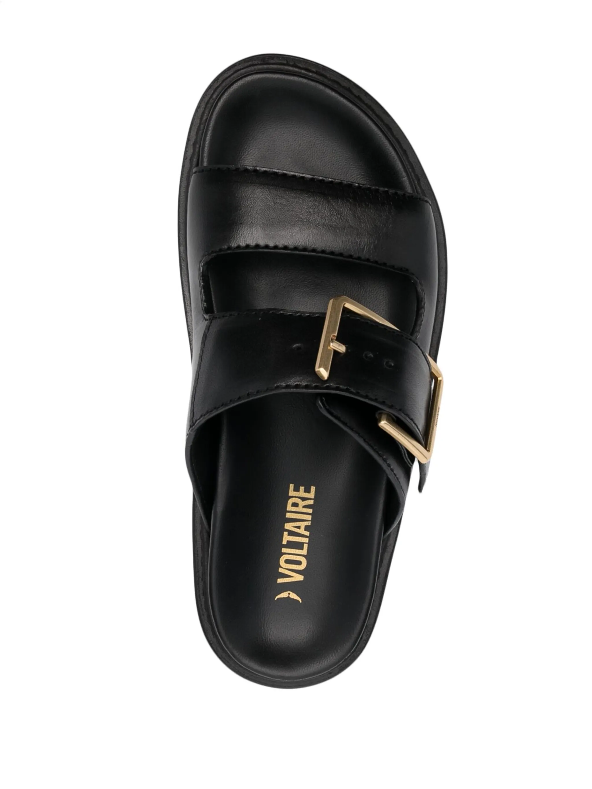 Черный, телячья кожа, золотистая фурнитура, застежка на пряжке, браслет в два оборота, открытый носок, формованная стелька, кожаная стелька с логотипом и плоская резиновая подошва.