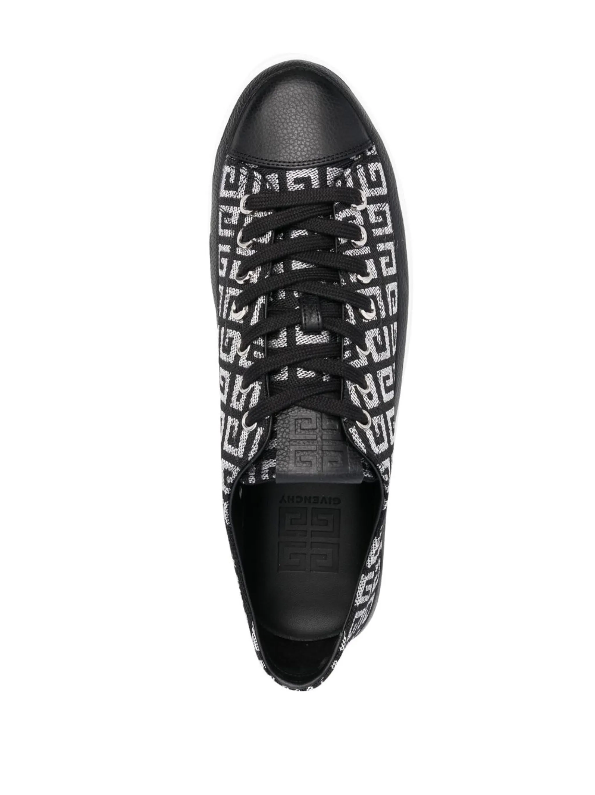 Черный, белый, кожа, монограмма, шнуровка спереди, закругленный носок, плоская резиновая подошва и стелька с логотипом.