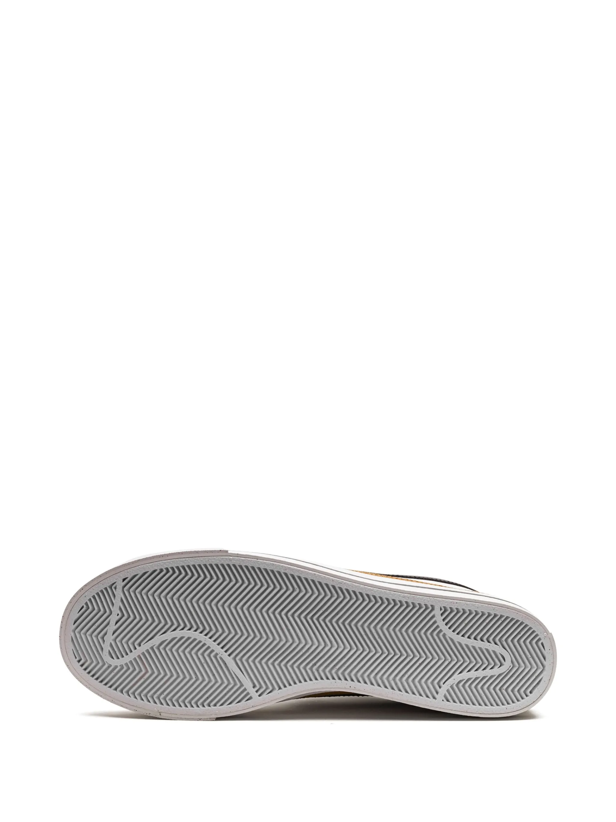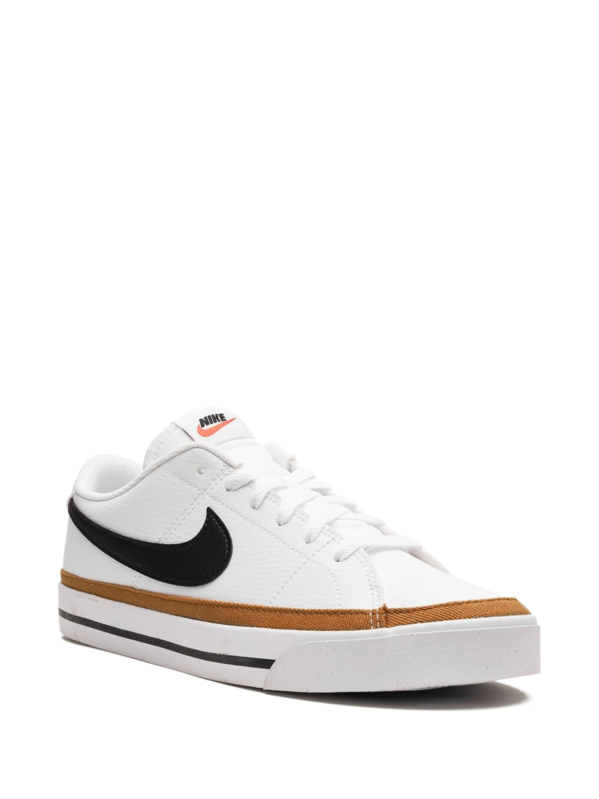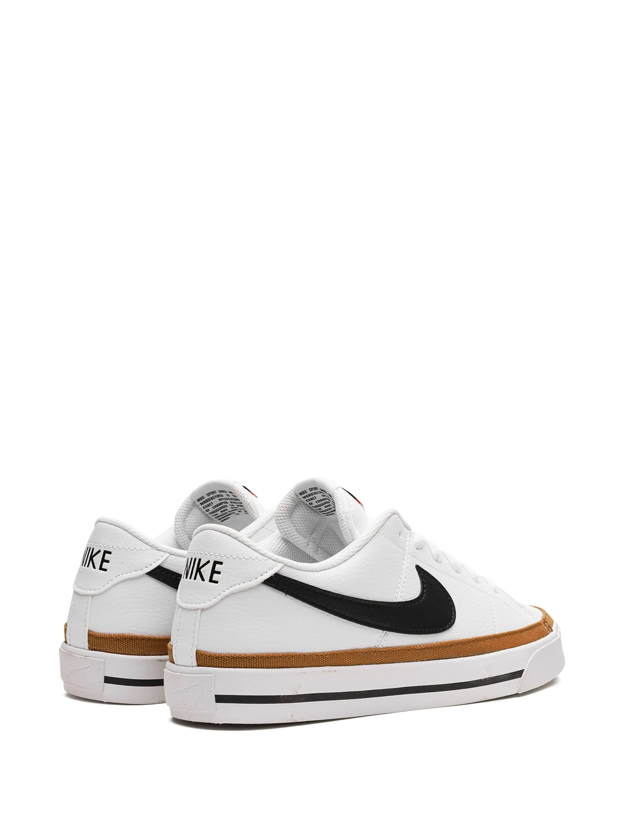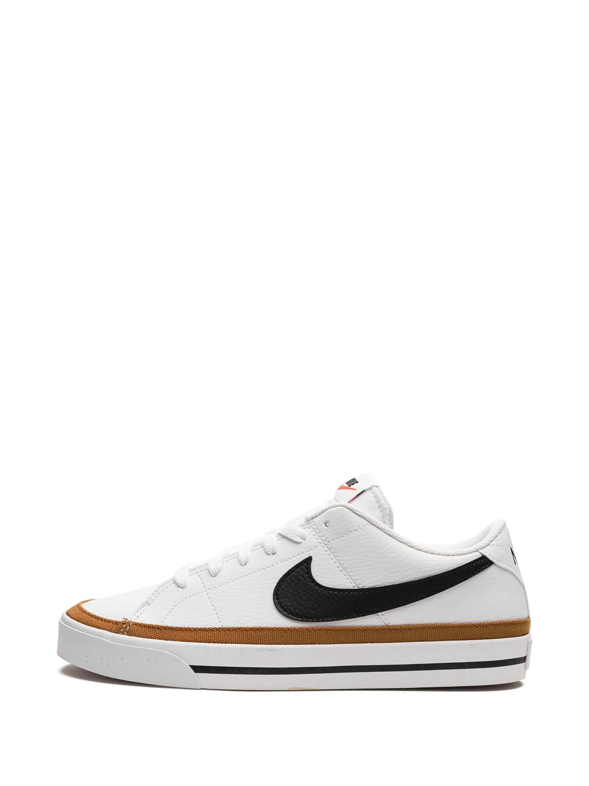 Черный/белый, желтая охра, кожа, логотип Nike Swoosh, закругленный носок, шнуровка спереди, стелька с логотипом и плоская резиновая подошва.