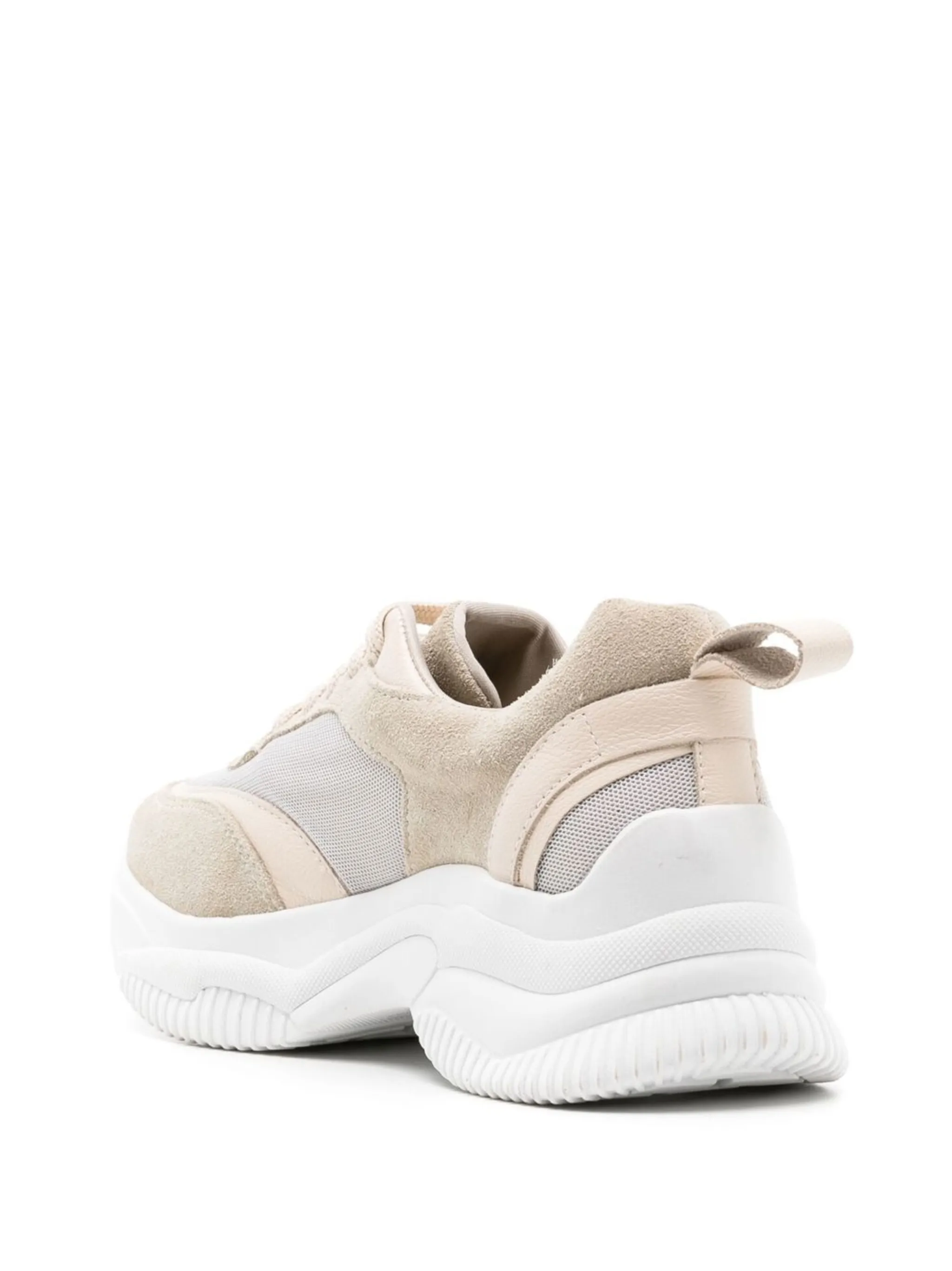 Светло-бежевый, светло-серый, кремовый, кожа, вставки, нашивка с логотипом на язычке, закругленный носок, шнуровка спереди, стелька с логотипом, петля для подтягивания сзади и массивная резиновая подошва.