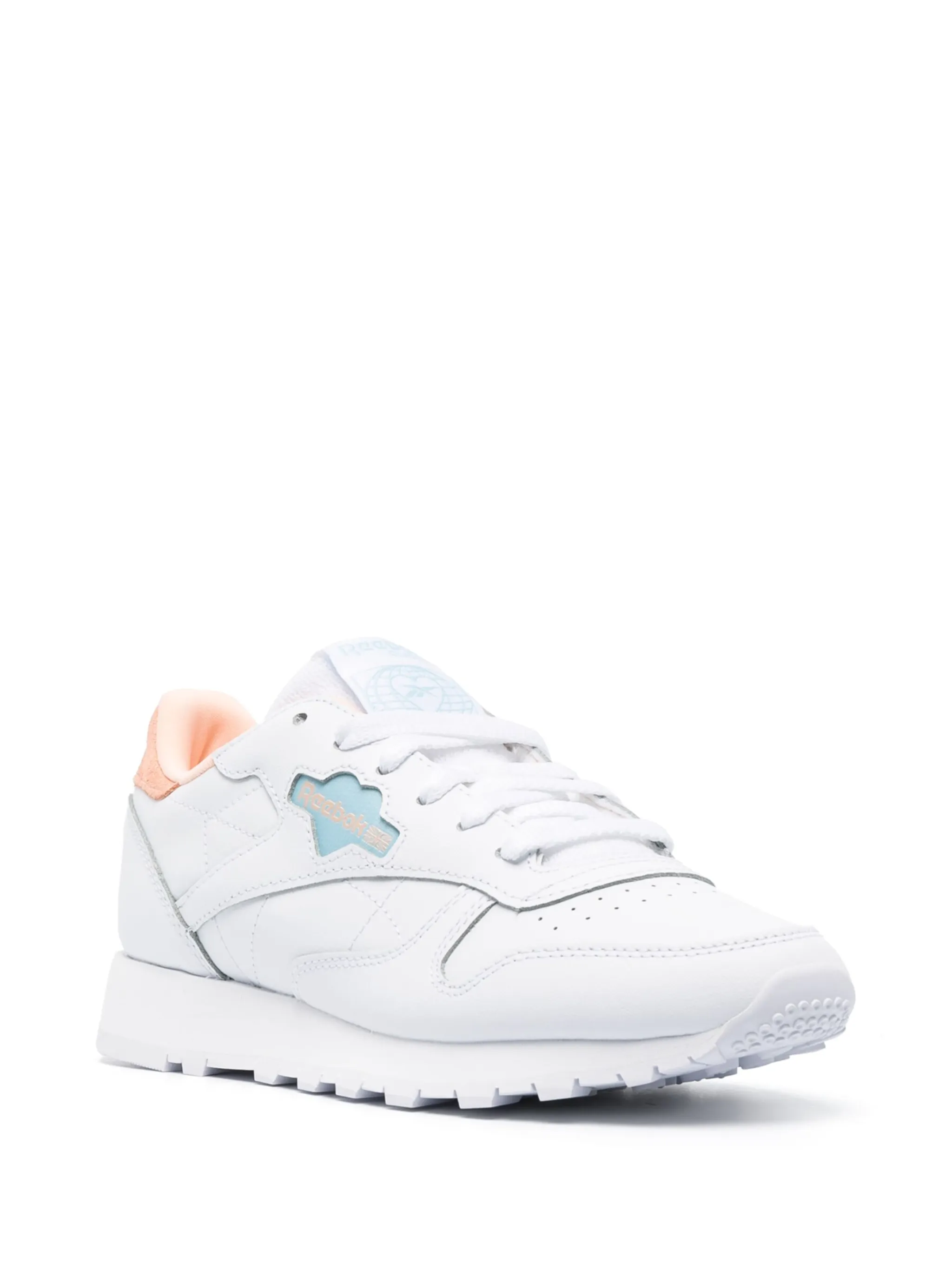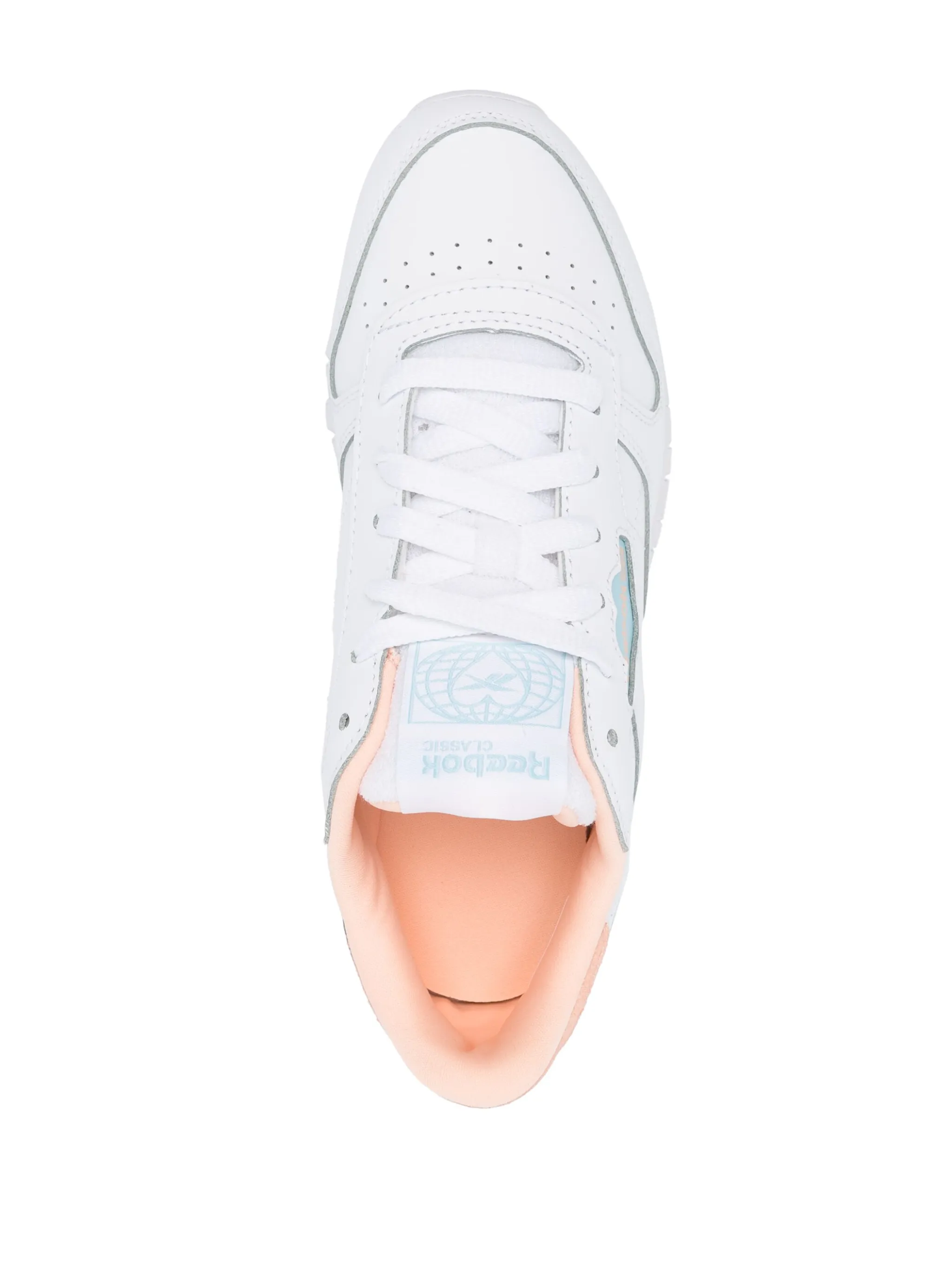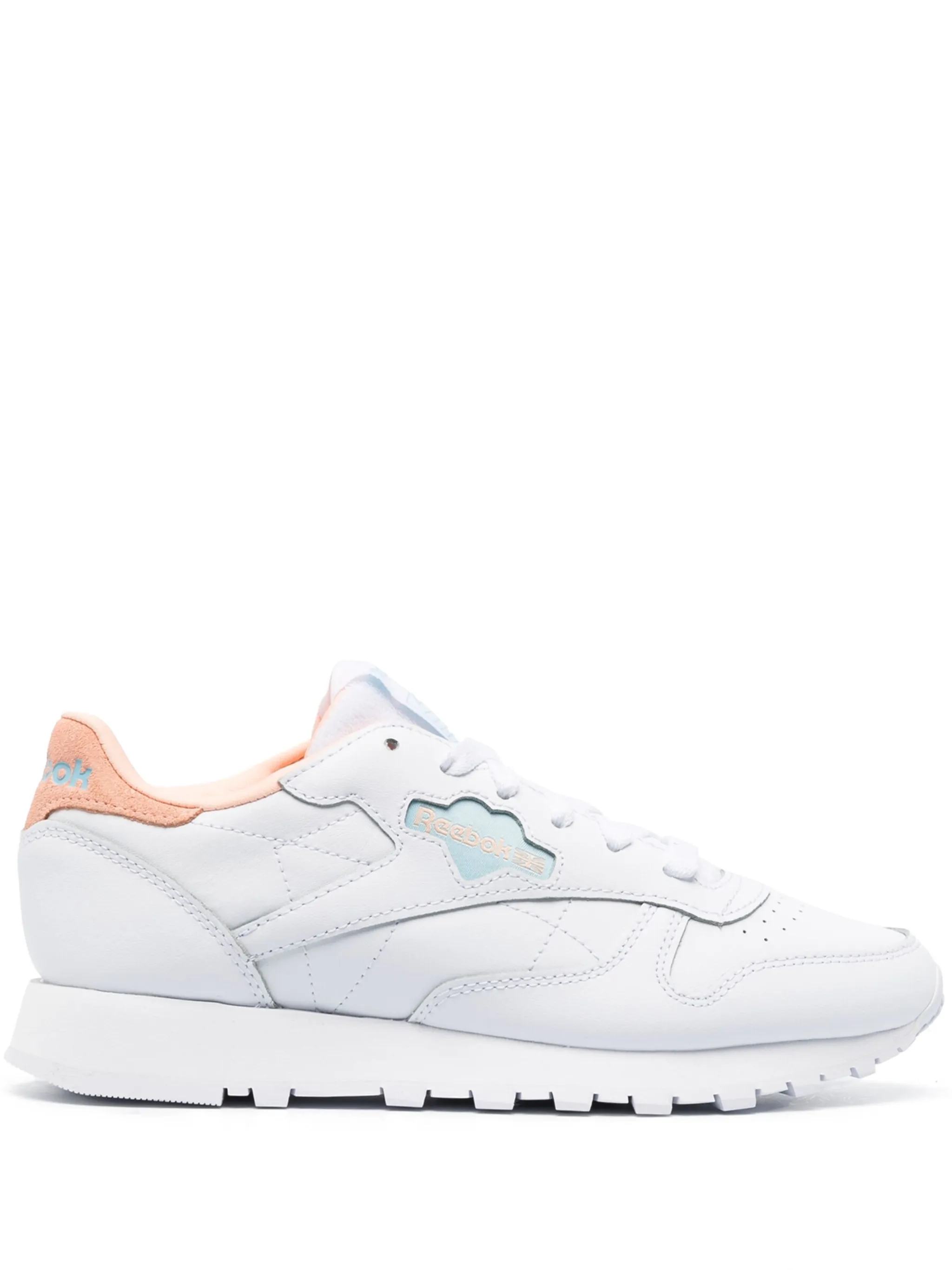 Расцветка Cloud White, голубой, персиково-оранжевый, телячья кожа, вставки, нашивка с логотипом на язычке, логотип сбоку, миндалевидный носок, шнуровка спереди, контрастный задник с логотипом и плоская резиновая подошва.
