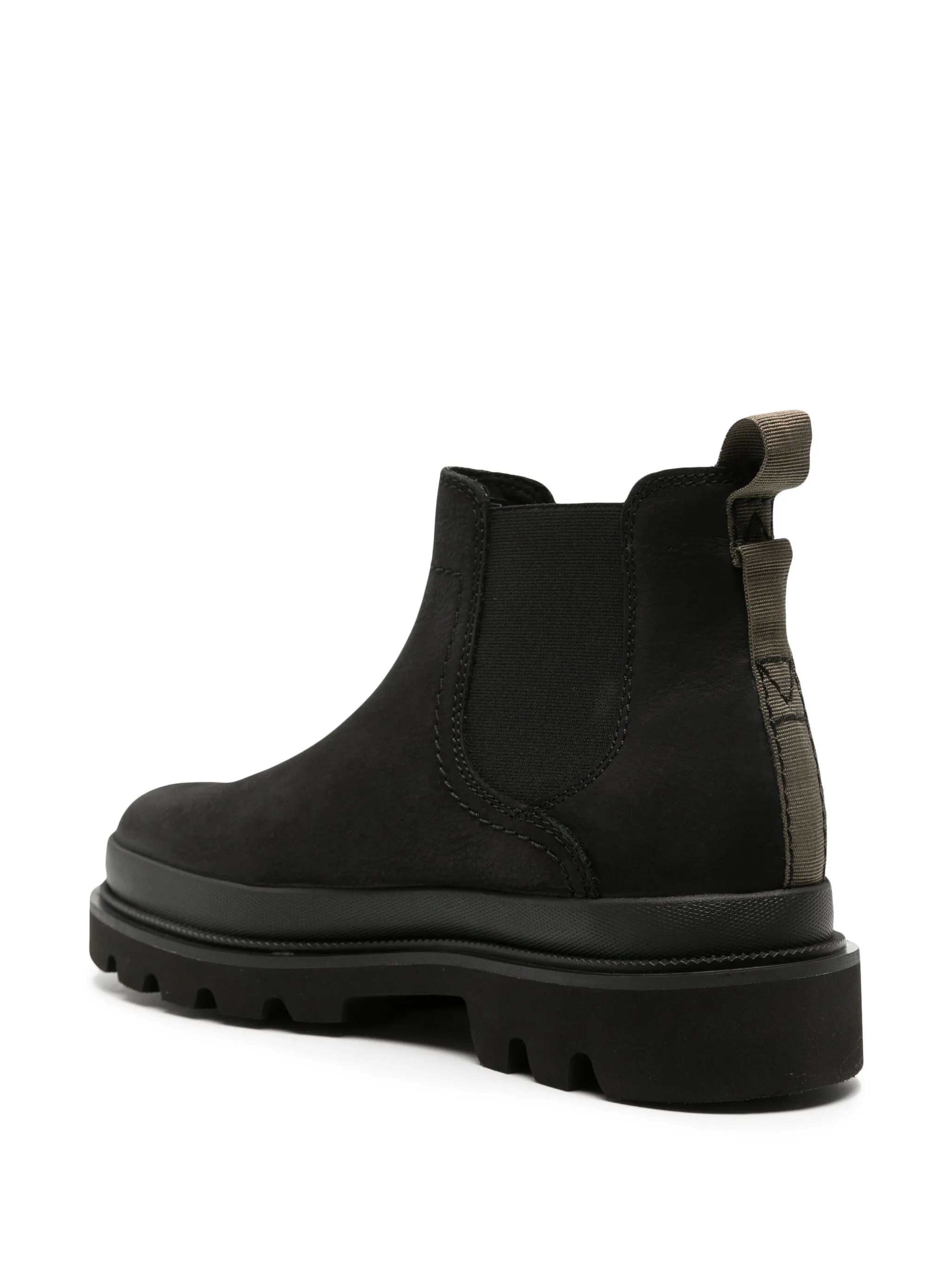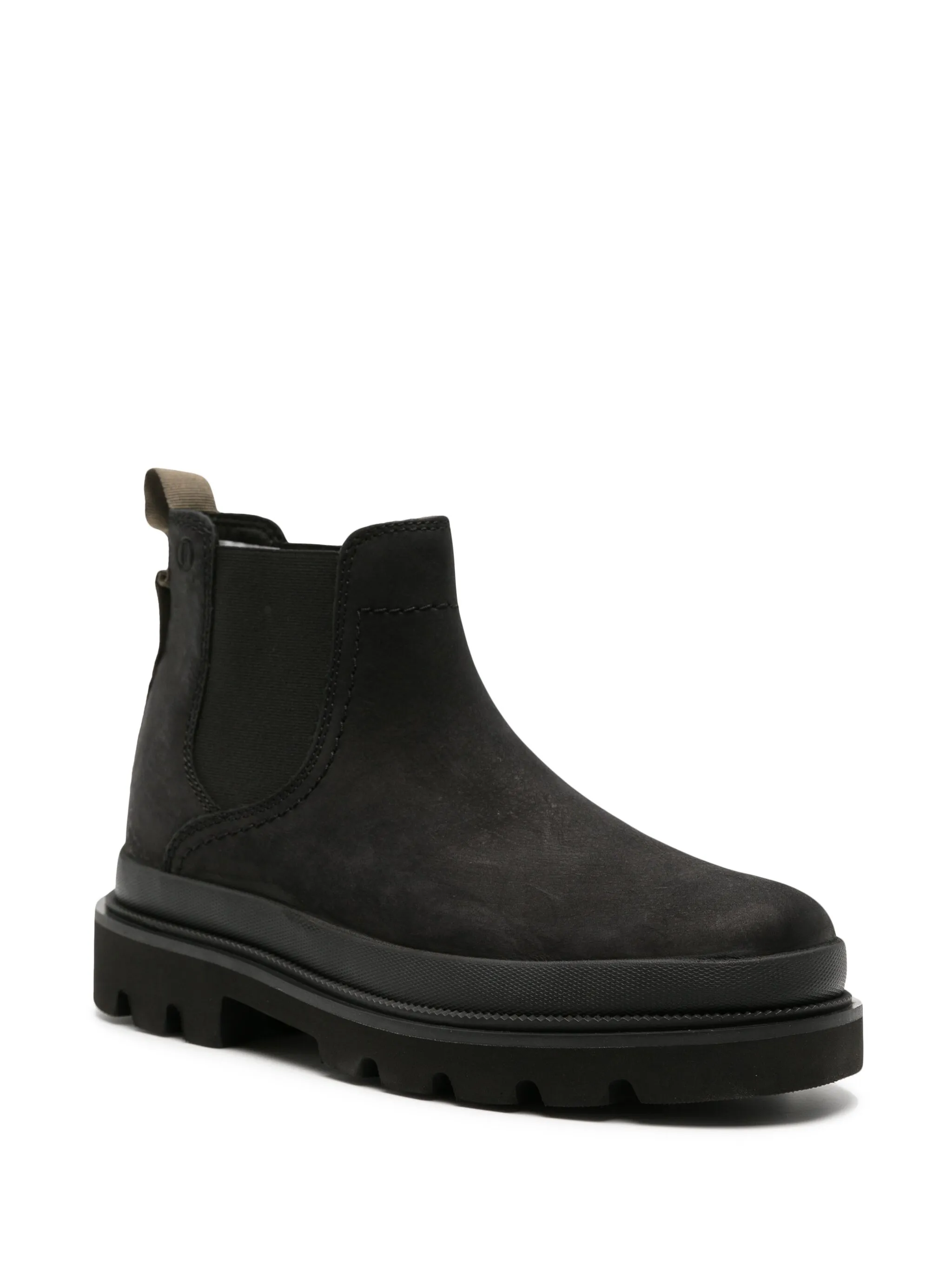 Черный, телячья кожа, замша, петля для подтягивания сзади, эластичные боковые вставки, закругленный носок, модель без застежки и рифленая резиновая подошва.