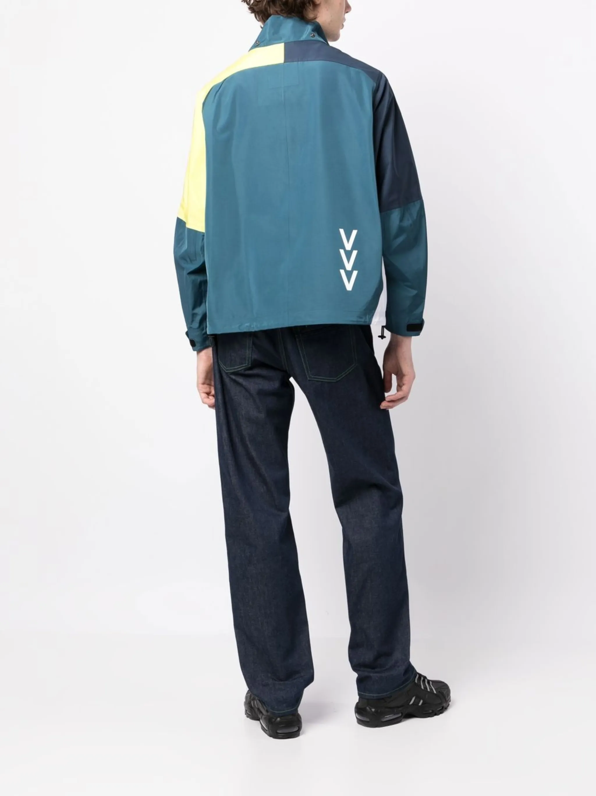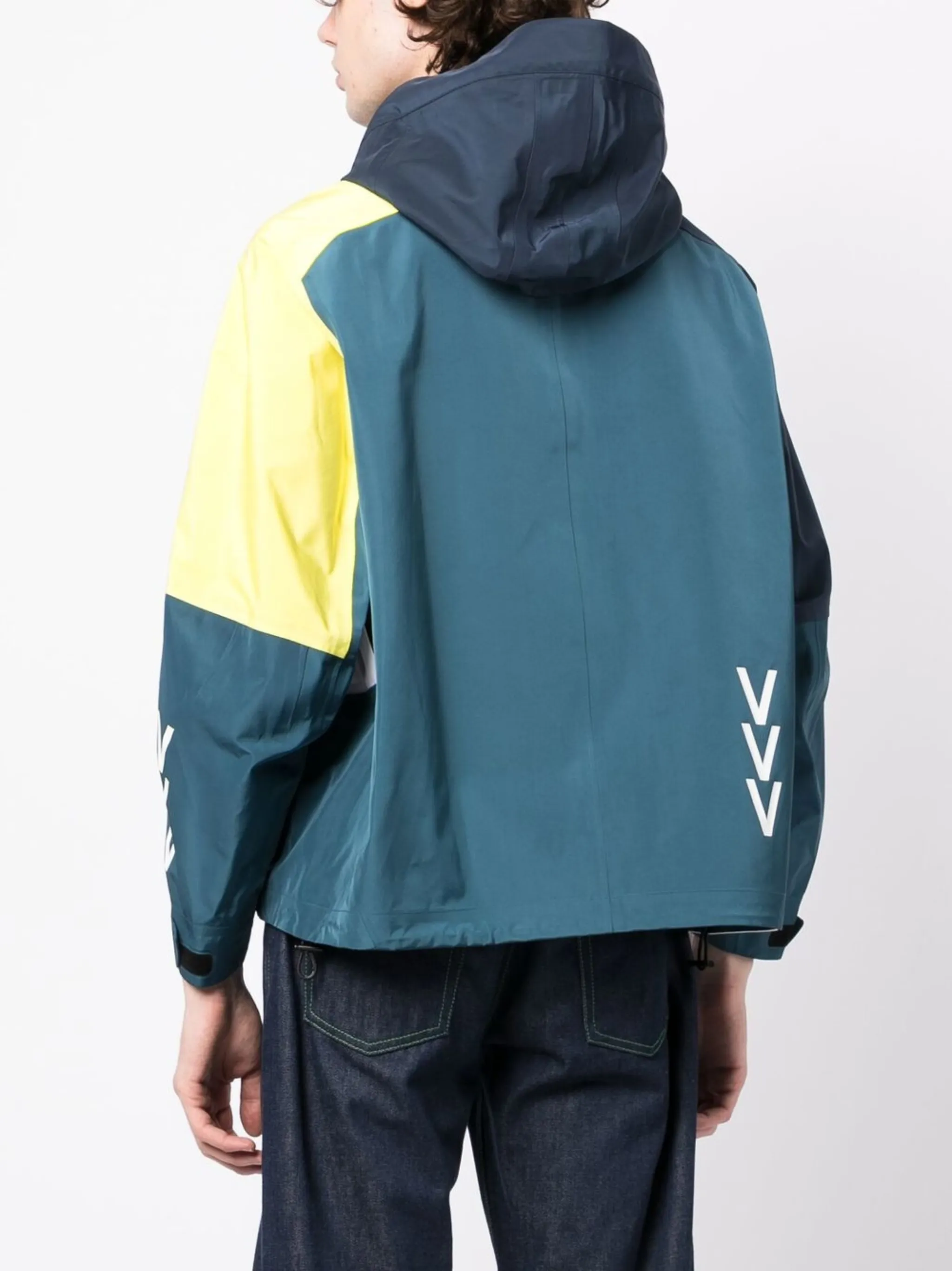 Сине-серый, деталь с молнией, проклеенные швы, логотип спереди, принт с логотипом сзади, затягивающийся на шнурок капюшон, застежка на молнии спереди, длинные рукава, манжеты на липучках, кулиска на талии и прямой подол.
