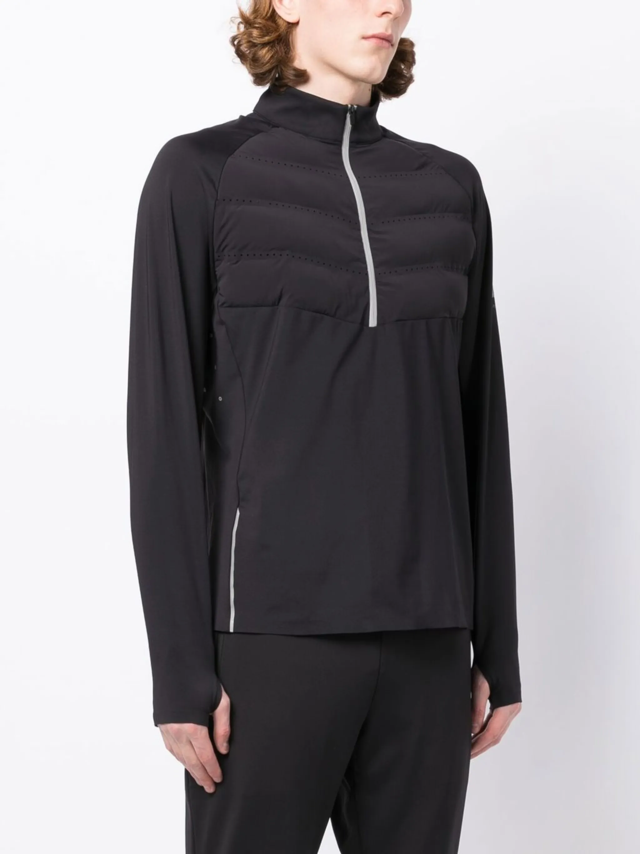 Черный/белый, логотип на дужке, воротник-труба, застежка на молнии спереди и длинные рукава.