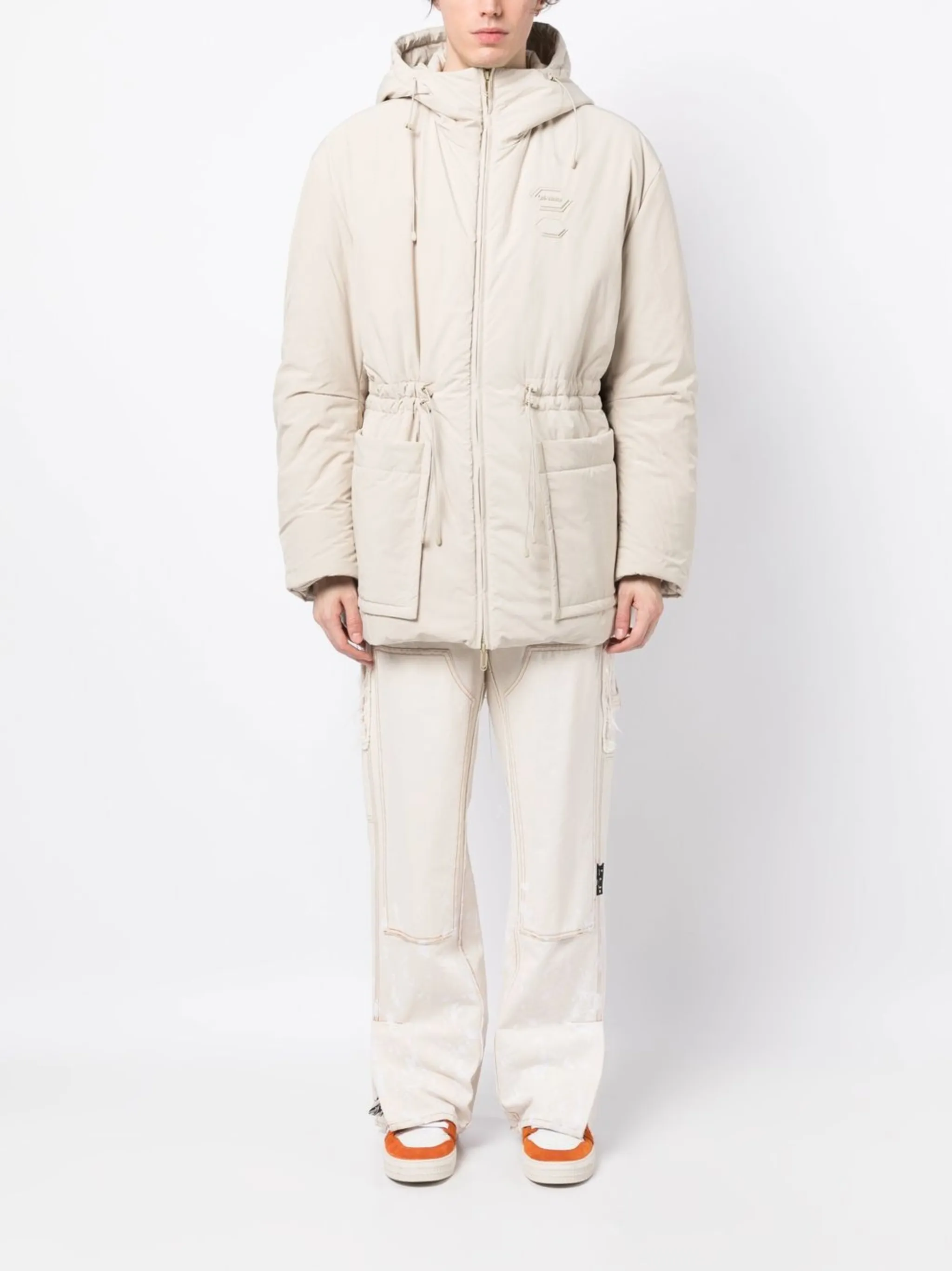 Кремовый, дутый материал, нашивка с логотипом на груди, кулиска на талии, затягивающийся на шнурок капюшон, два накладных кармана спереди, двусторонняя молния спереди, длинные рукава и прямой подол.