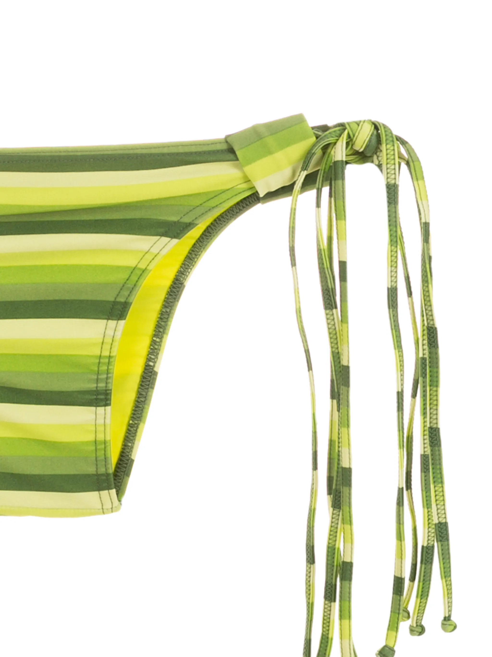 Треугольная чашка, завязки вокруг шеи, застежка на завязке сзади, принт в горизонтальную полоску, низкая посадка и завязки по бокам.