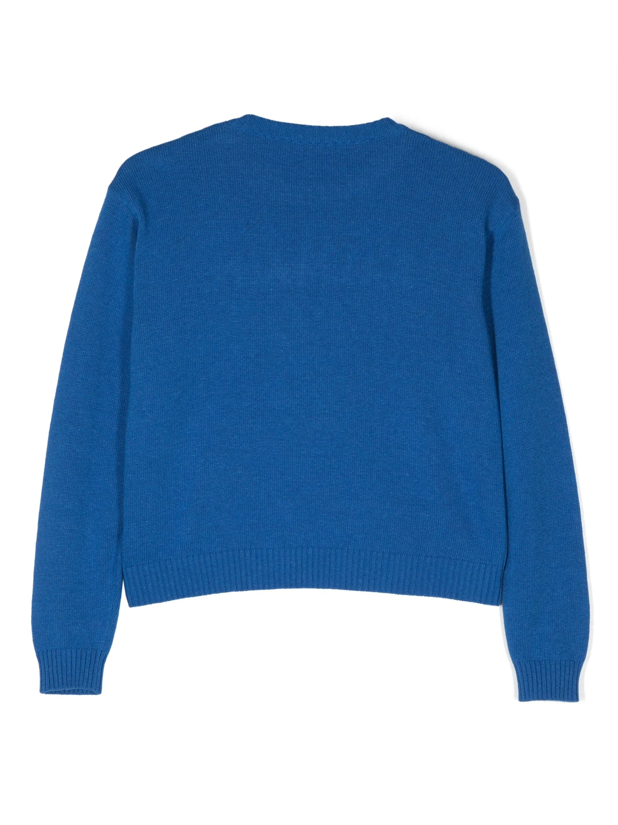 Кобальтово-синий, тонкая вязка, вязаные края в рубчик, вышитый логотип спереди, круглый вырез, пуговичные застежки на плечах, длинные рукава и прямой подол.
